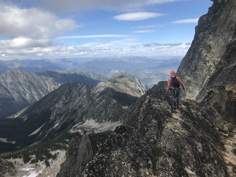 From the top as you continue on the ridge through a blocky low fifth you will see red slings for rappel below you. The terrain is quite easy to downclimb but its definitely a no fall or slip zone. One 30m rappel gets you to an easy but exposed downclimb to another rappel station; 20m more and you’re back on the ground.