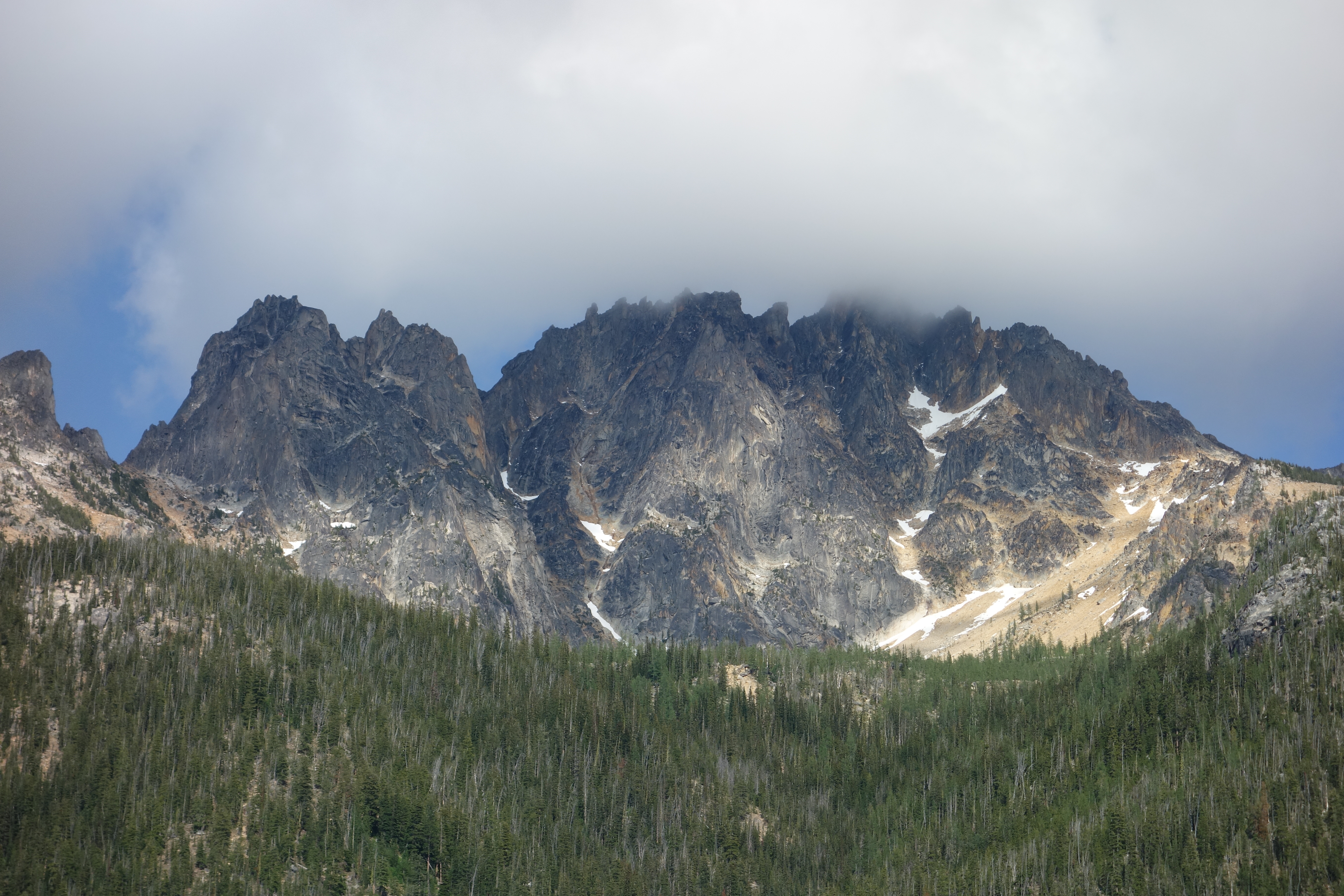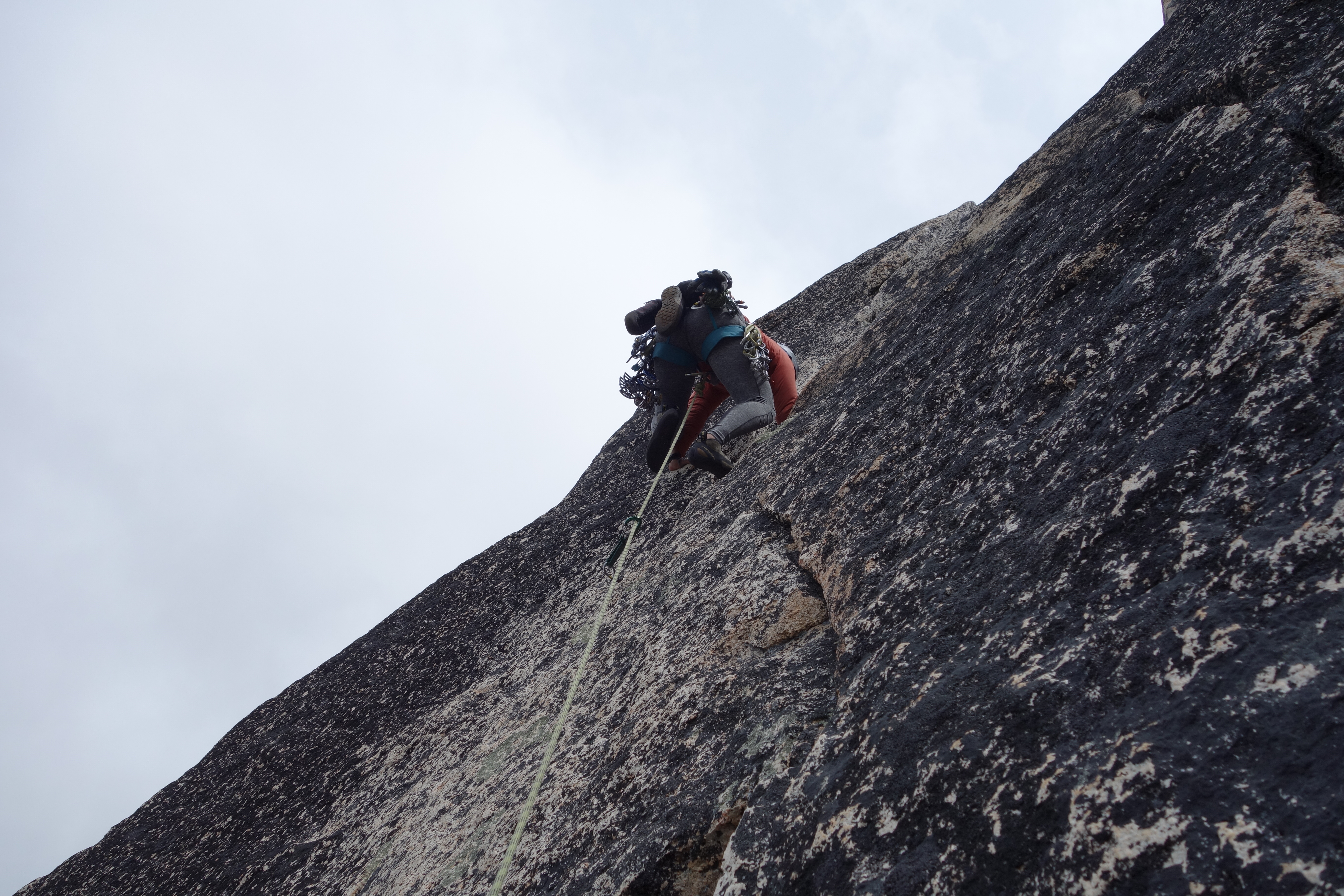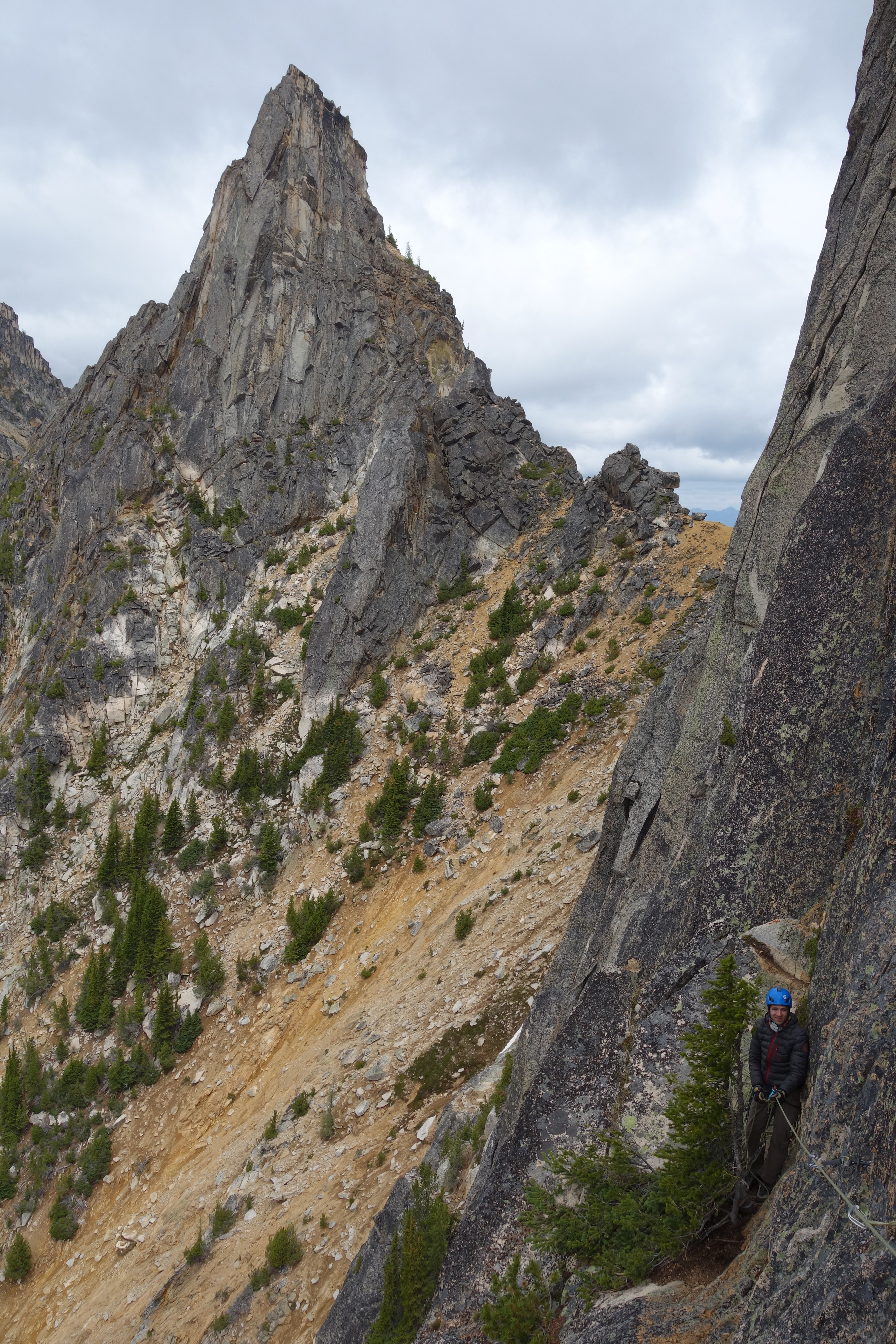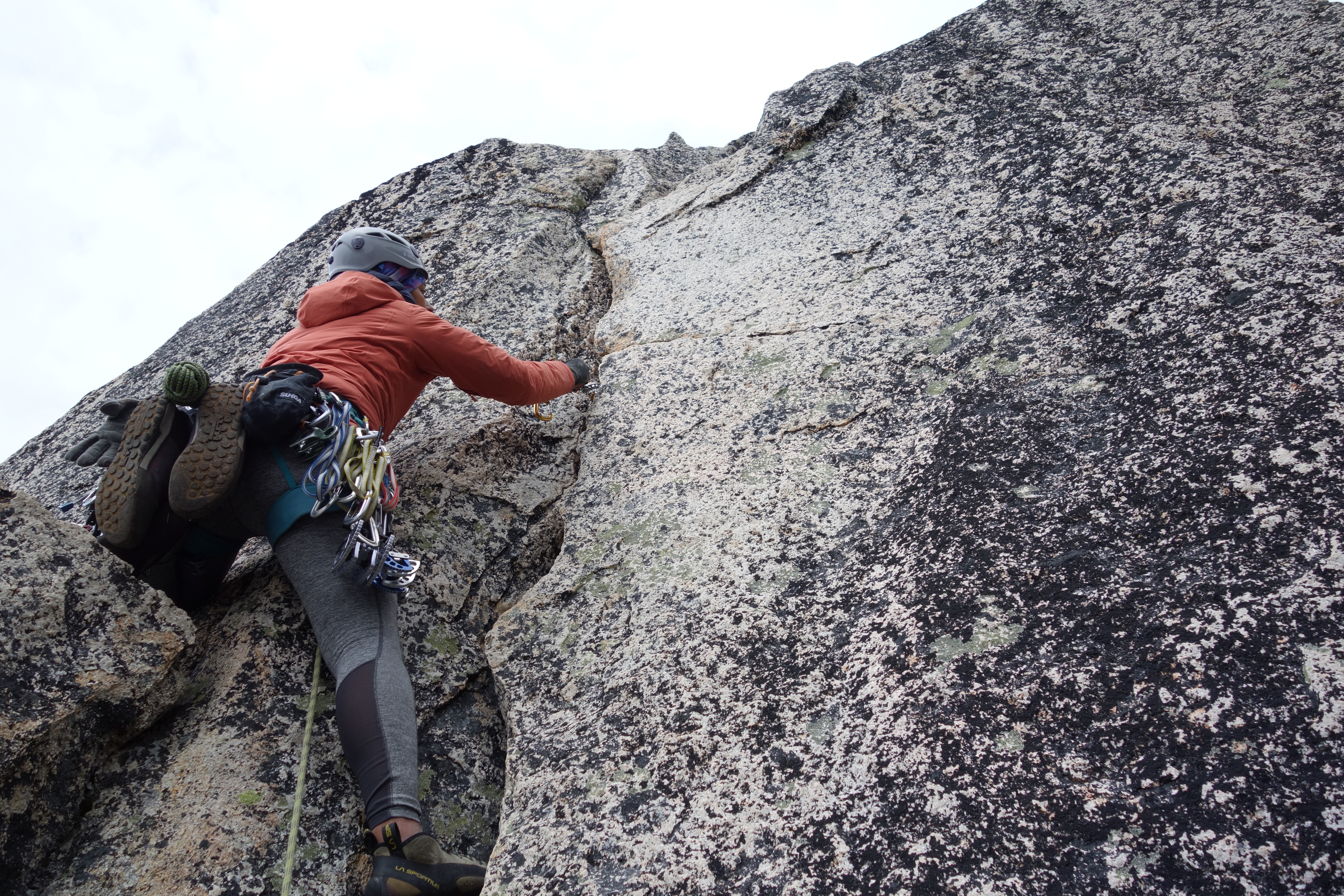 This was a fantastic climb, but the temperature hovered around 45 degrees with wind most of the day, necessitating wearing down puffies whether belaying or leading. Every time I had a feeling of suffering, I just had to turn around — the suffering was paltry in comparison to the spectacular views surrounding us and I was honored to be up there. It’s amazing just how all-encompassing the rock is as you drive into Washington Pass; I can’t wait to be up there again.