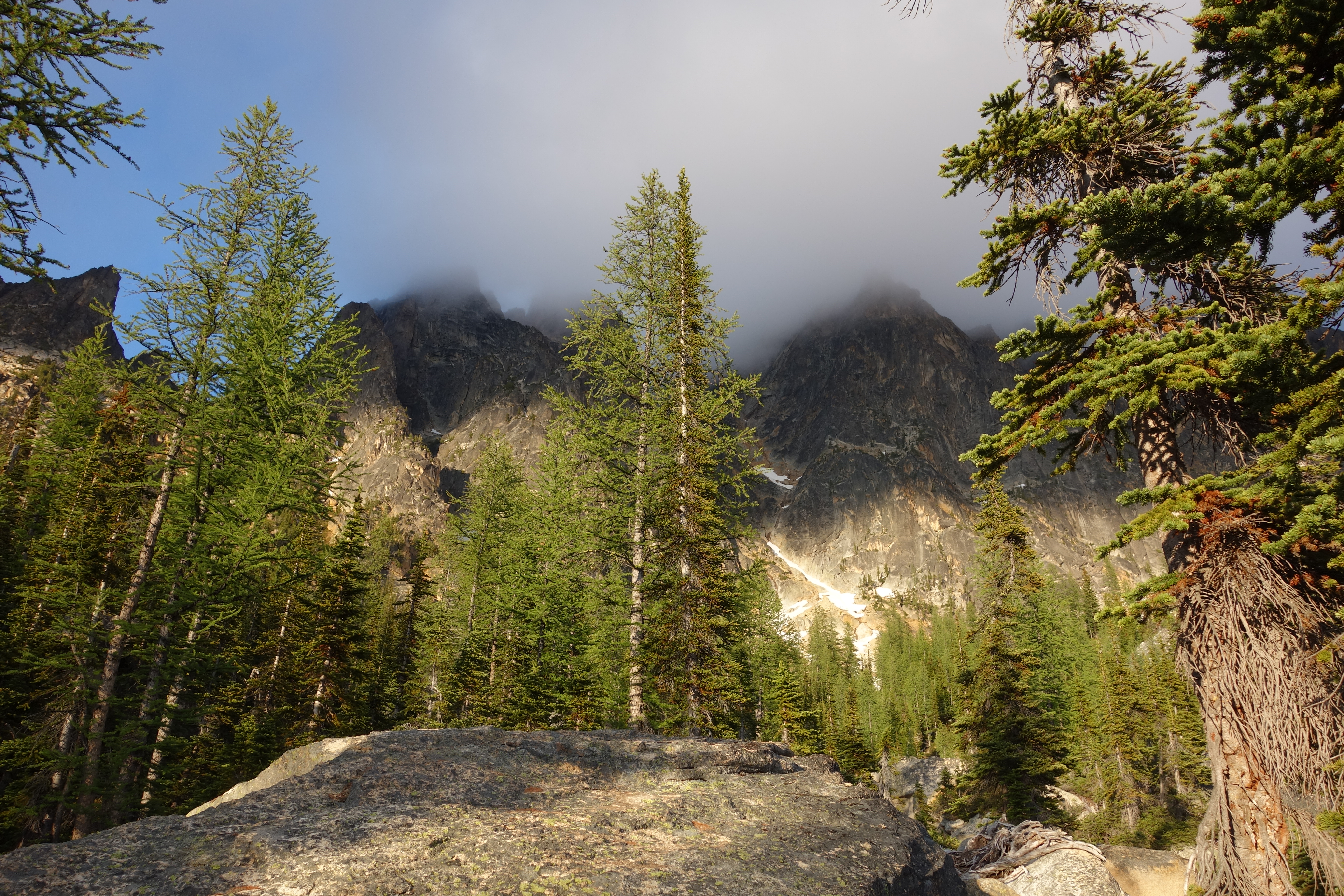 The next morning we were up at 5 am to chilly conditions and cloud-wreathed towers. Figuring we had plenty of time considering most the approach was done, we lingered until 6:30 am and then began the trek up to the base of the climb.
