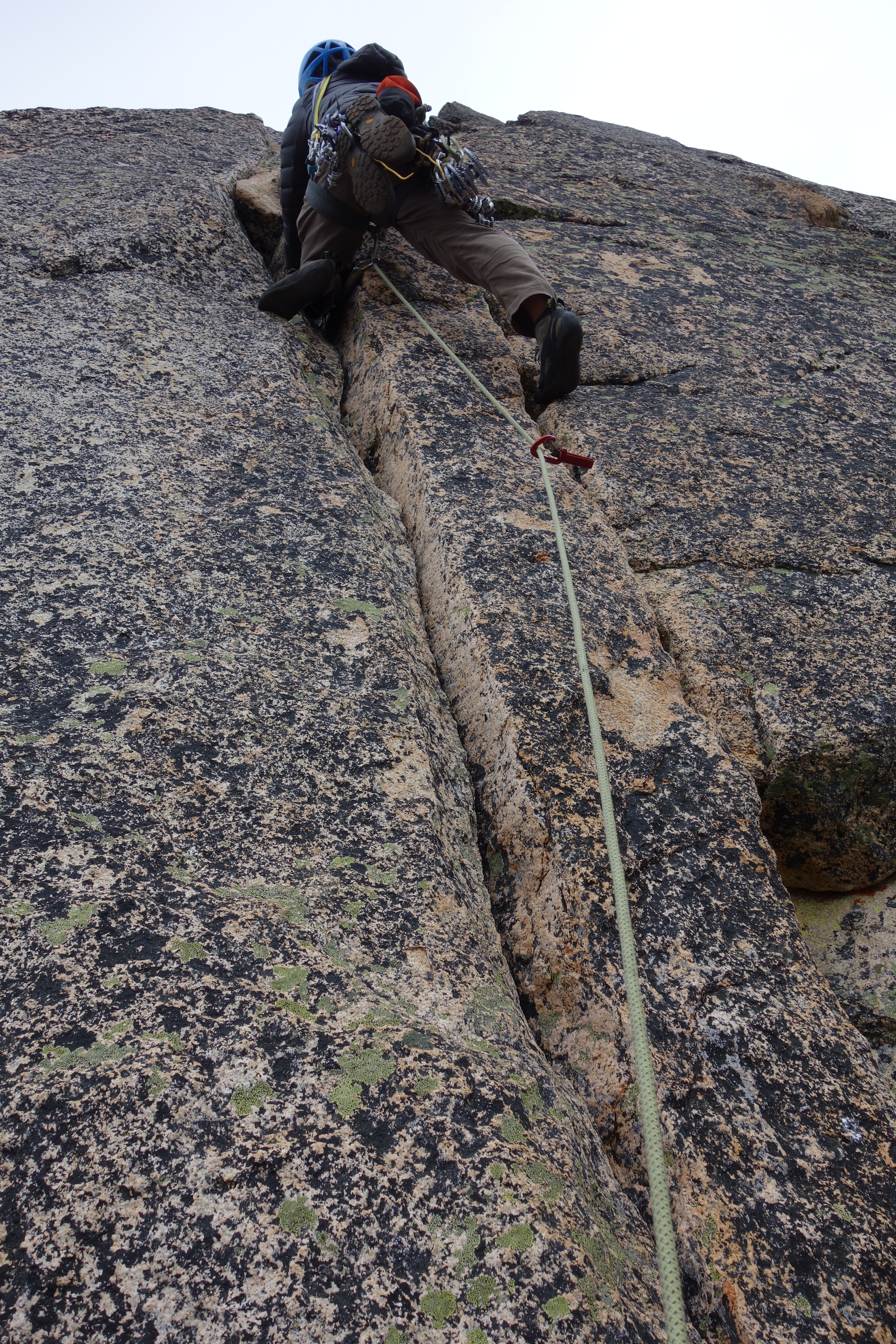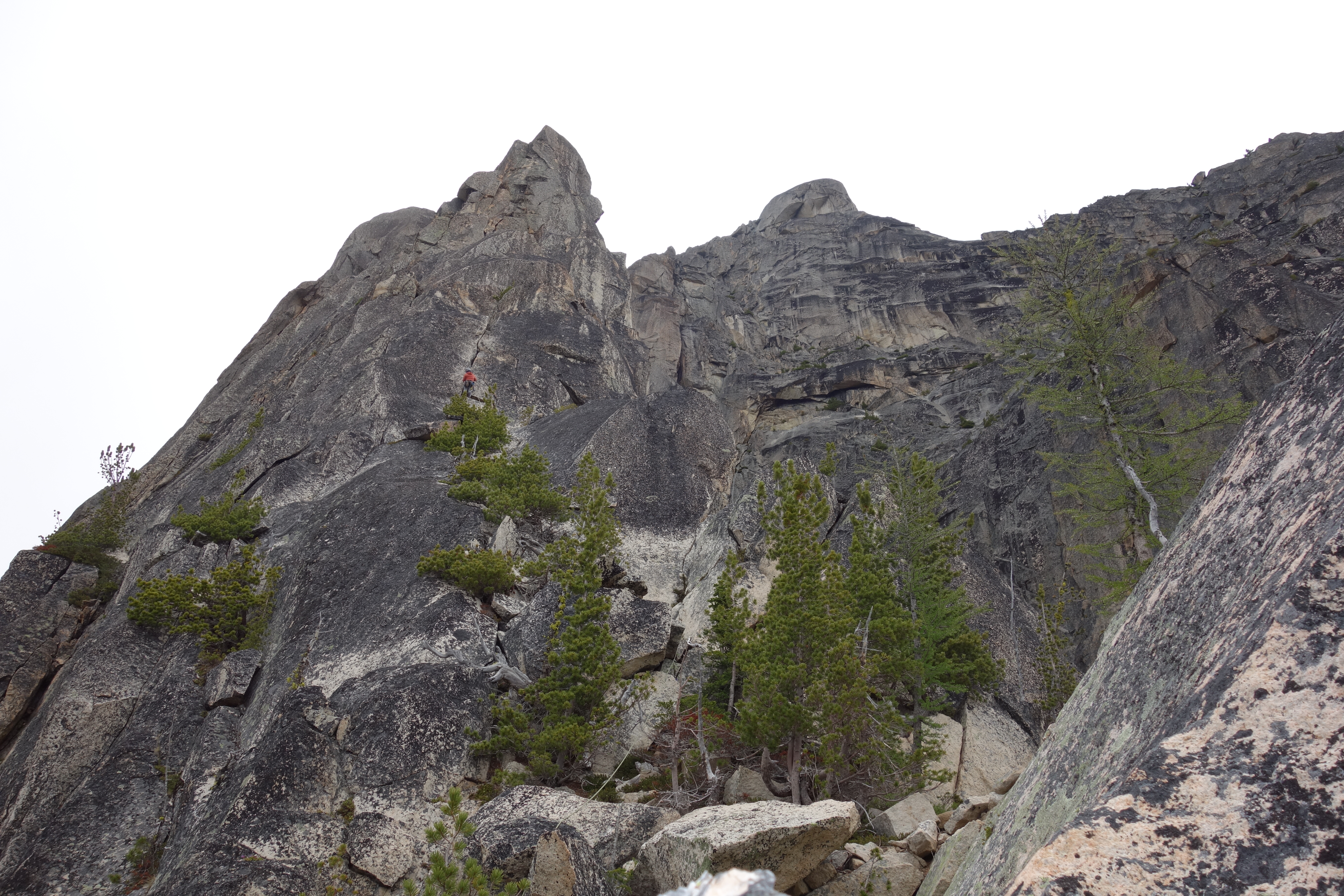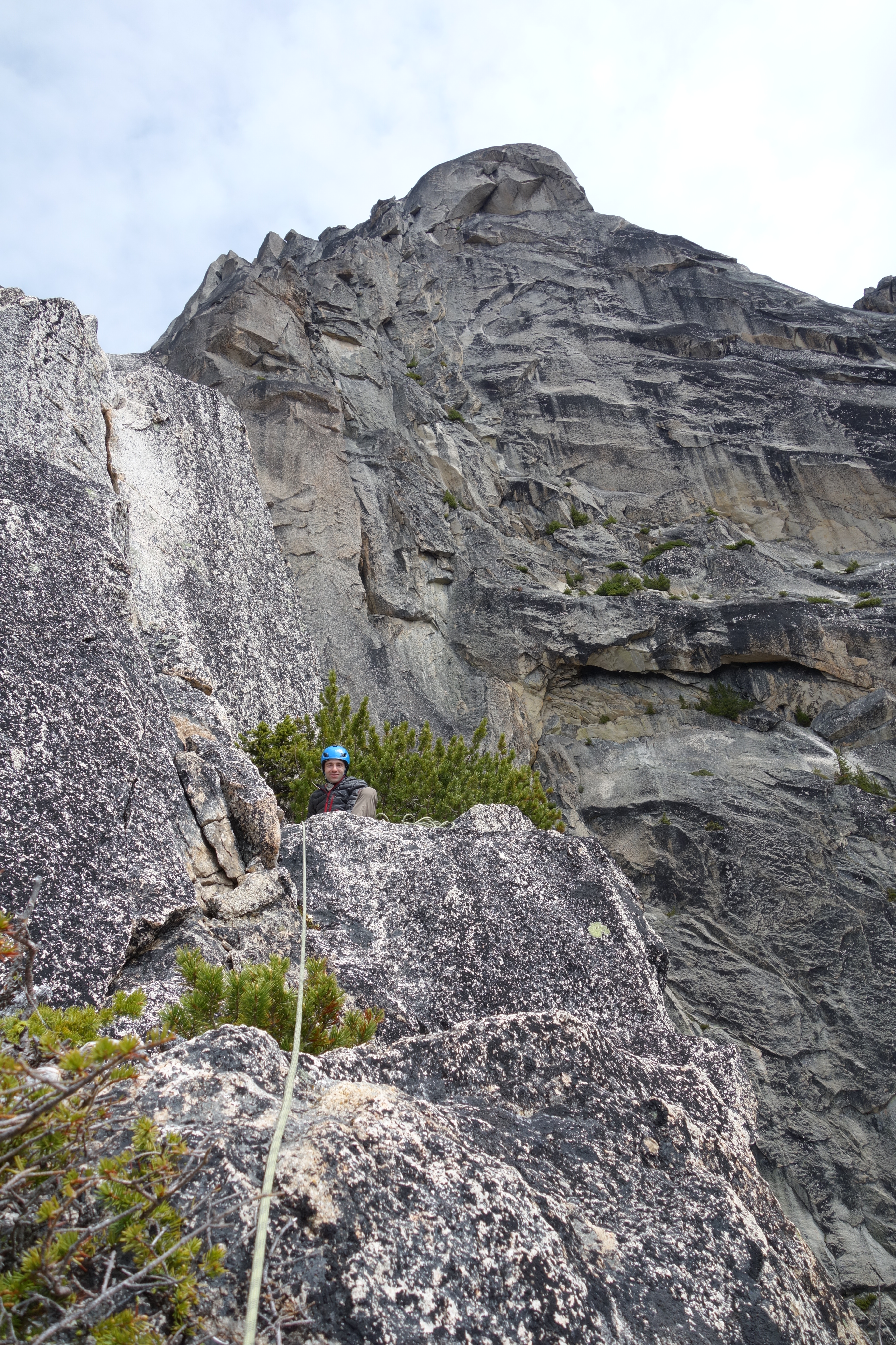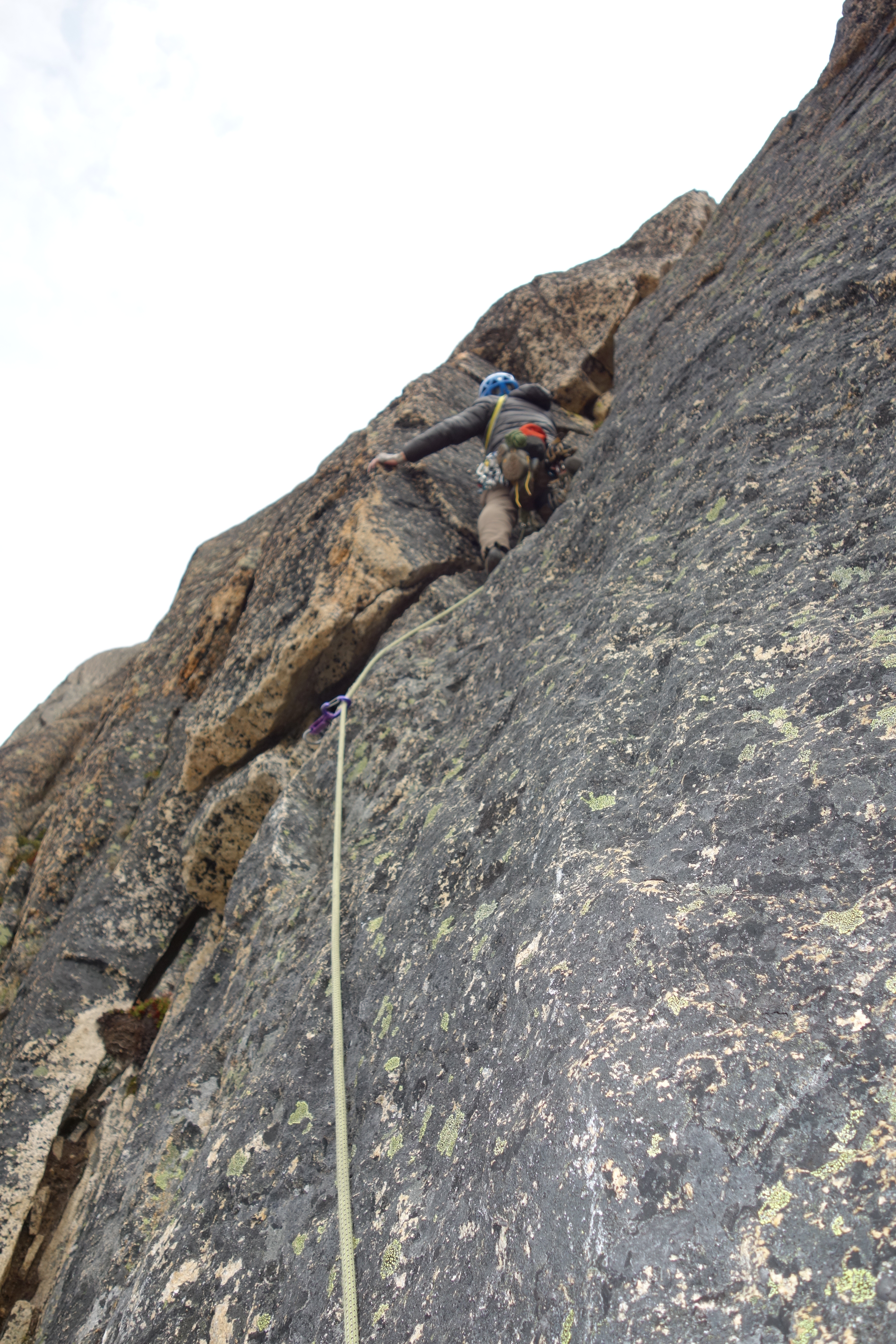 From here was another 5.8 pitch with a few moves of layback crux off the belay followed by fun wide climbing. After the crack turned horizontal the route turned into fun low fifth jams up to an expansive belay ledge with trees, where we finally got a few minutes of sunshine through thin clouds.