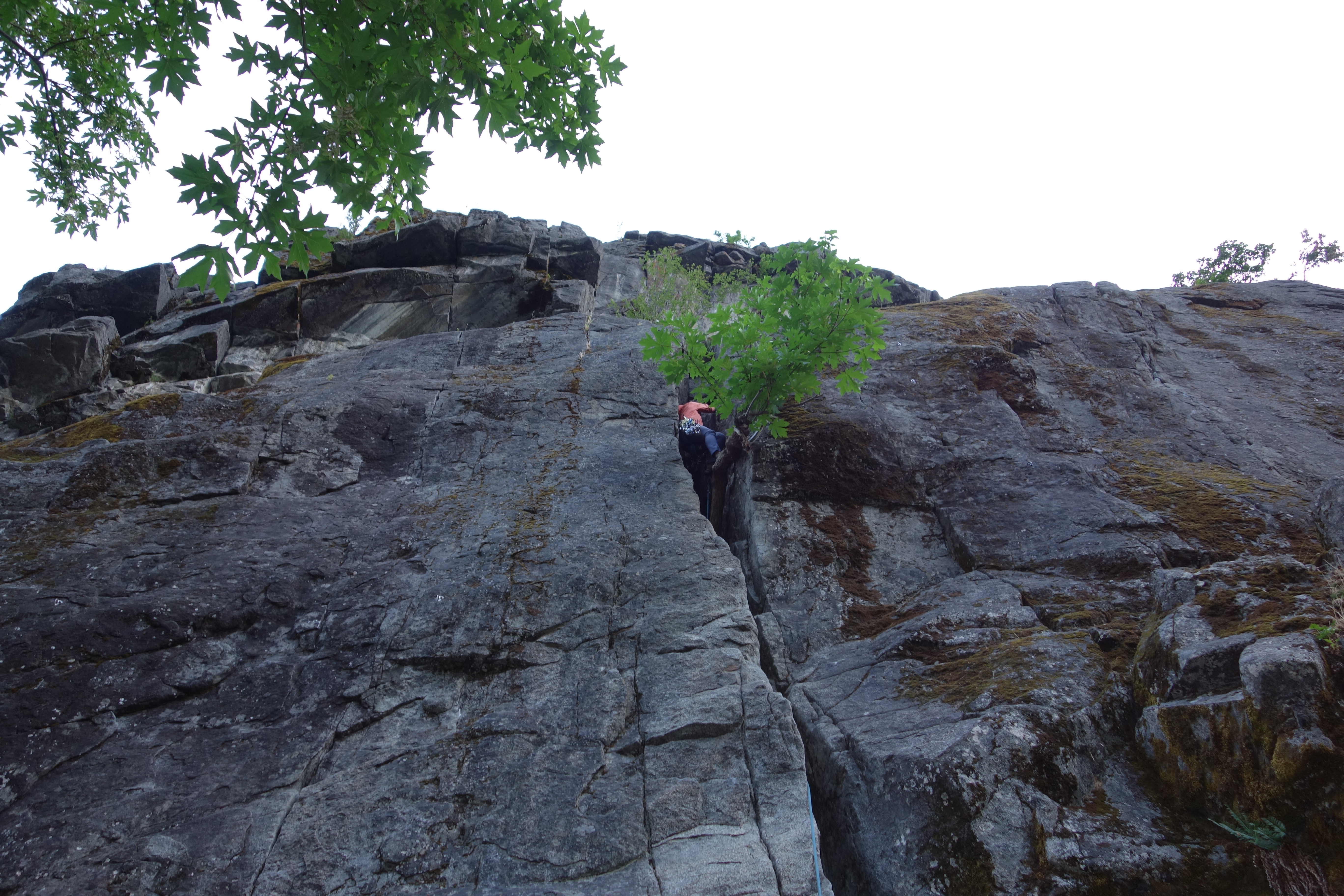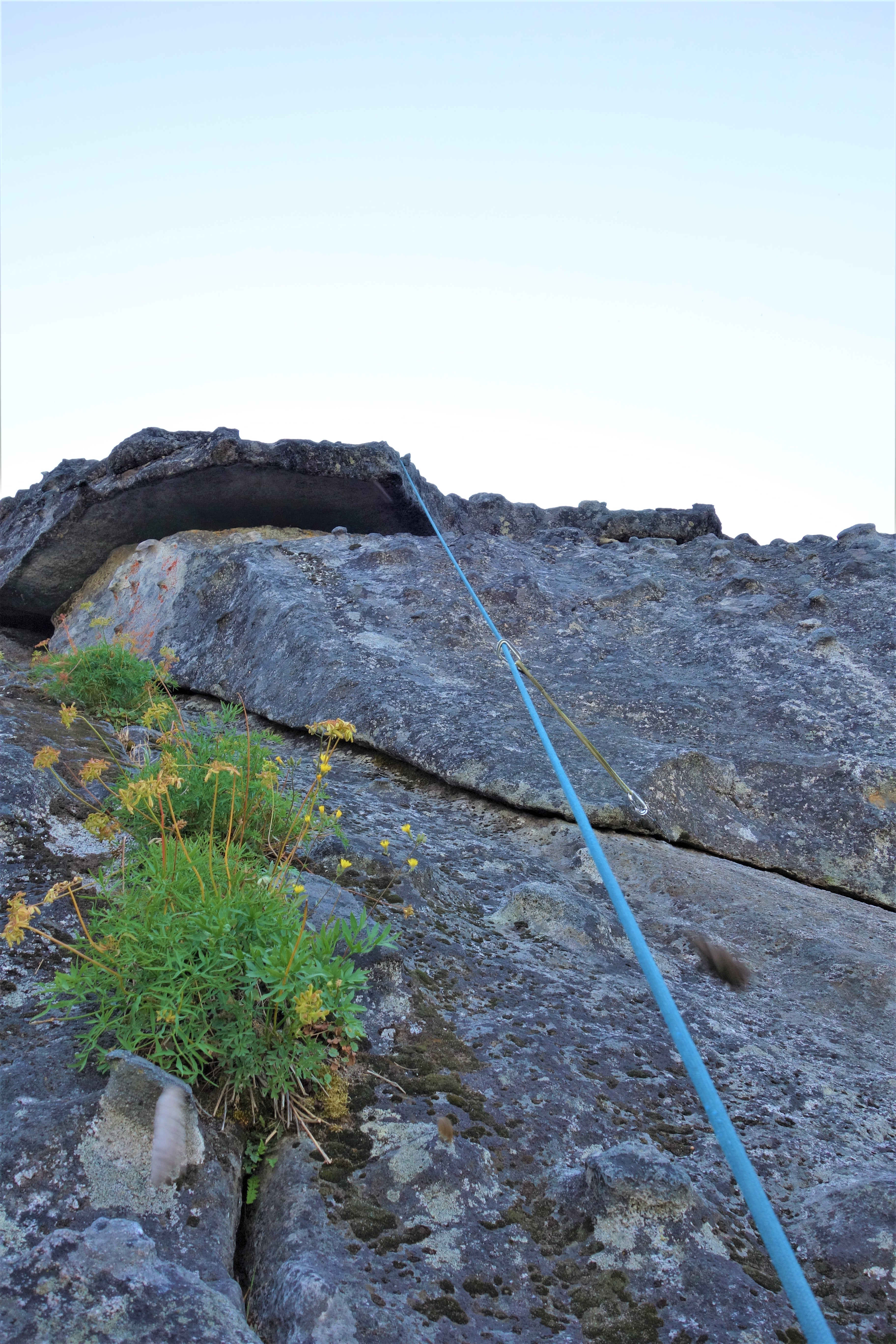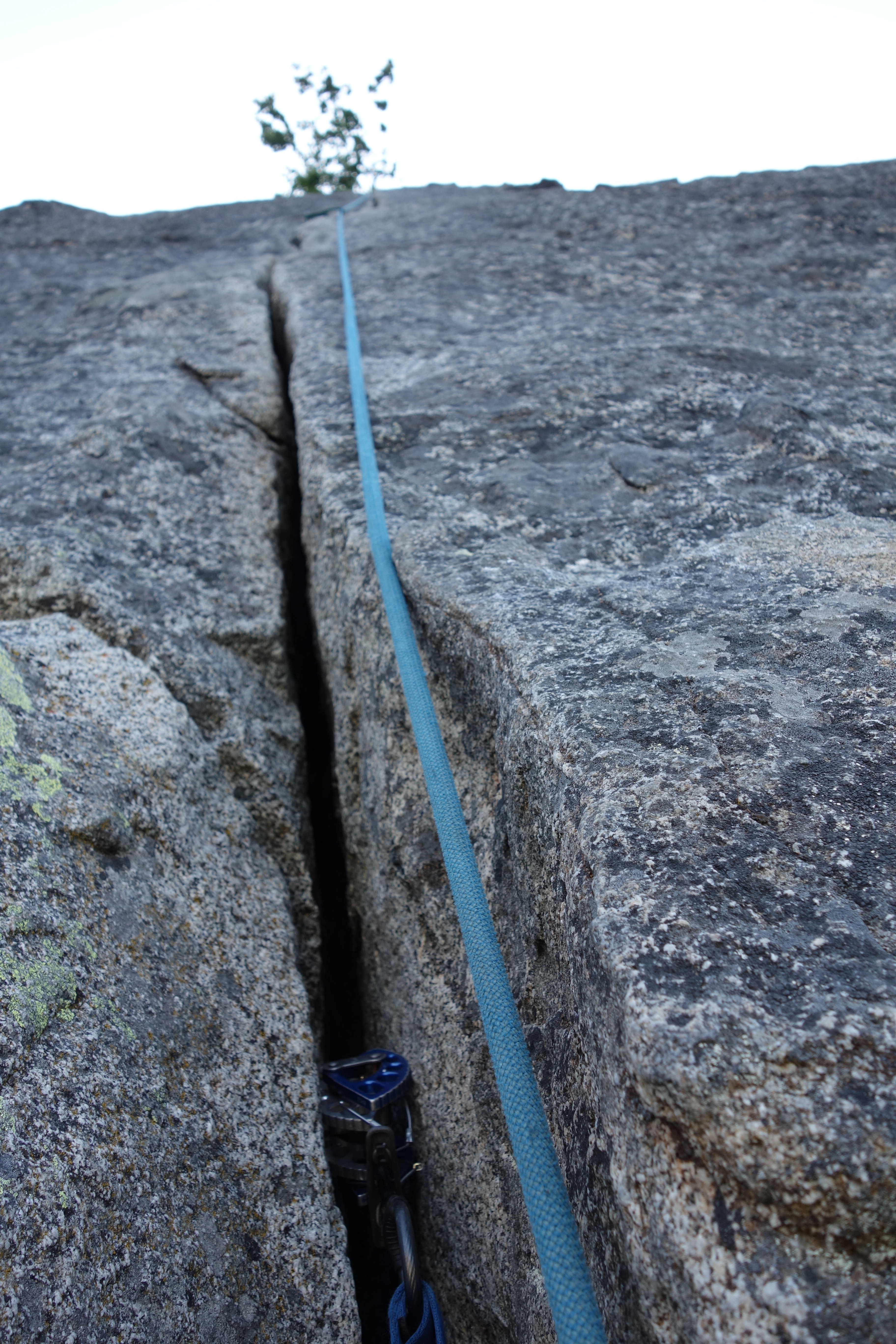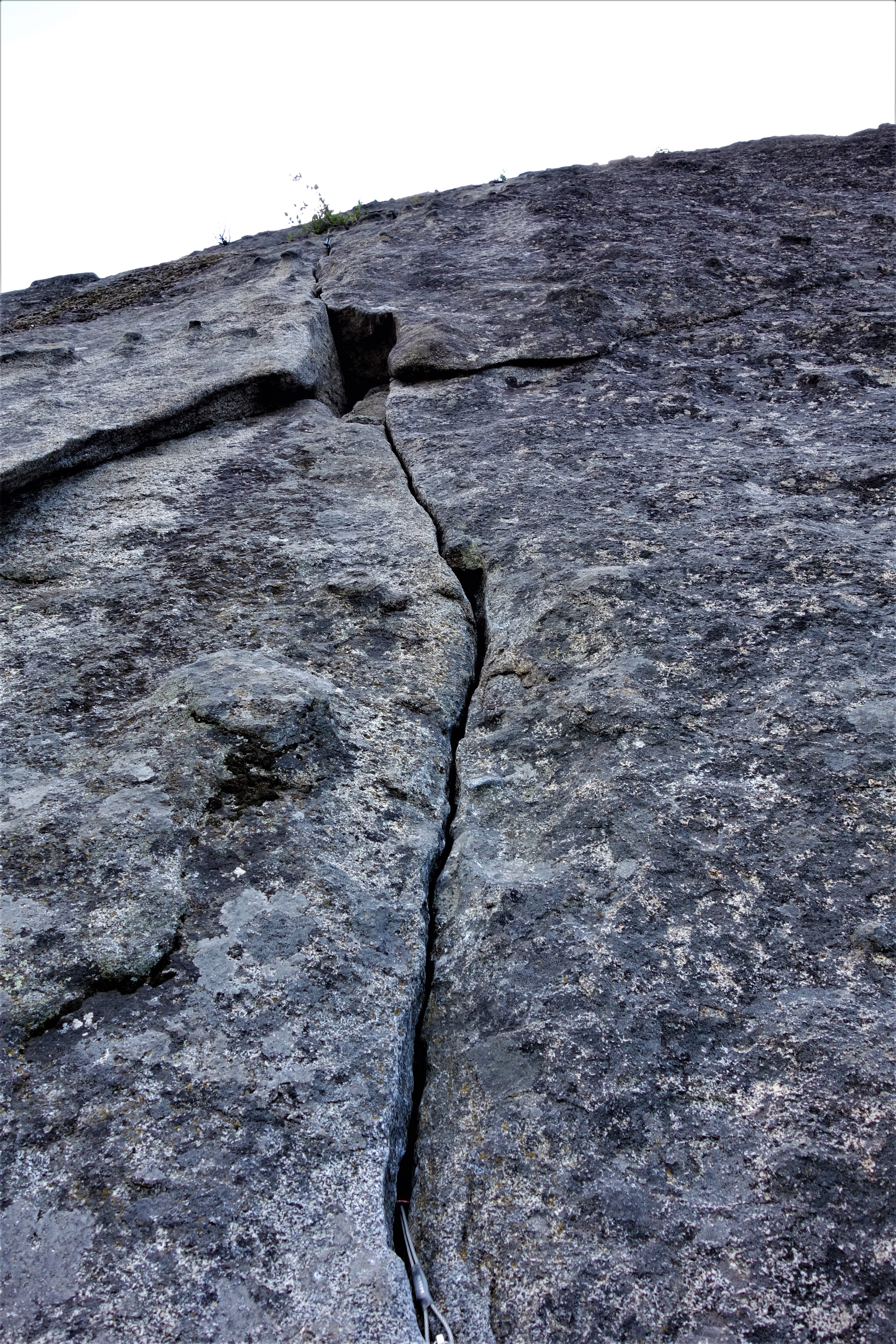 Pitch six had strenuous finger locks to get off the deck and remains a finger crack for a few moves, then it’s a wavy hand crack all the way to the summit. A 70 meter rope will just get you from the belay at the top of pitch five to a #1/#2 crack under a boulder on the summit.