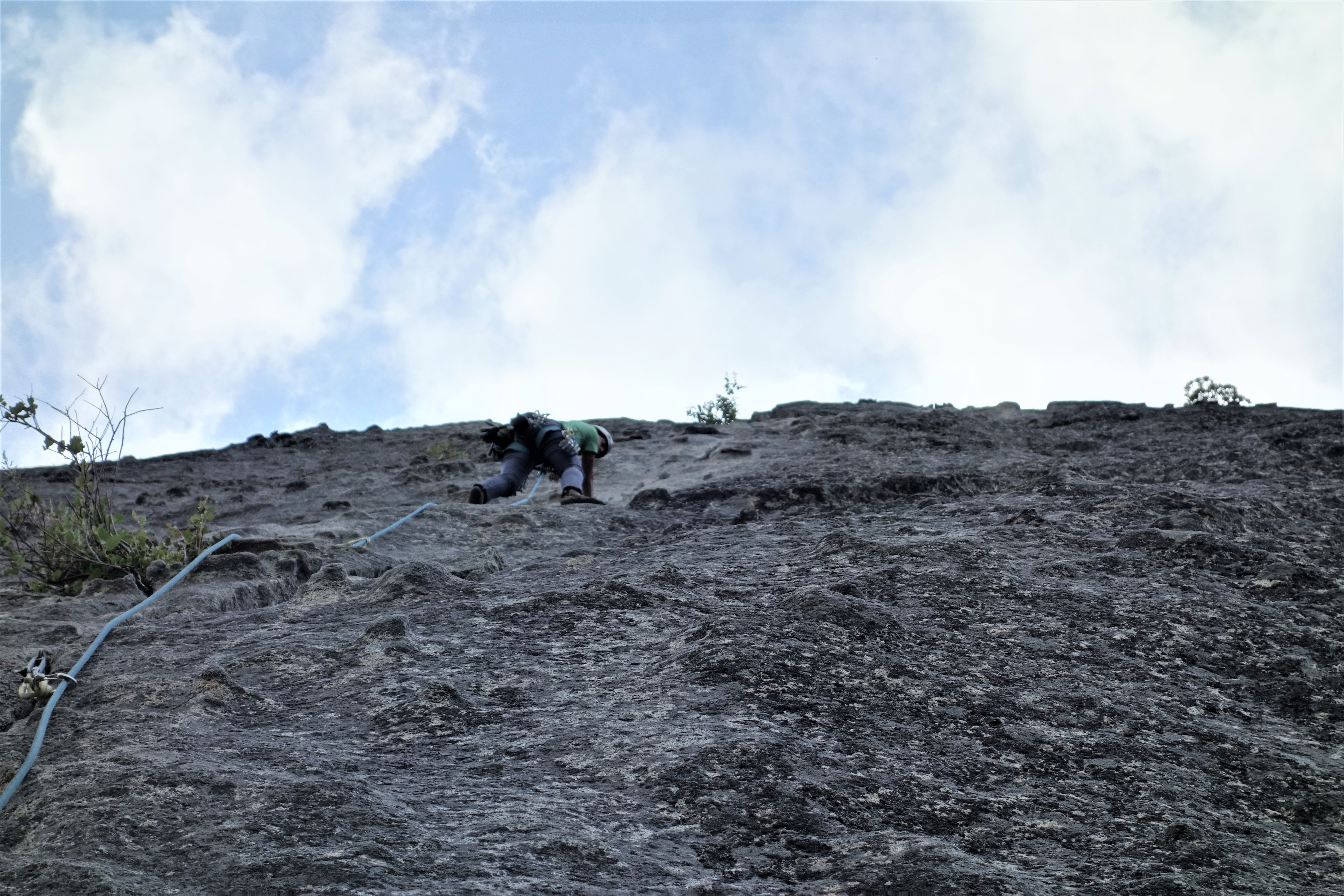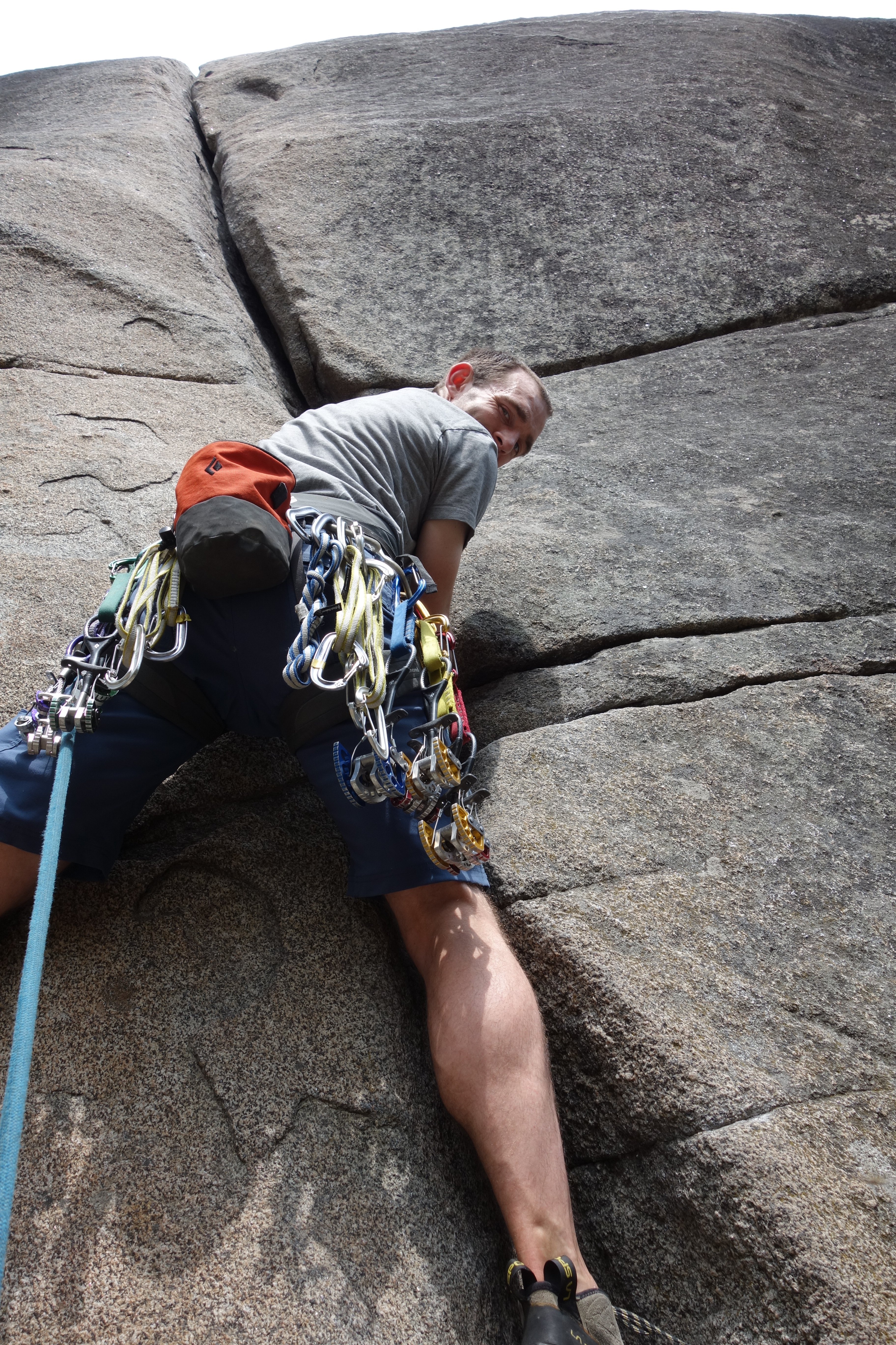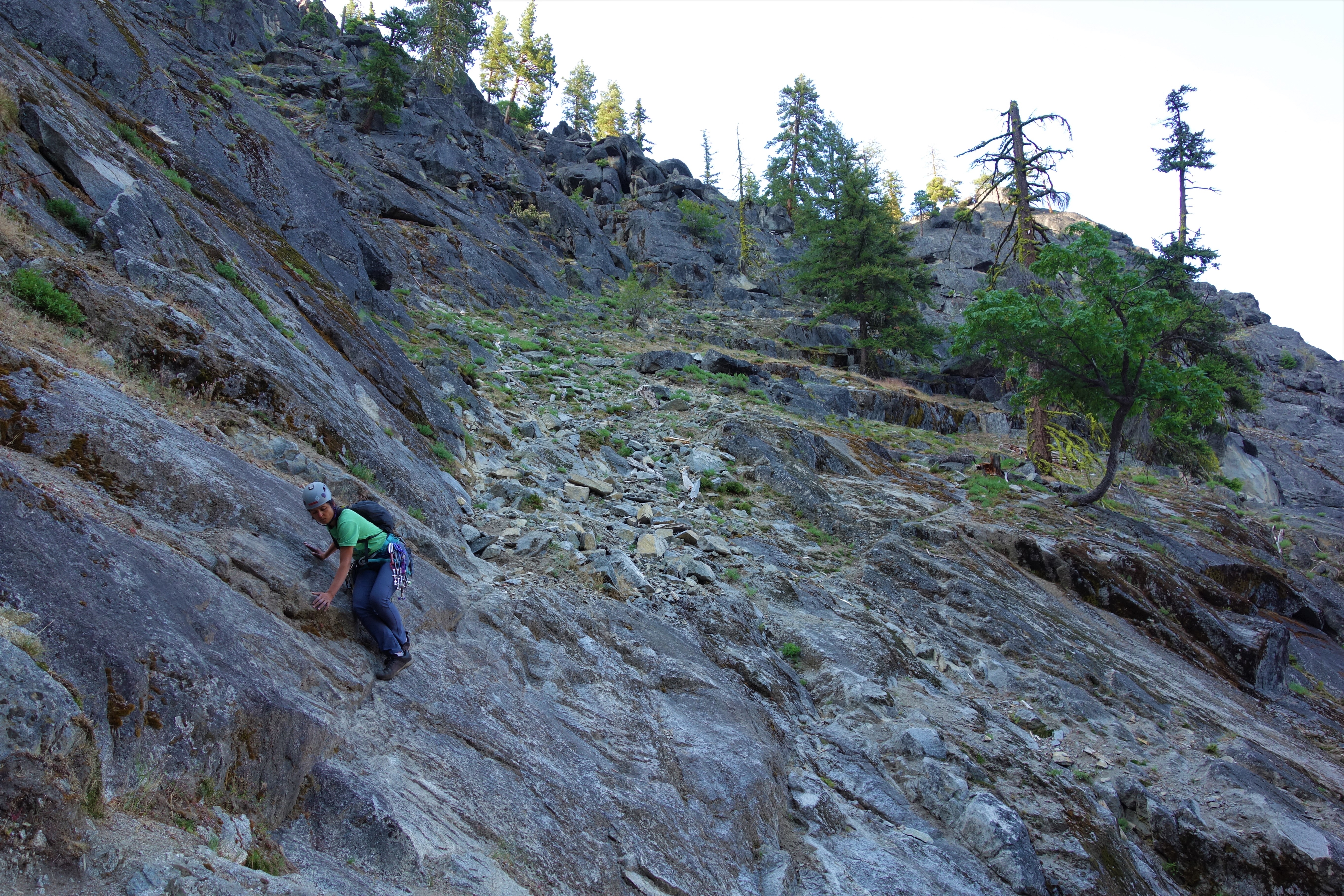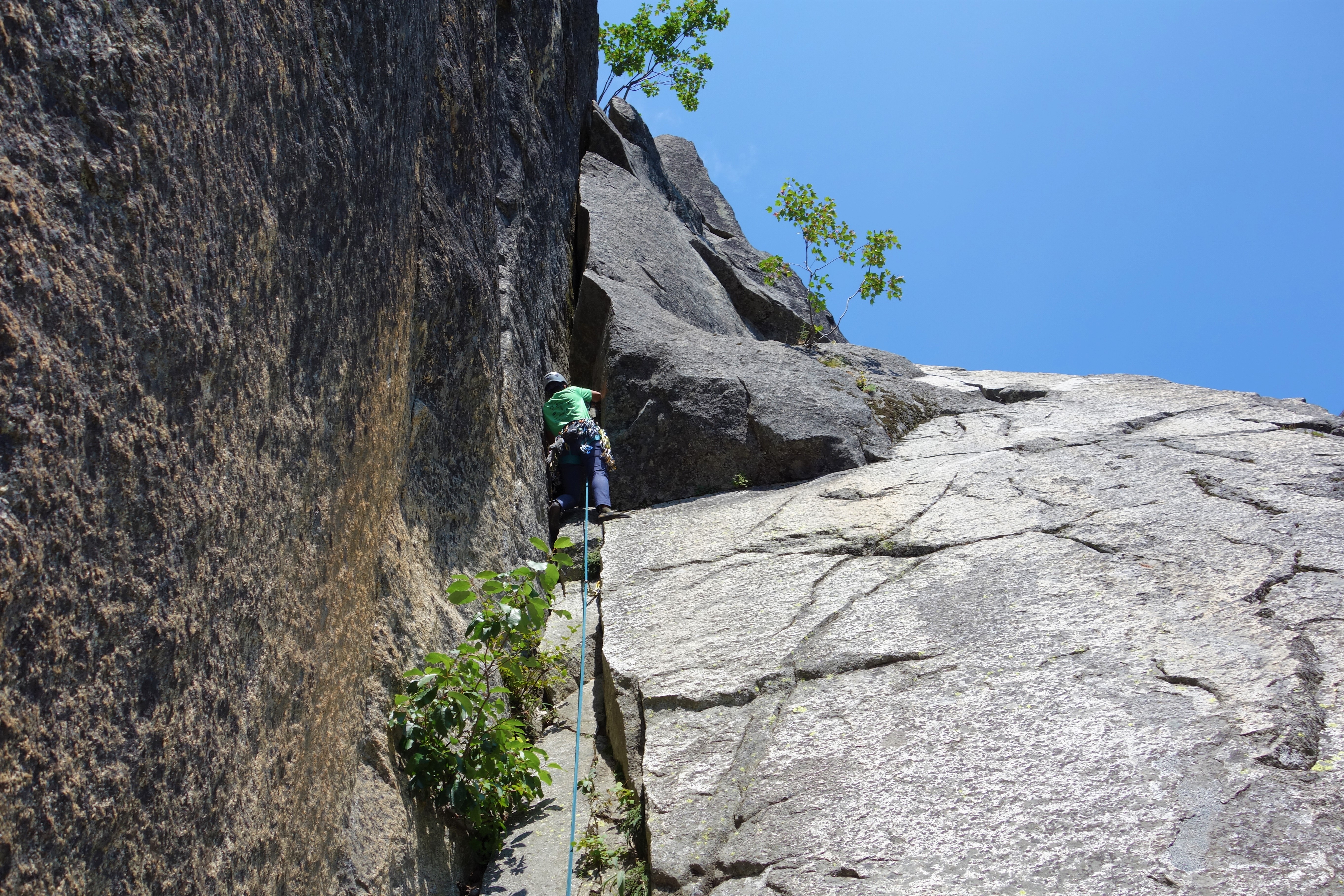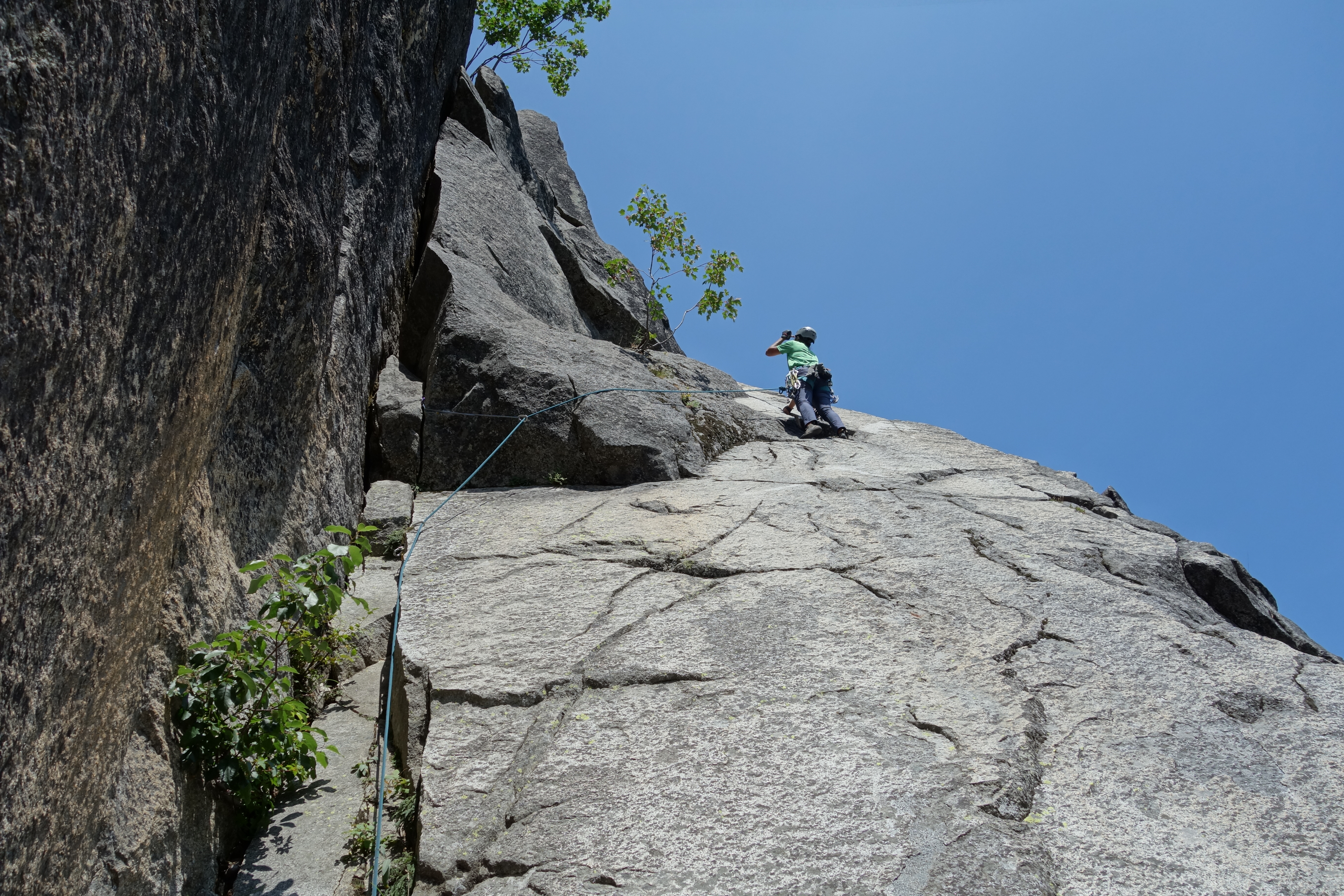 I felt pitch three was the crux of this climb: welcome to diagonal cracks. The first 20-25 feet were easy but the diagonal crack section was extremely exposed with good hand jams and tiny edges for feet. Fortunately some practice on mixed slab climbing on Friday helped to boost my confidence for this pitch.