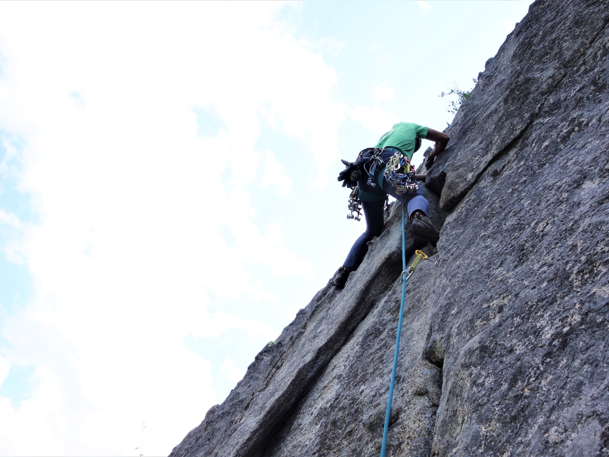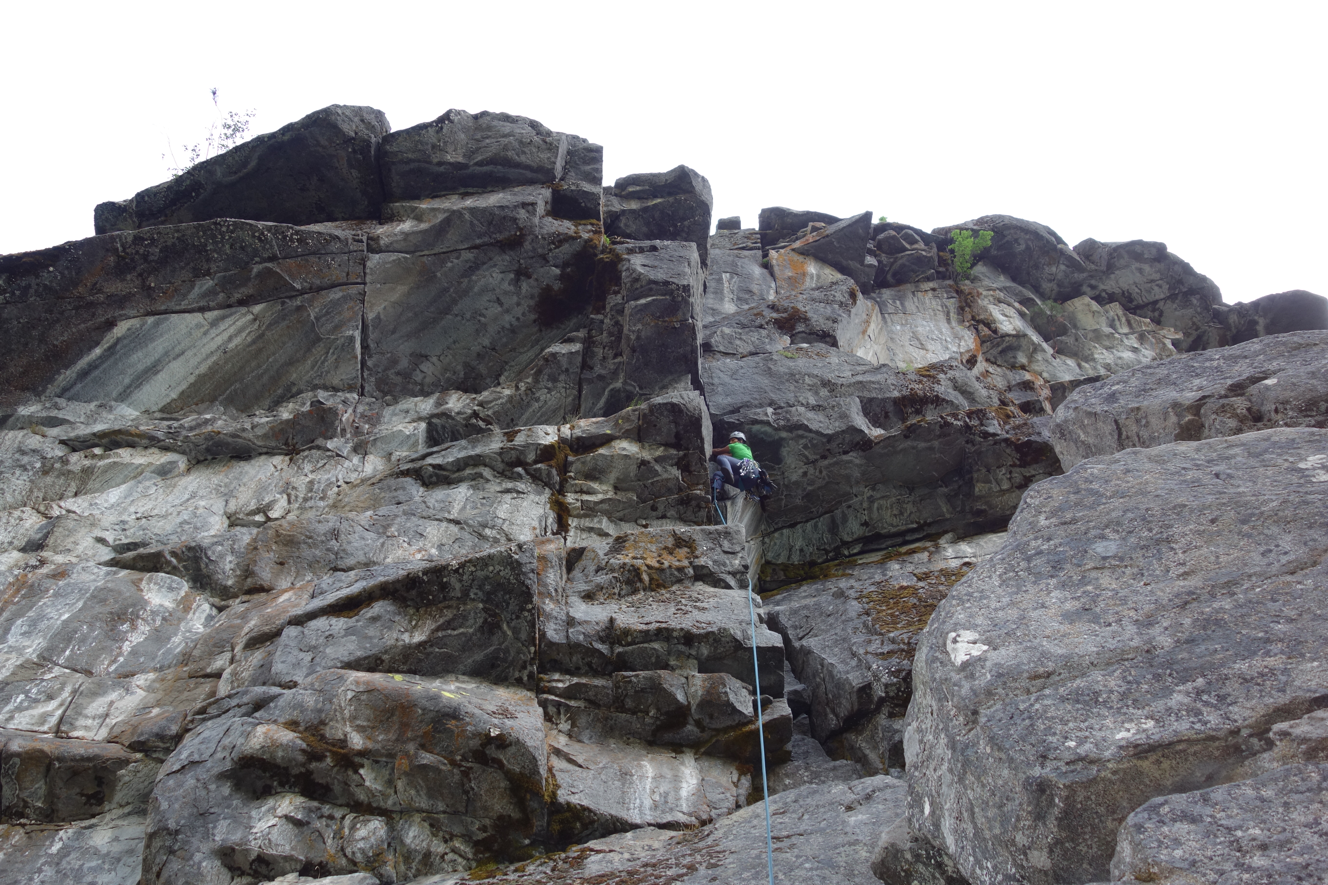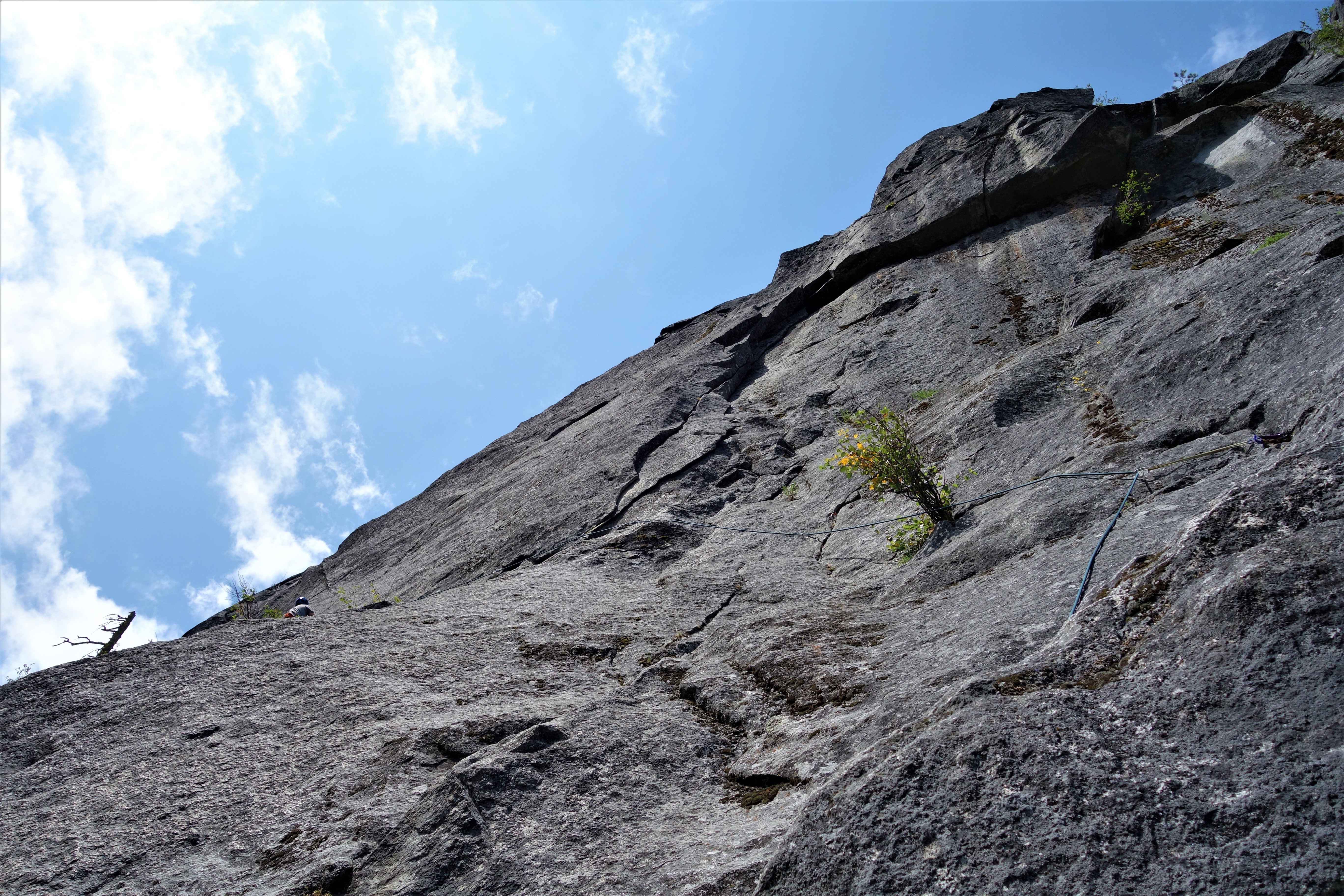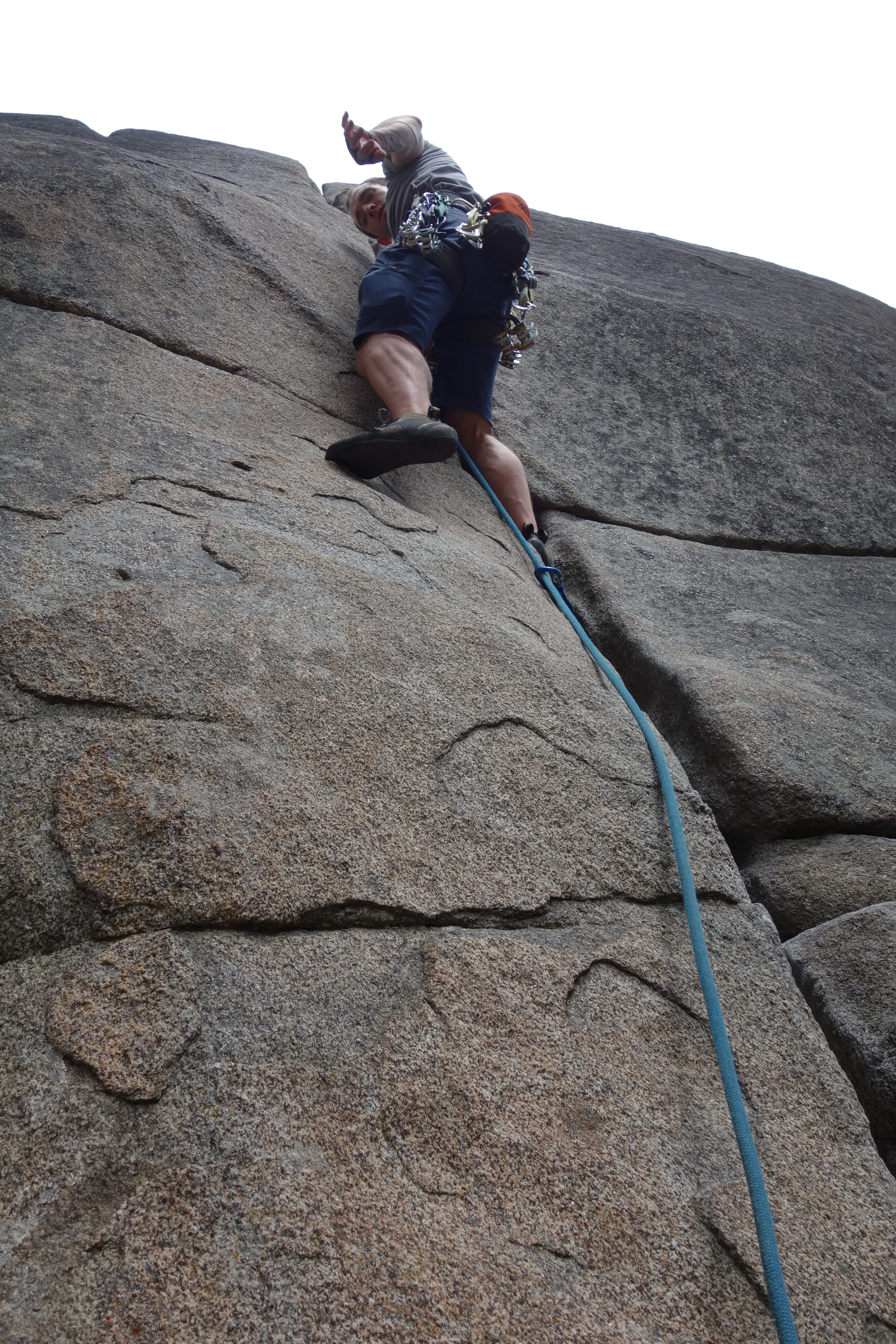 I felt pitch three was the crux of this climb: welcome to diagonal cracks. The first 20-25 feet were easy but the diagonal crack section was extremely exposed with good hand jams and tiny edges for feet. Fortunately some practice on mixed slab climbing on Friday helped to boost my confidence for this pitch.
