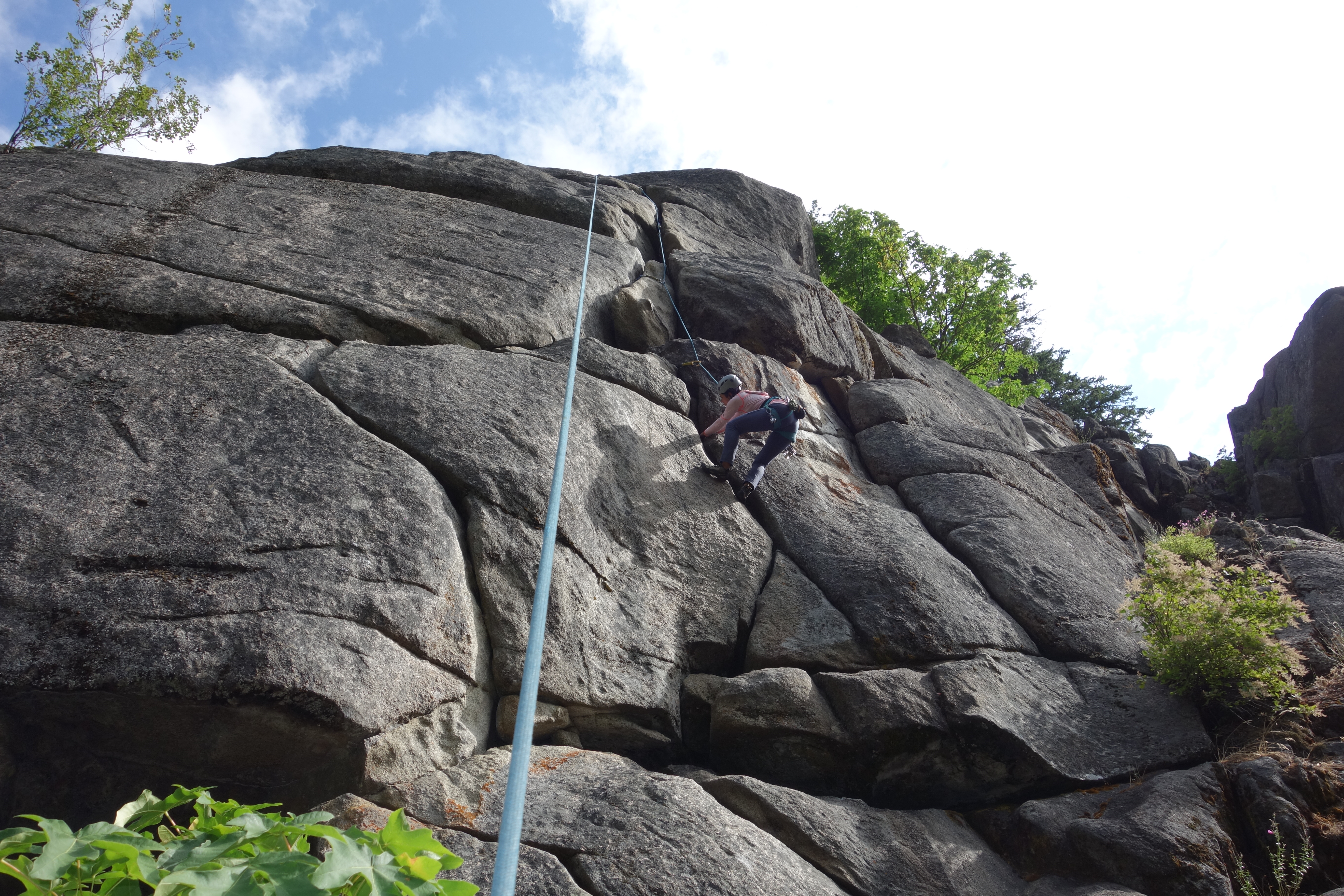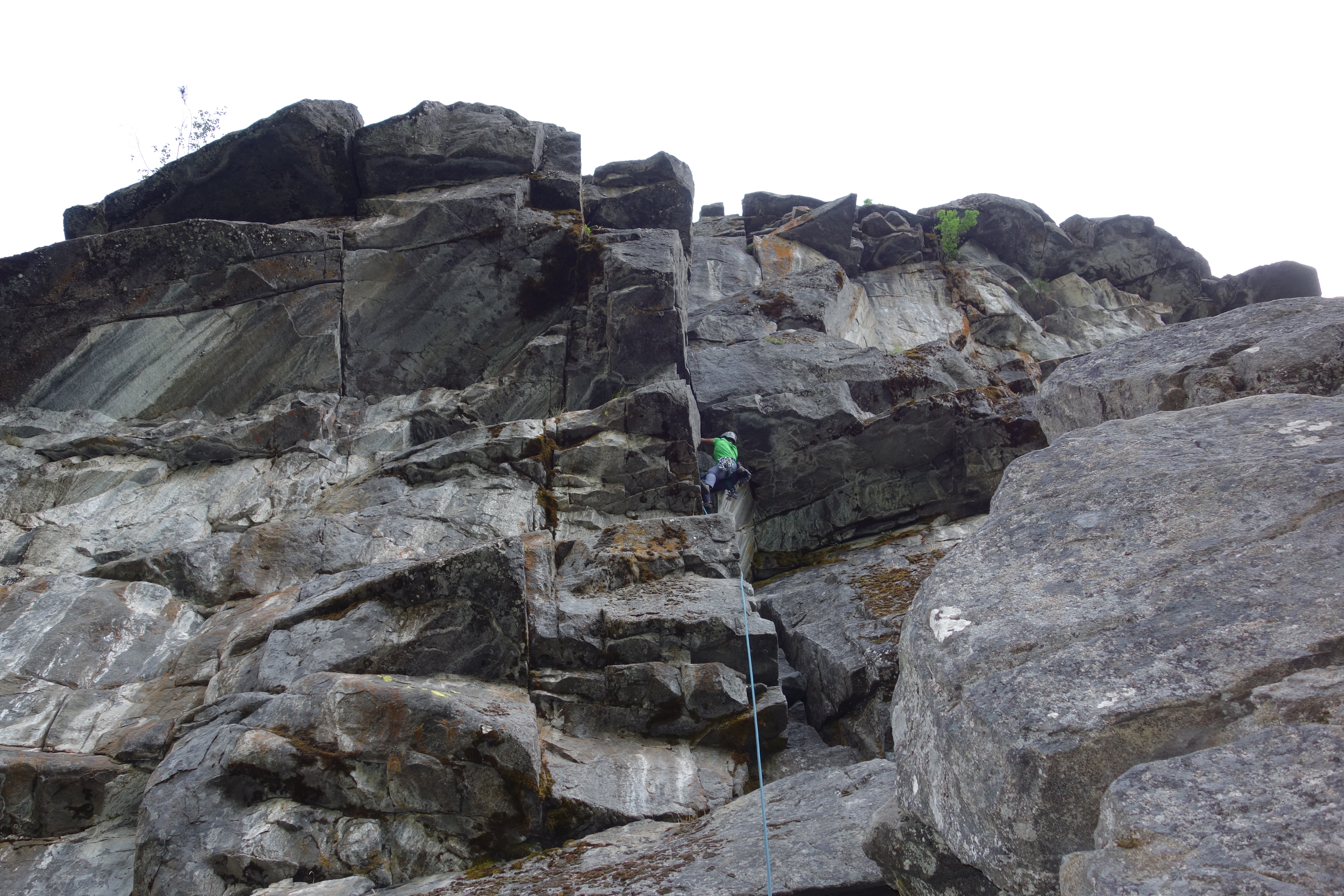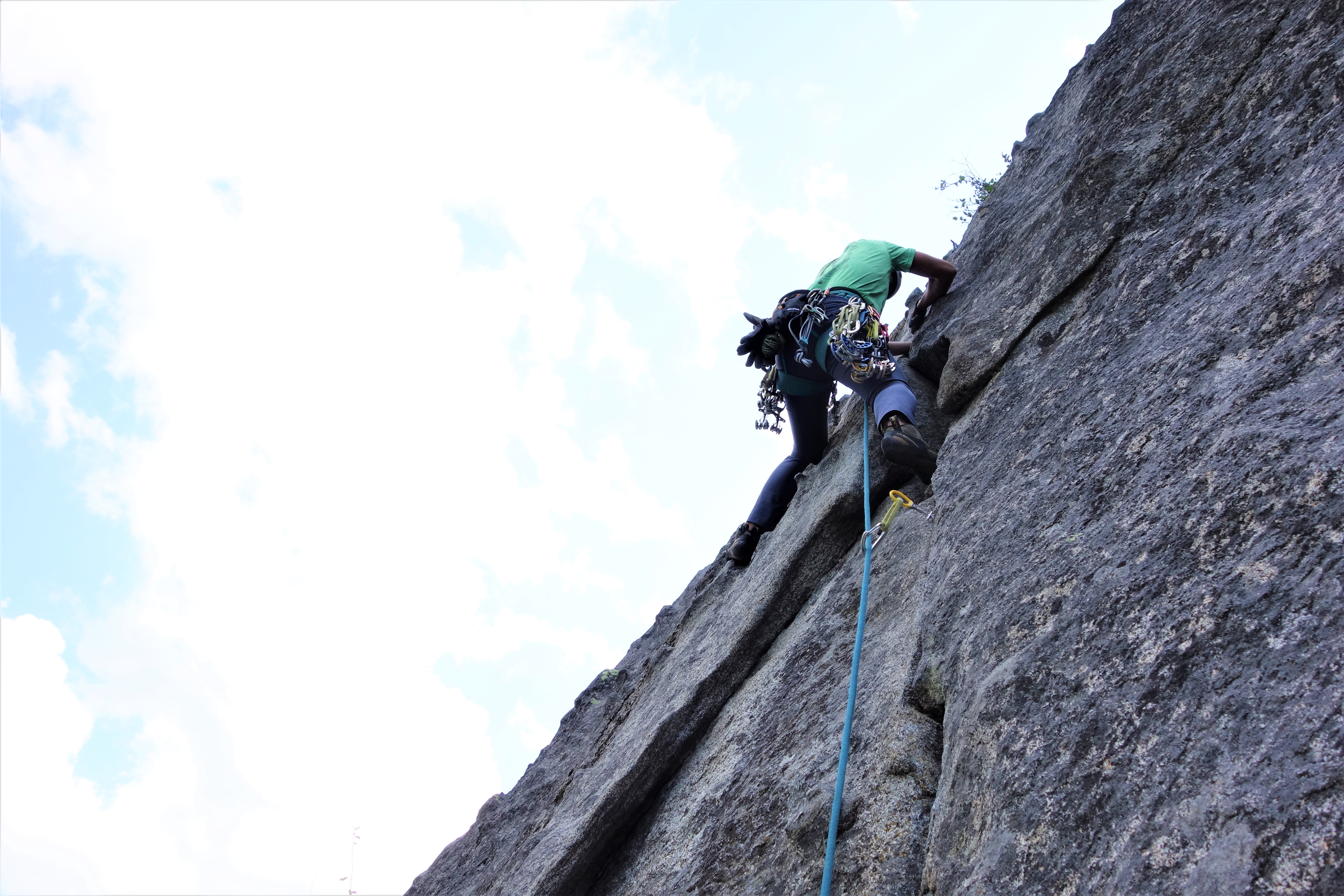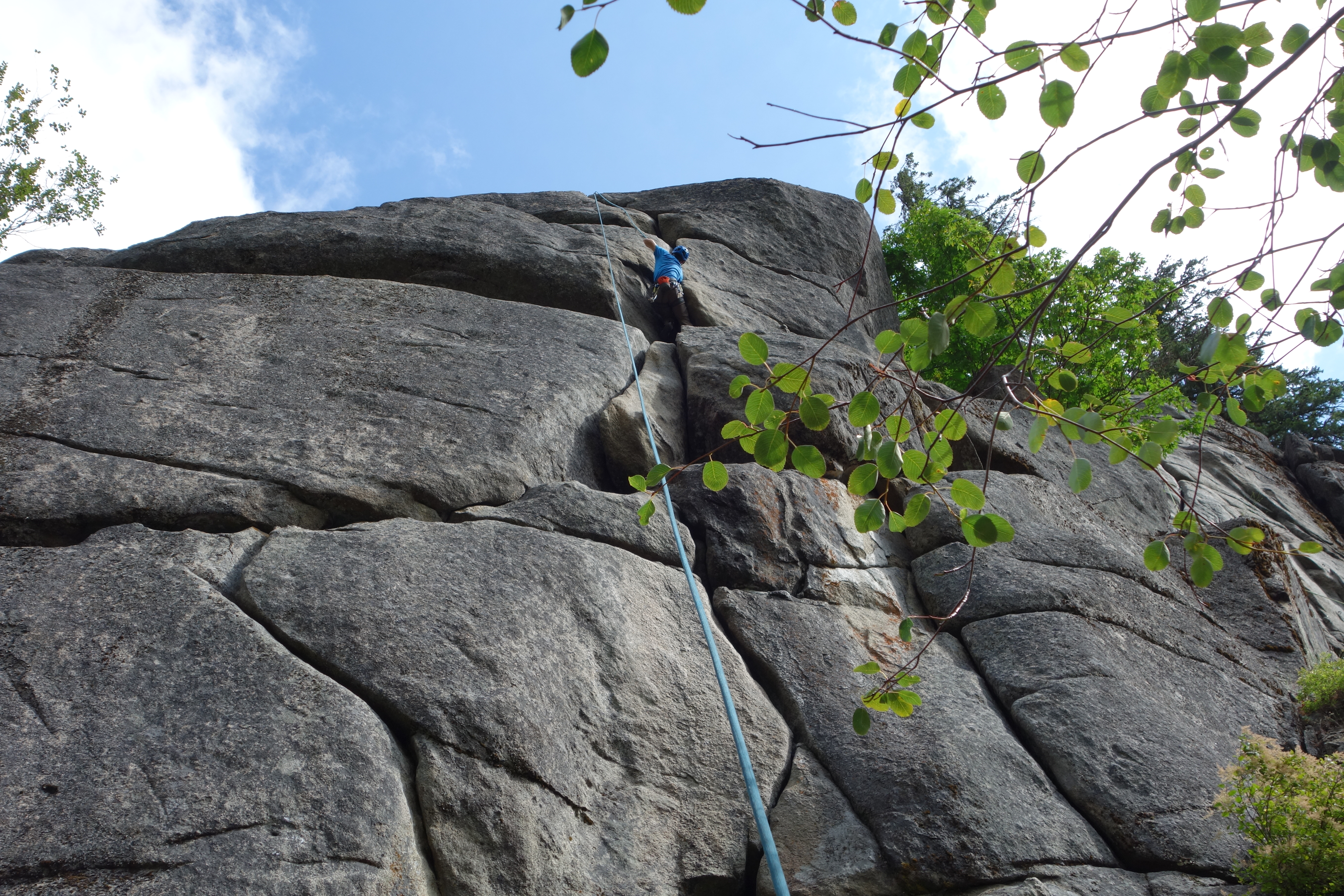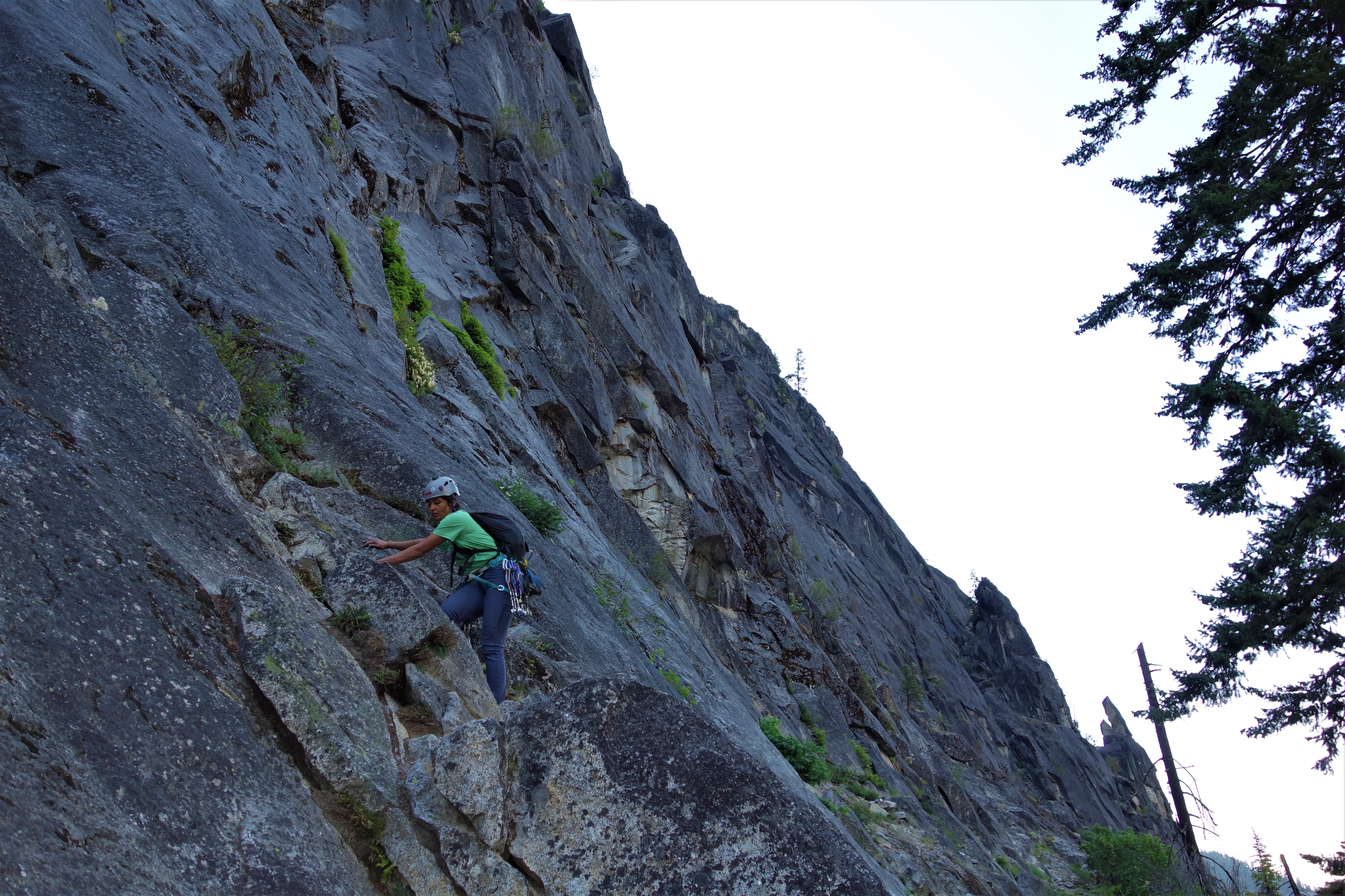 I felt pitch three was the crux of this climb: welcome to diagonal cracks. The first 20-25 feet were easy but the diagonal crack section was extremely exposed with good hand jams and tiny edges for feet. Fortunately some practice on mixed slab climbing on Friday helped to boost my confidence for this pitch.