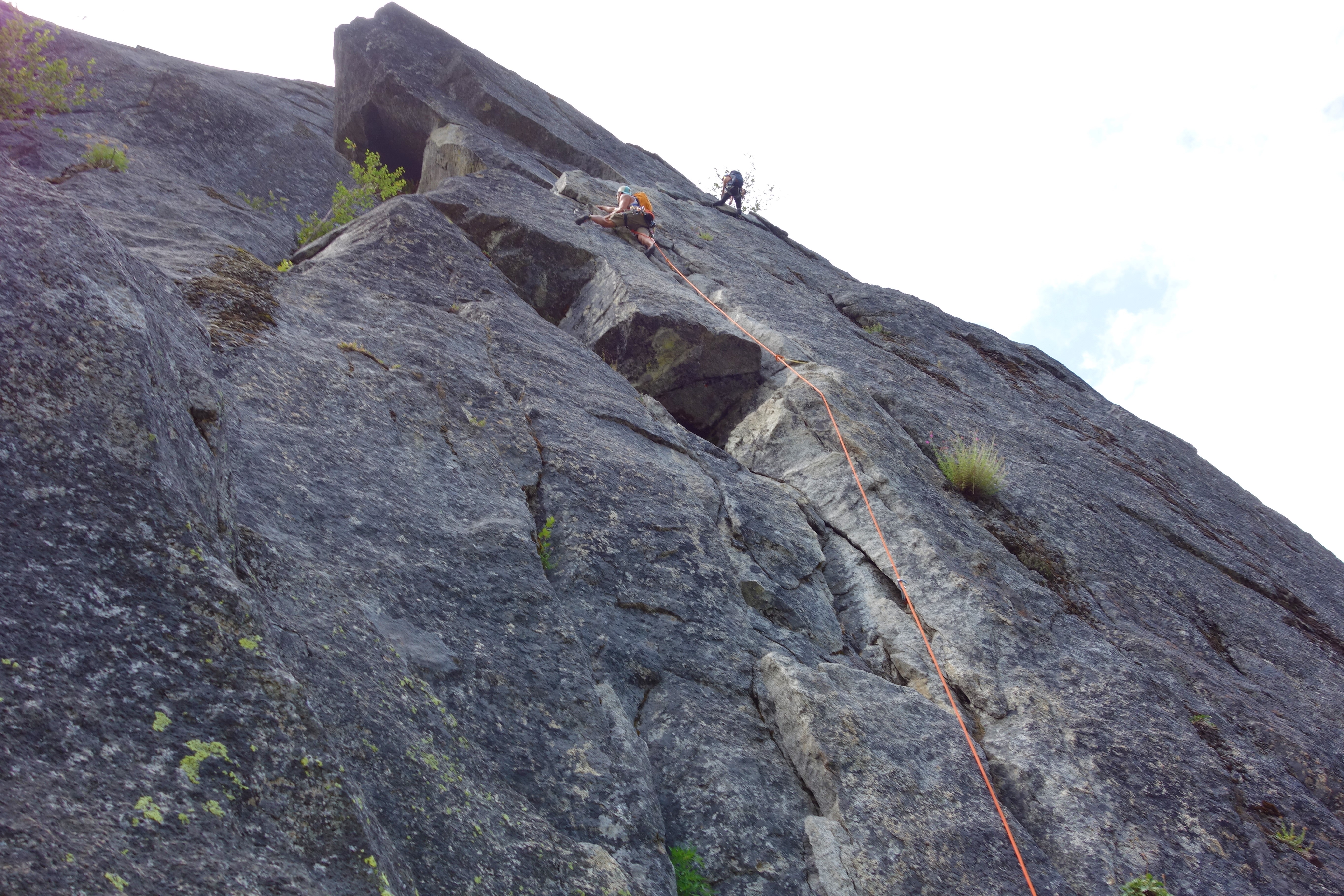 Pitch two consisted mostly of slab and chimney climbing. I have grown to like chimney and some off-widths so I started up on this pitch. After a super easy slab section I went up to the narrow chimney and found that I have to wiggle up on the left wall with feet on right wall. I started those moves but despite the lean physique, I wasn’t able to get into this section with all the gear in my harness. May be one could wiggle into this chimney but a fall during the process would result in hitting the slab below and I wasn’t willing to plunge into that adventure, so I traversed right on the slab and all the way around it. Just out of sight, I found a sweet easy hand crack which led all the way to the upper section of the chimney. I made an anchor and got Rick up to the base of pitch three, dealing with tremendous rope drag along the way.