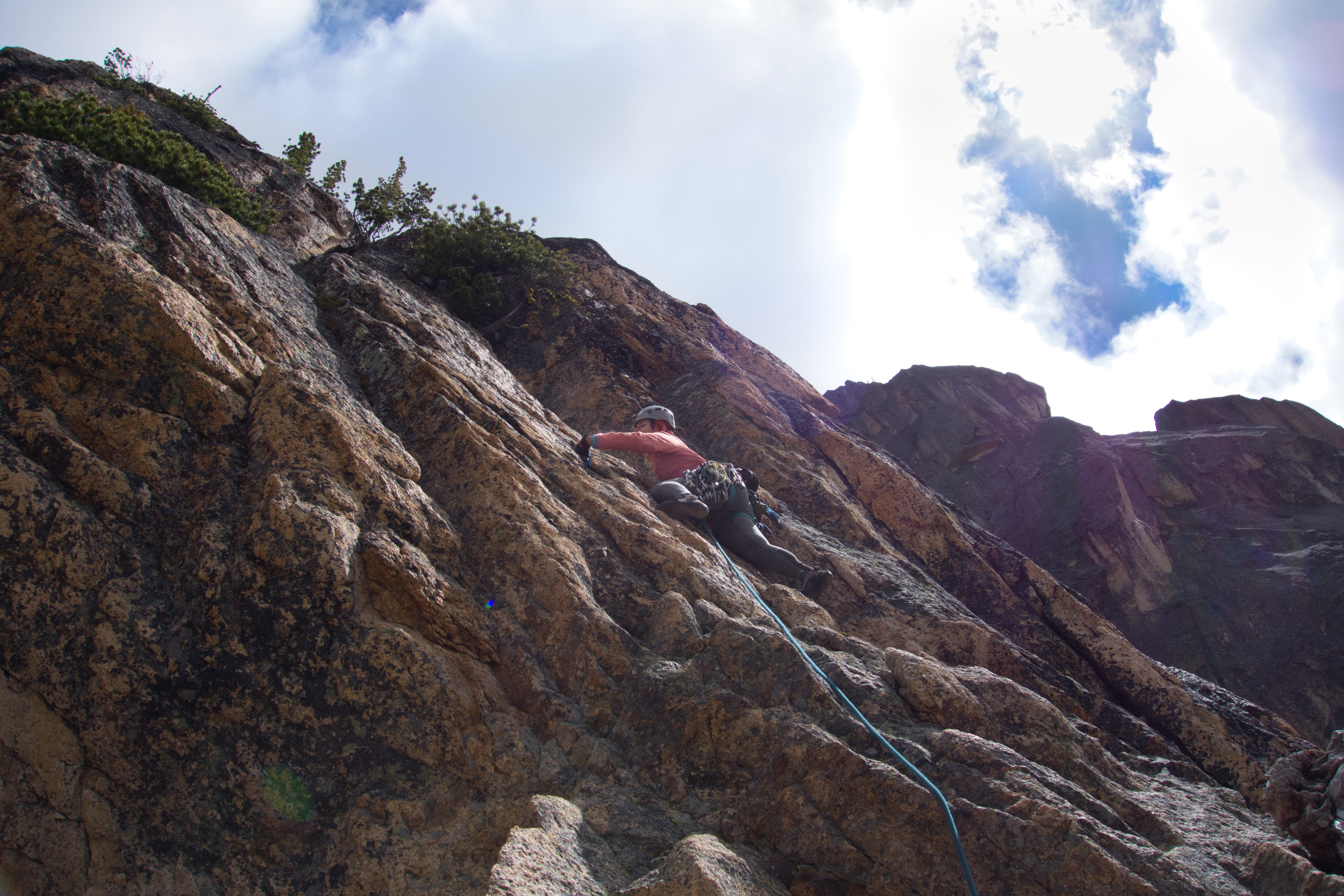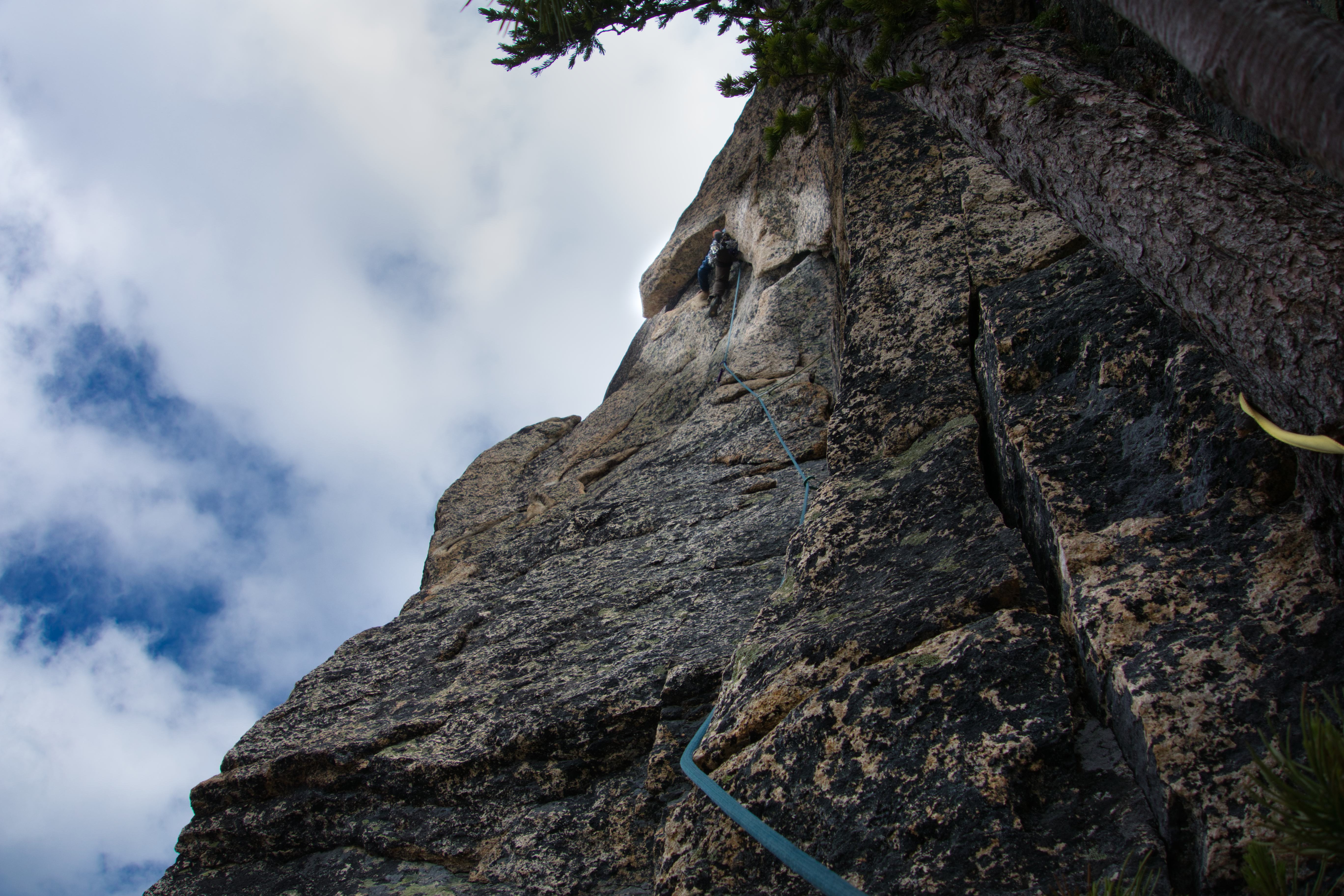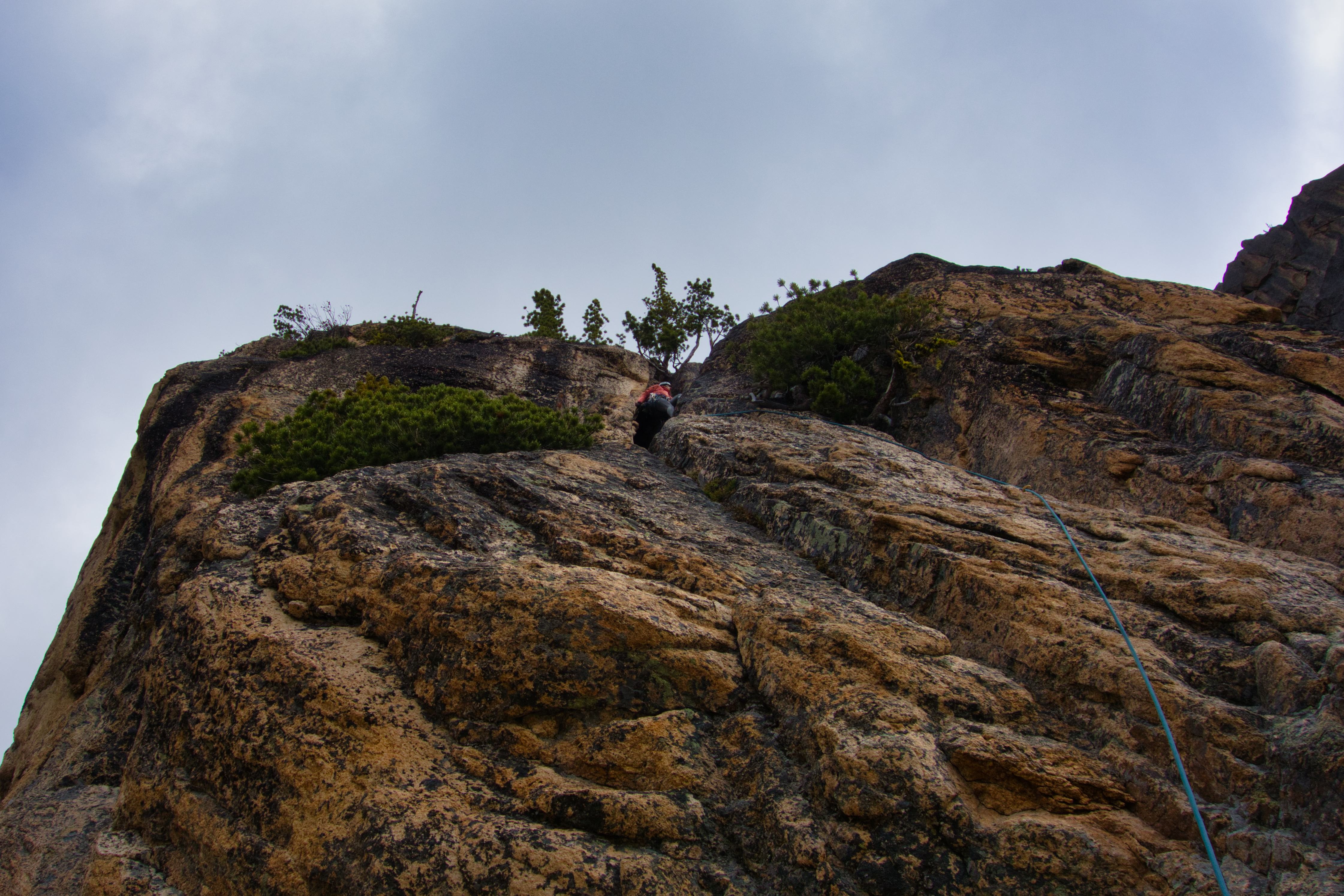 From here she took us around an arete to the NW Corner proper, up a short hand crack, and a belayed off of large gear. Once I arrived we reassessed and I anchored to a tree with fixed slings and lowered her down to me, which freed up the large gear for the next pitch’s flakes.
