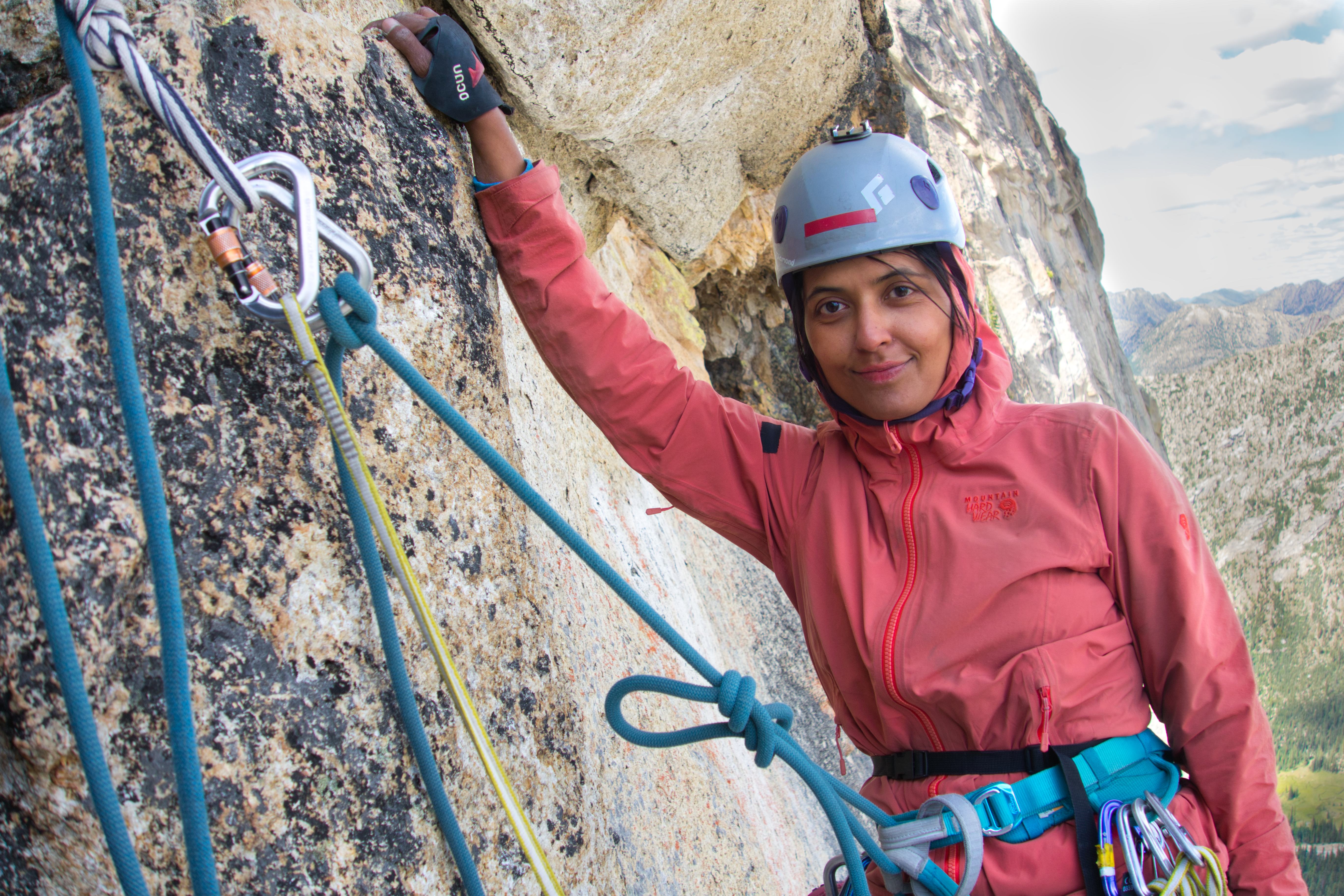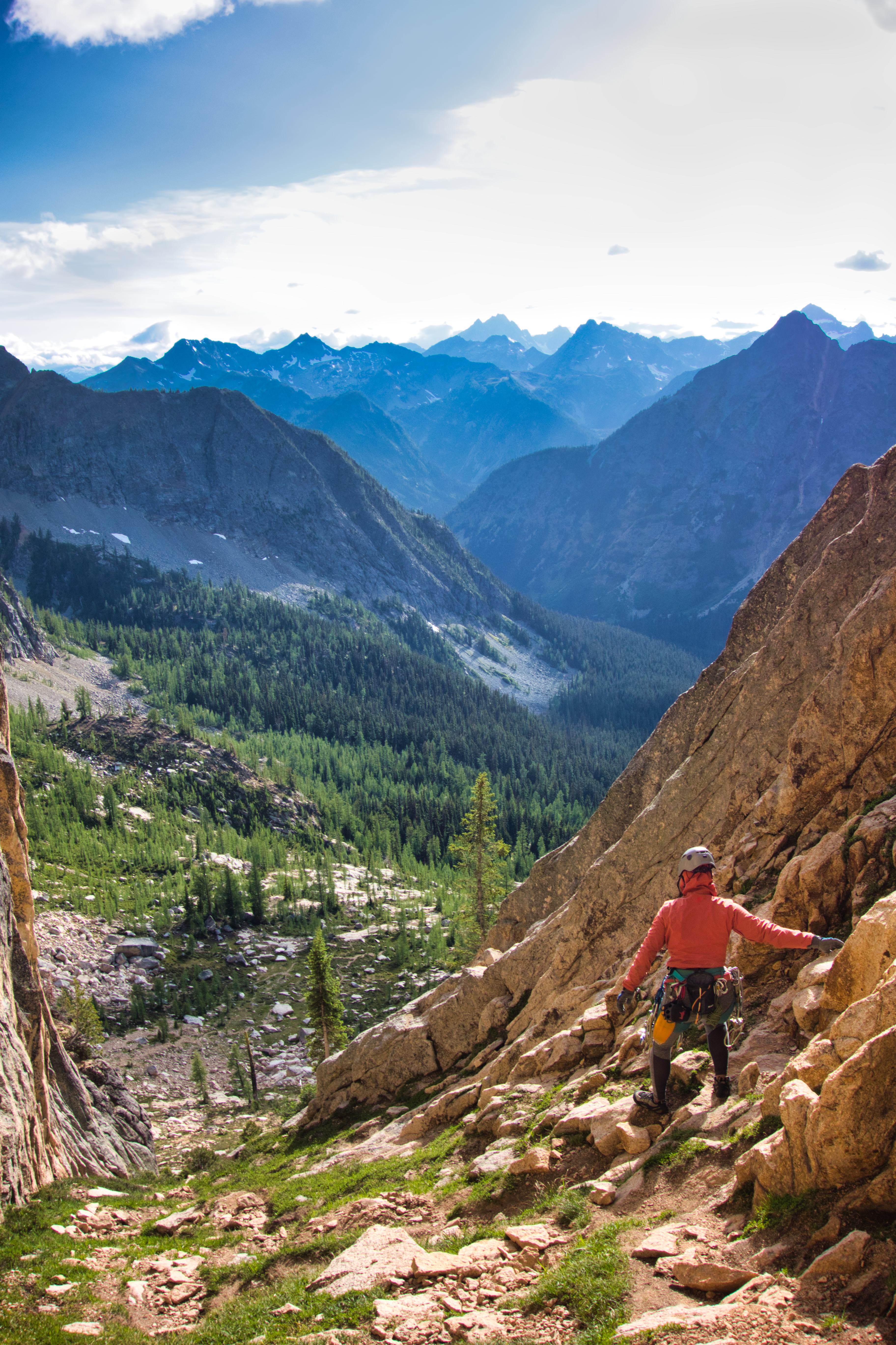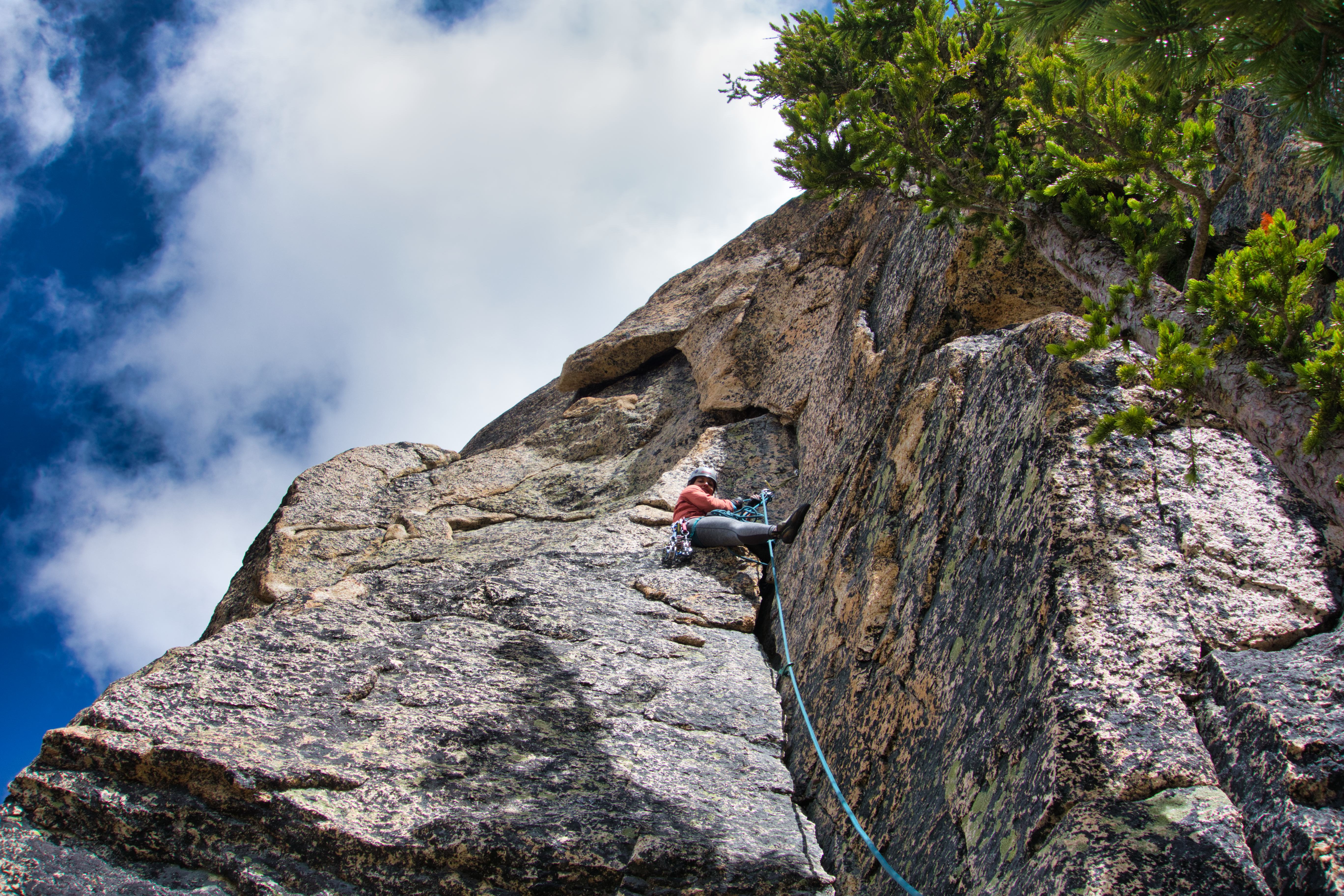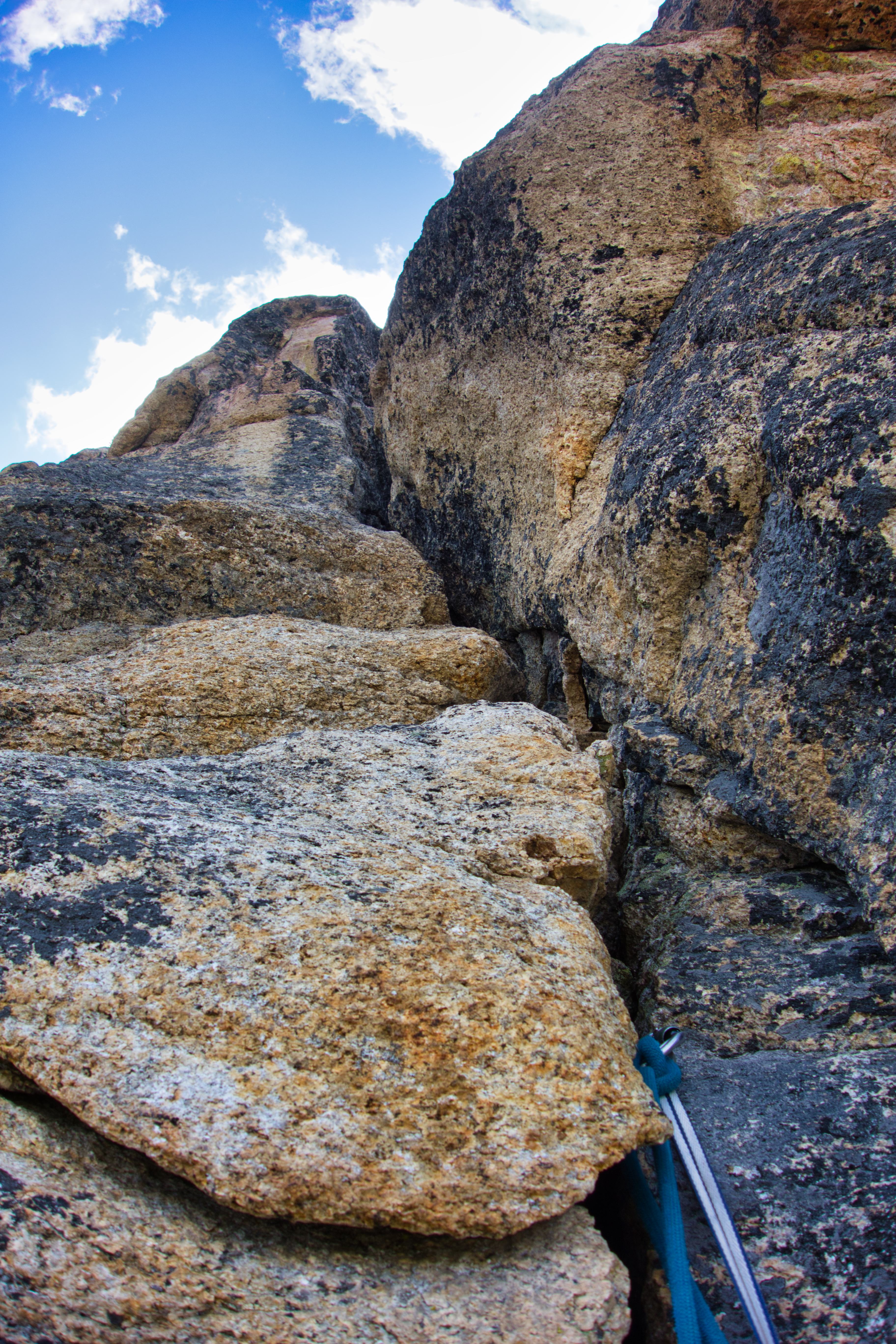 From here she took us around an arete to the NW Corner proper, up a short hand crack, and a belayed off of large gear. Once I arrived we reassessed and I anchored to a tree with fixed slings and lowered her down to me, which freed up the large gear for the next pitch’s flakes.