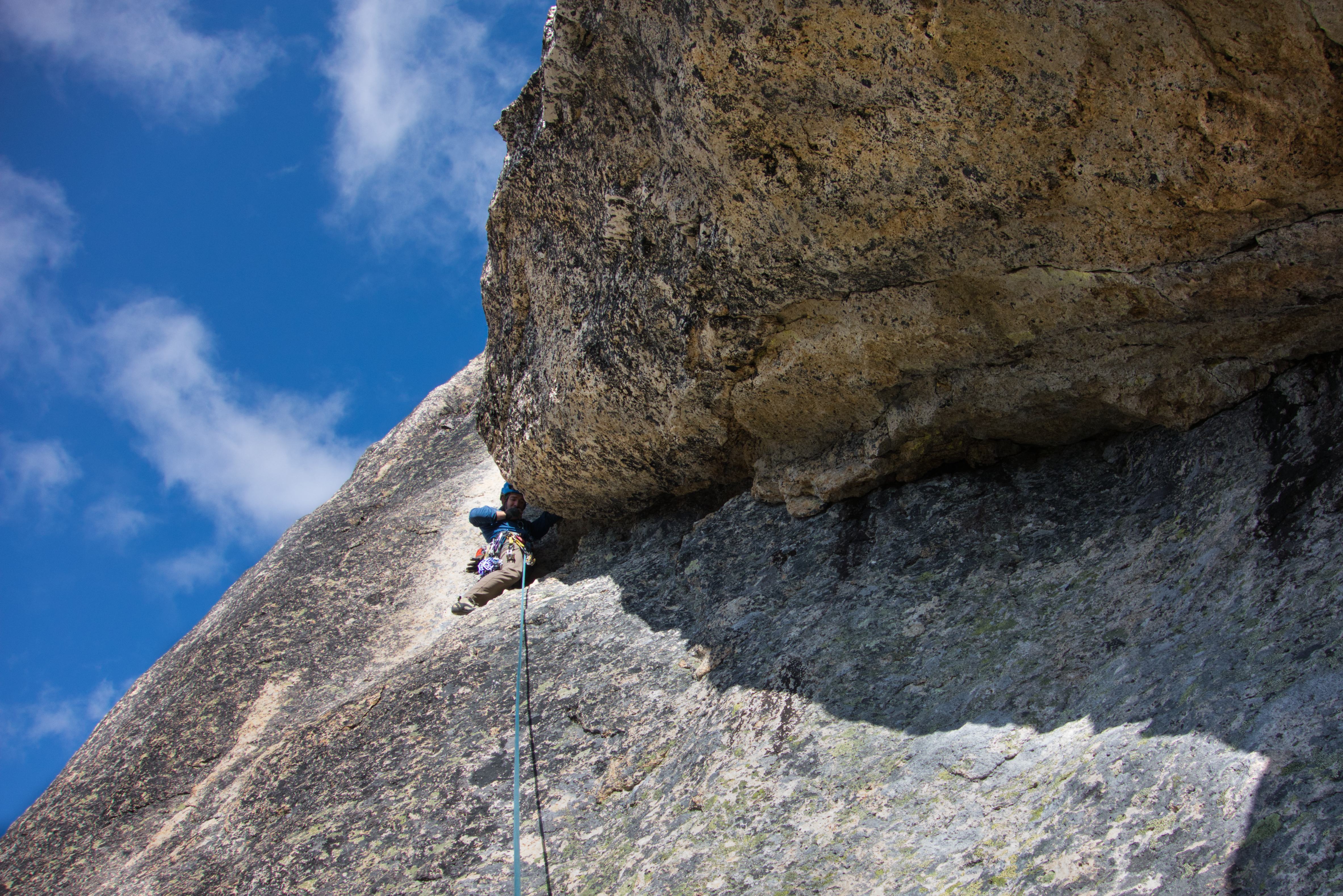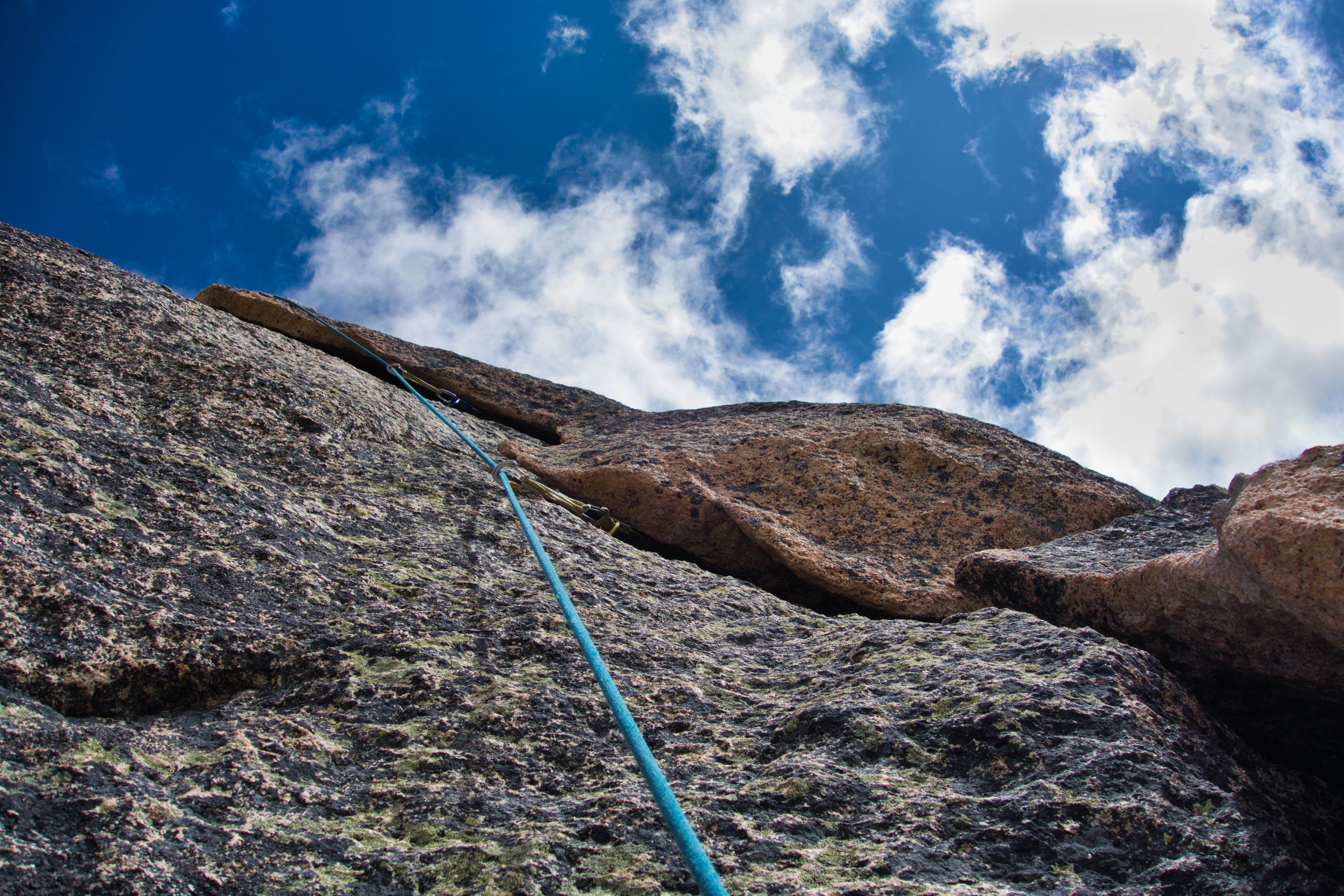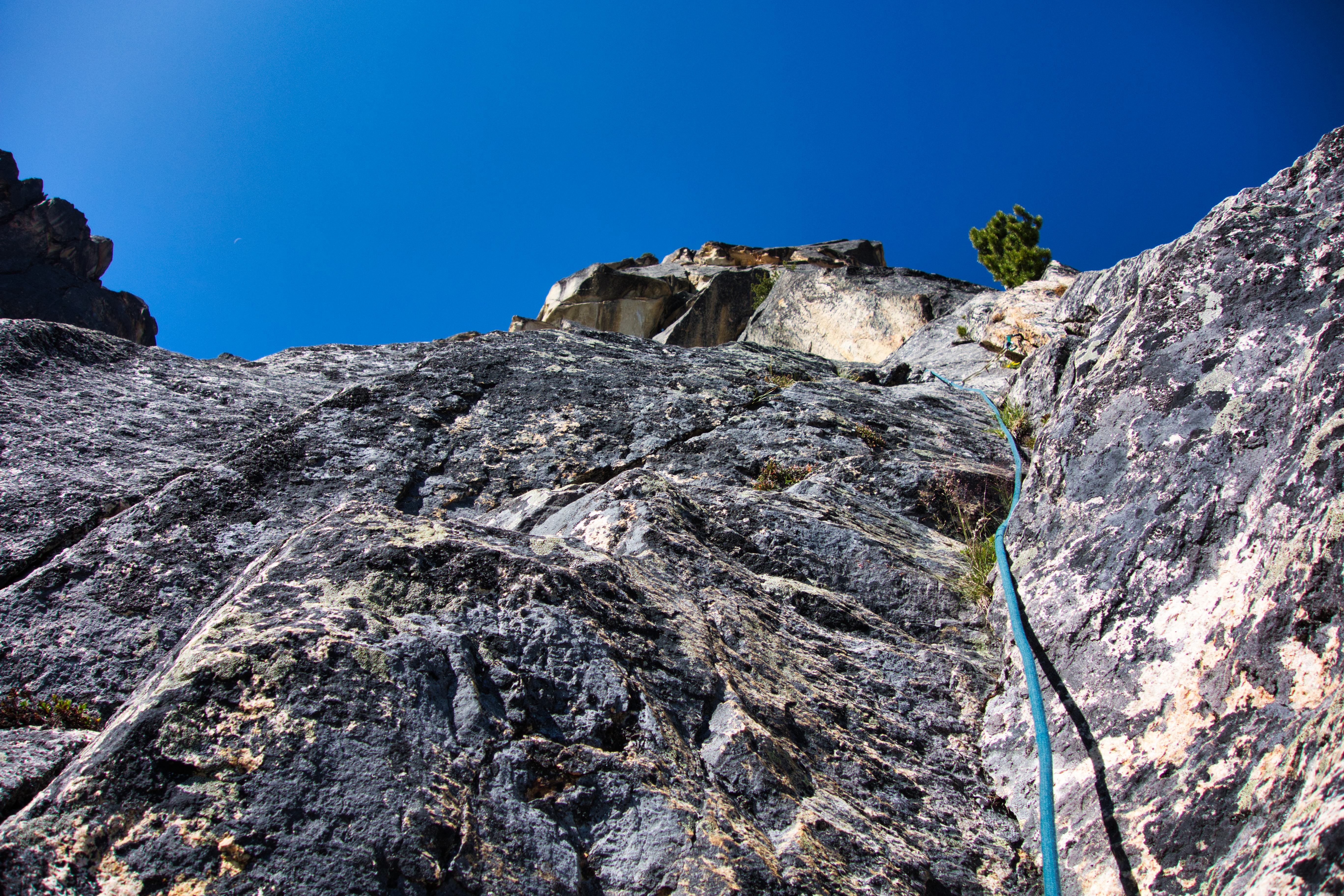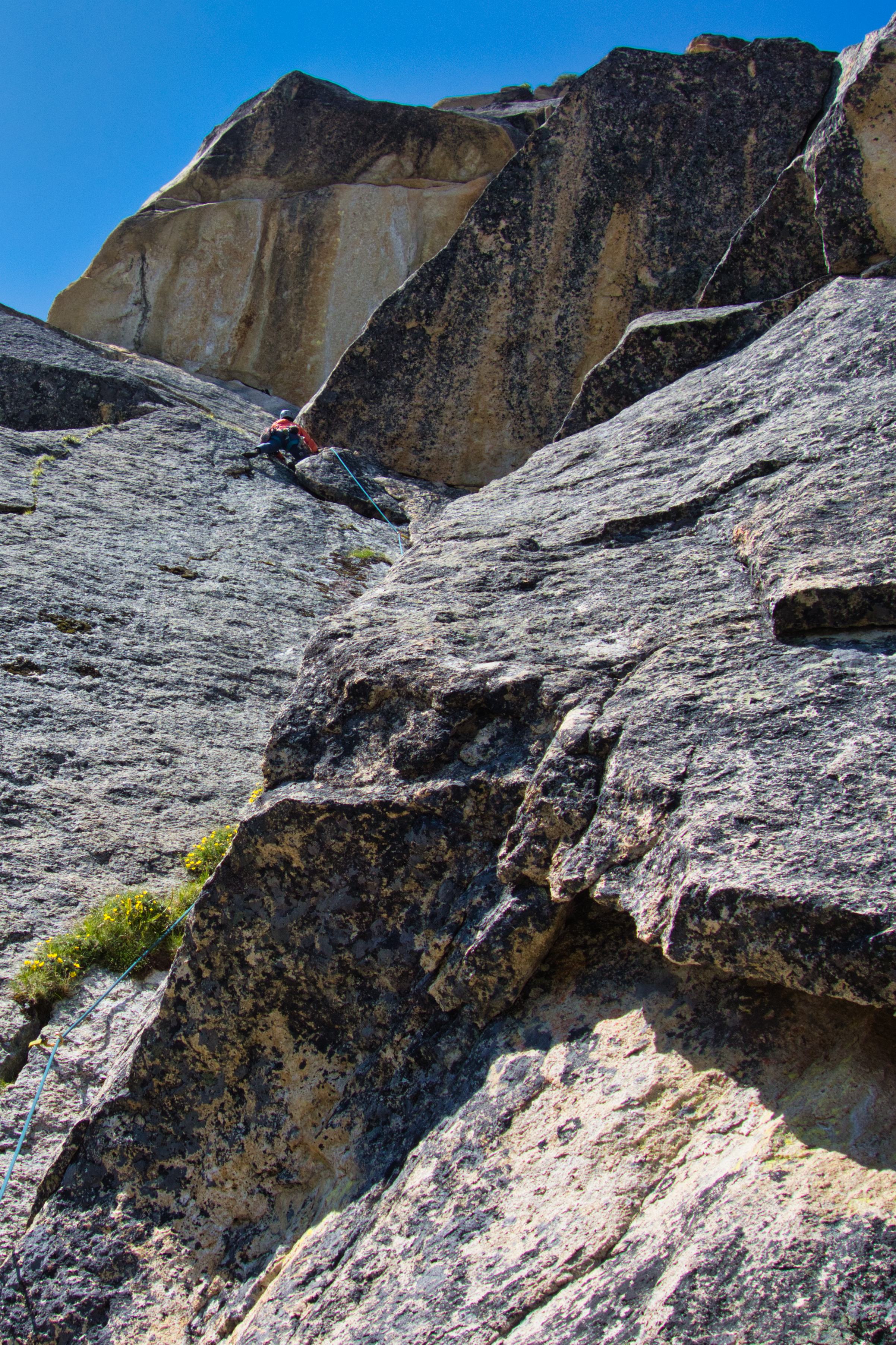 Leading out from here, I started up the zigzag flakes. After placing a #5 deep in the first wide flake, I mostly ran it out to the next anchor, as it was strenuous but easy liebacking with amazing friction for your feet. These ended up being a great teacher for me, as they showed that while I’m very comfortable on Oregon rock, I still am in need of a lot more mileage on granite to move at the speed I would like to.
