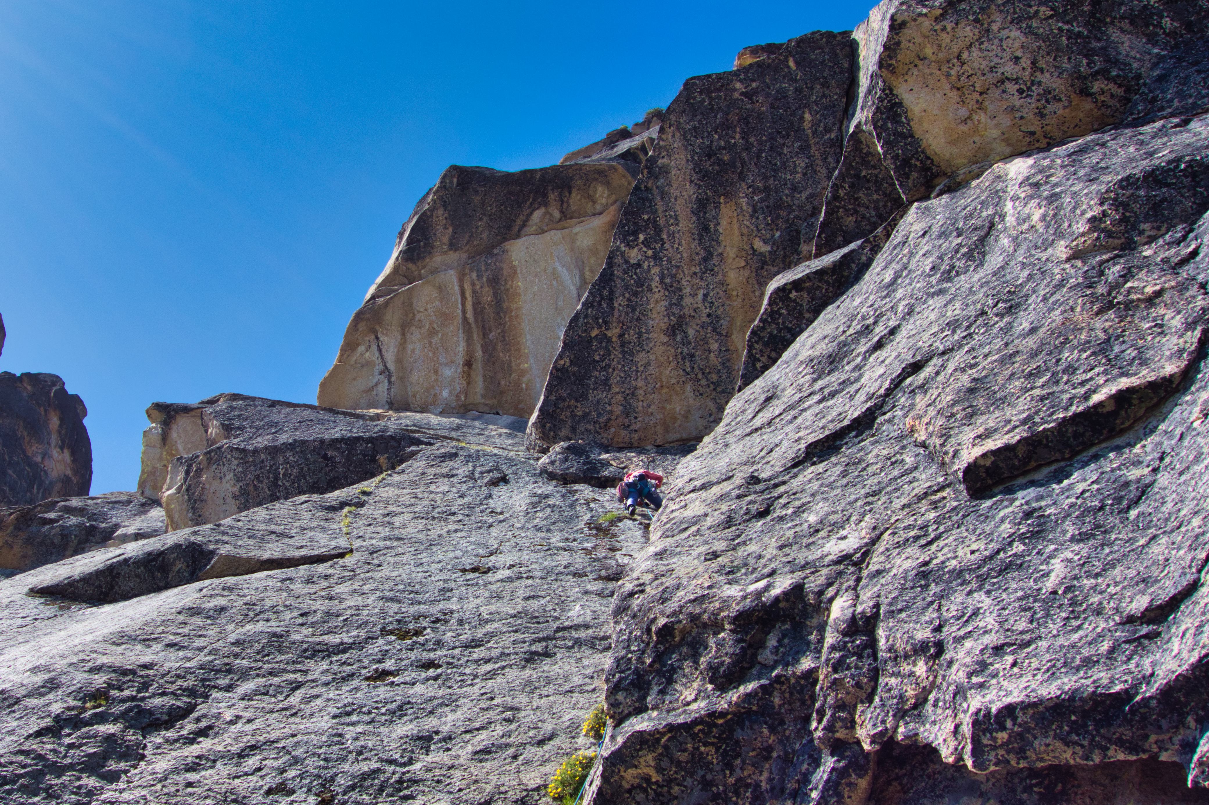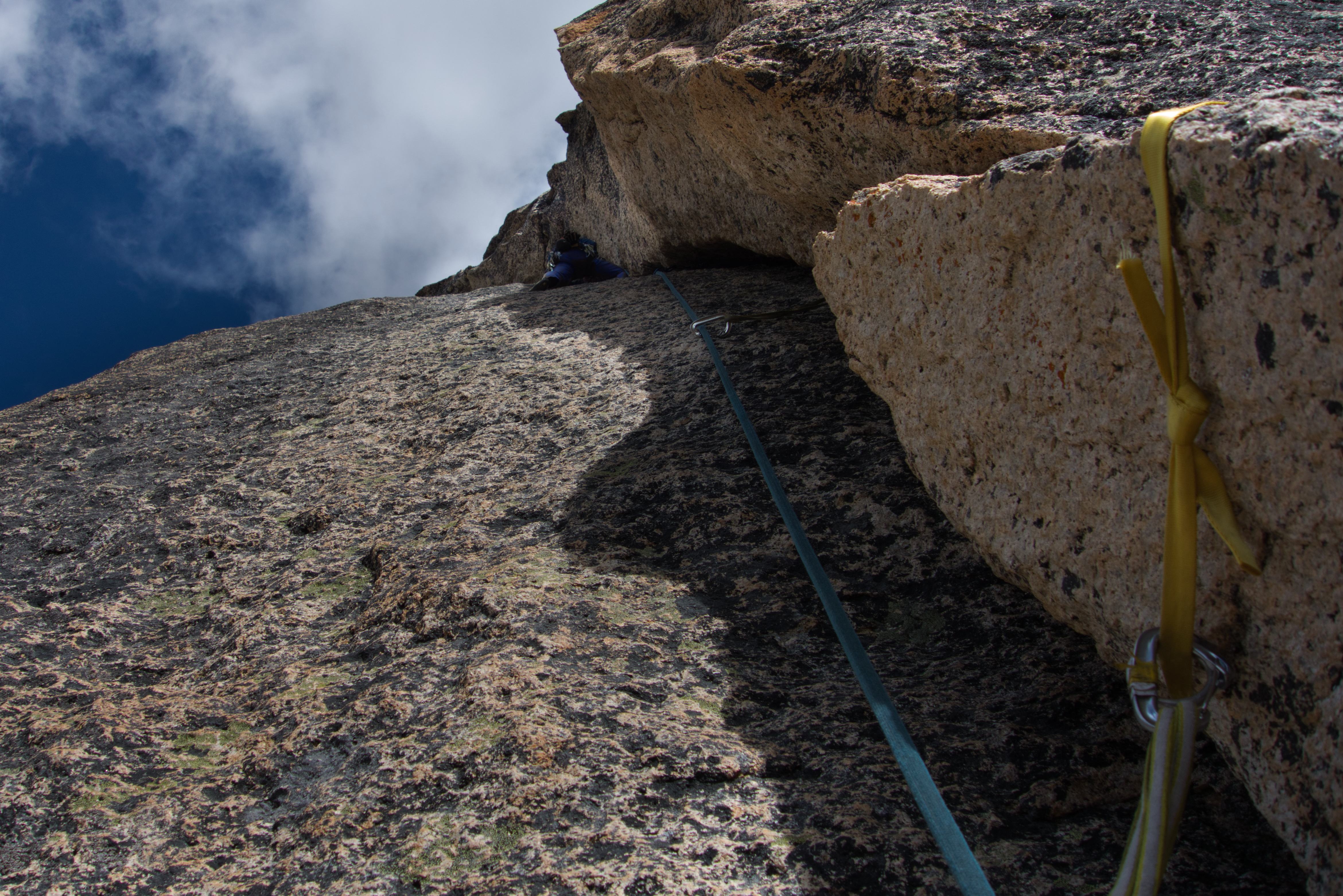 From here Sandy took off up a right-facing flake and then made a tenuous traverse left across and up difficult to protect slabs before finding cracks that would take pro. Stretching out 65 meters of our 70 meter rope, she found a ledge and belayed me up to her stance.