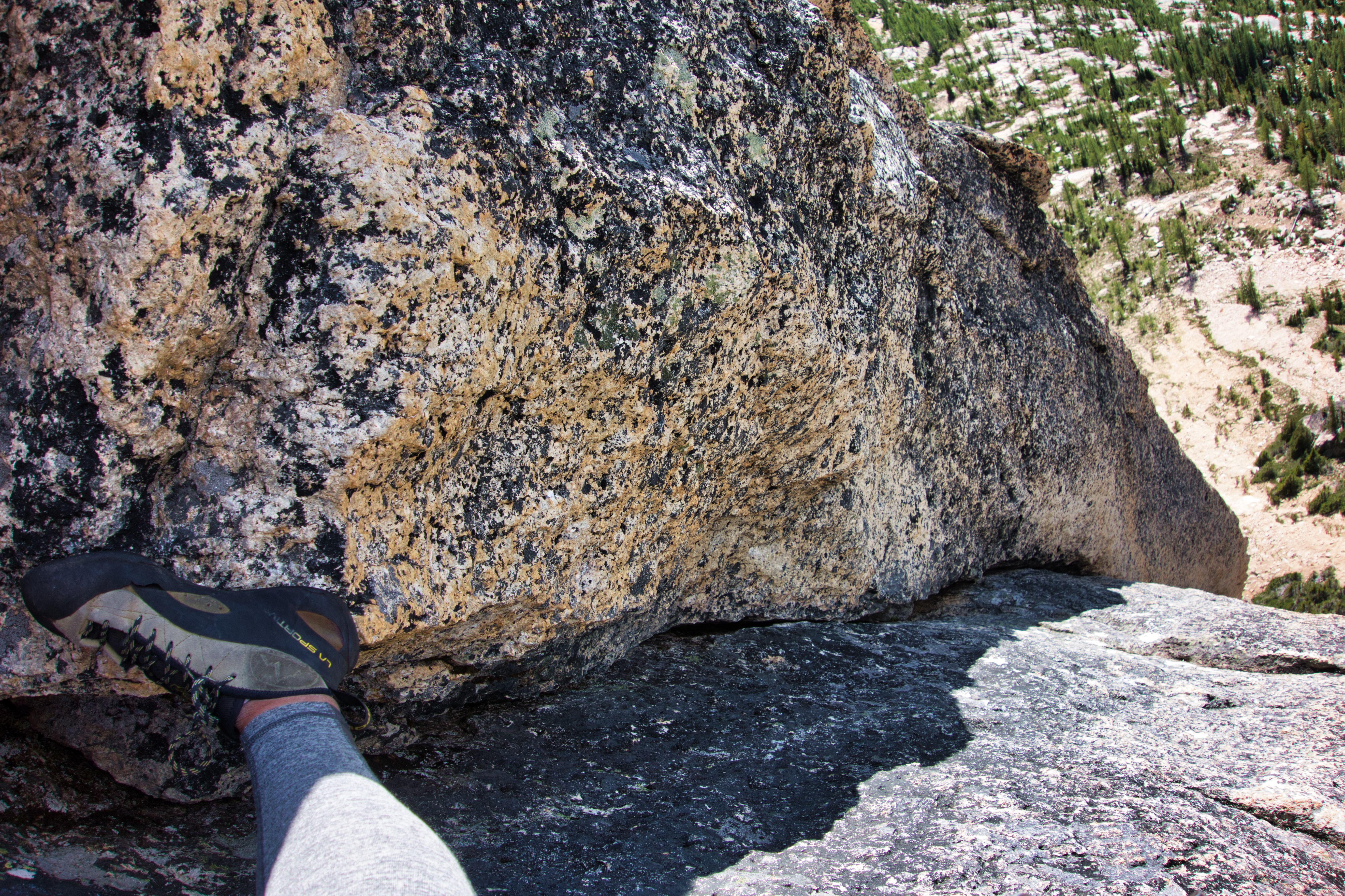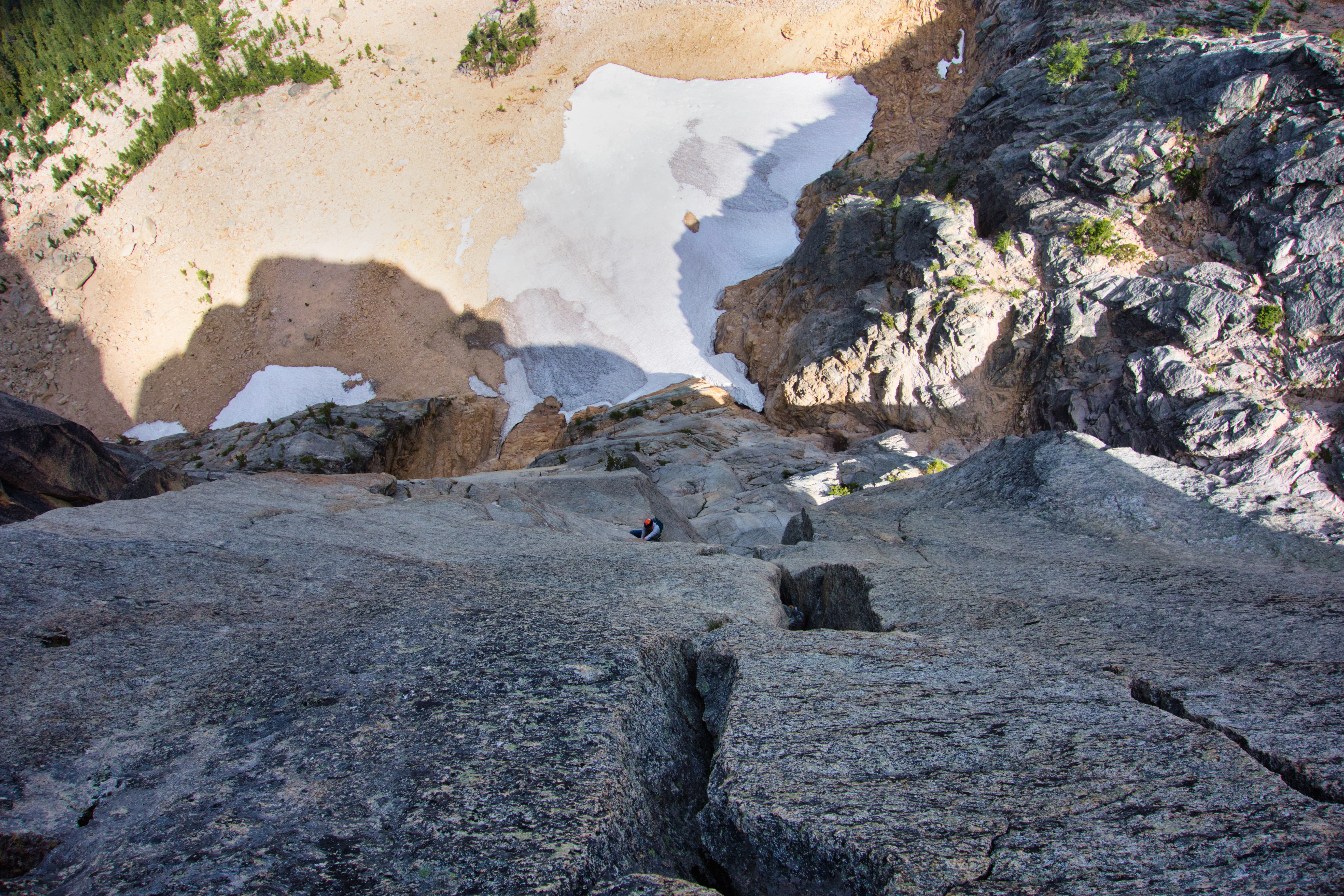 From this hanging belay we switched leads, and I appraised the ledge I had to traverse. The route description had described this as an exposed 30 foot rightwards traverse with no hands, but I was pleasantly surprised that it was much easier than I how I had built it up in my mind. While it was exposed with no handholds, you could reach down and brace yourself on the ledge while placing gear to protect the traverse. As the wall became steeper, I stuck both hands in the crack at my feet and dropped down onto the face on small footholds, traversing the last few feet to the flake with hundreds of feet of air beneath my feet.