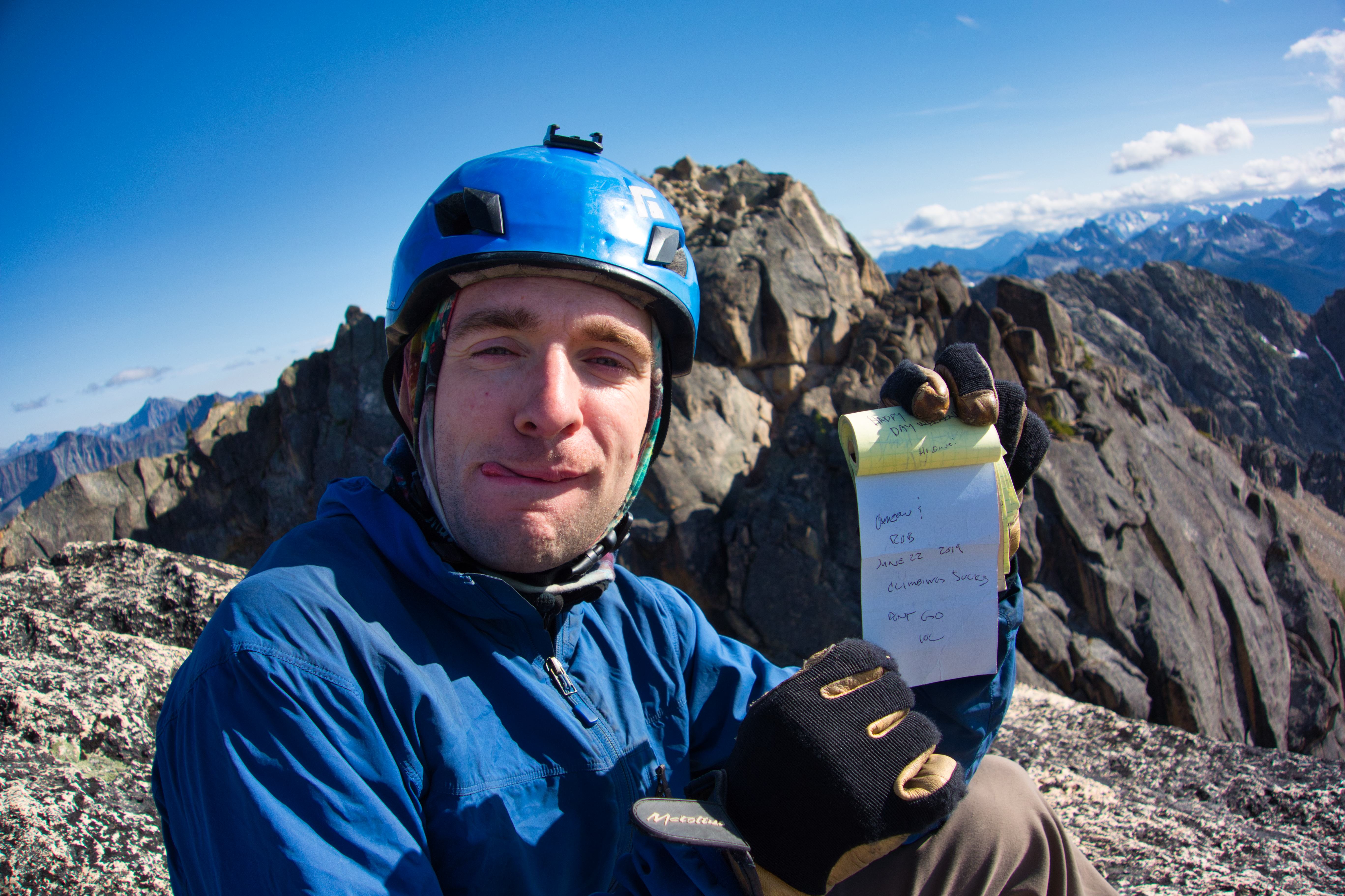 Ducking behind a large boulder to get partly out of the wind, I slung a constriction and brought Sandy up, and we unroped and scrambled to the summit for the obligatory summit shots and views.