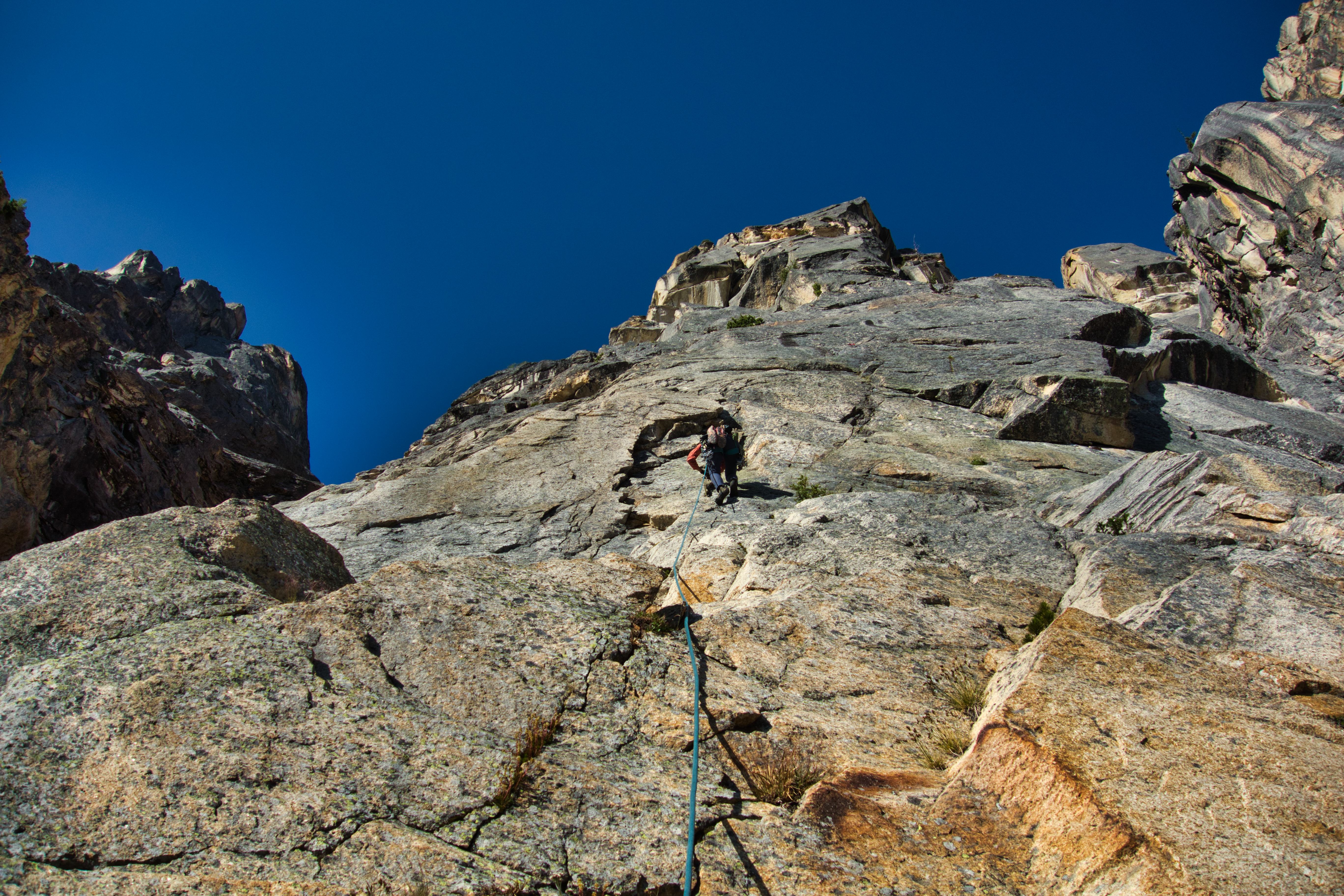 Parking at the pond near the hairpin turn, we made quick time up the well-worn climber’s trail to the large boulder field below the east faces of the Liberty Bell Group. Traversing beneath Lexington Tower, we climbed around the mostly melted out snow gully and switched to rock shoes, soloing up the initial low-fifth approach pitch to the treed ledge which marks the first pitch.
