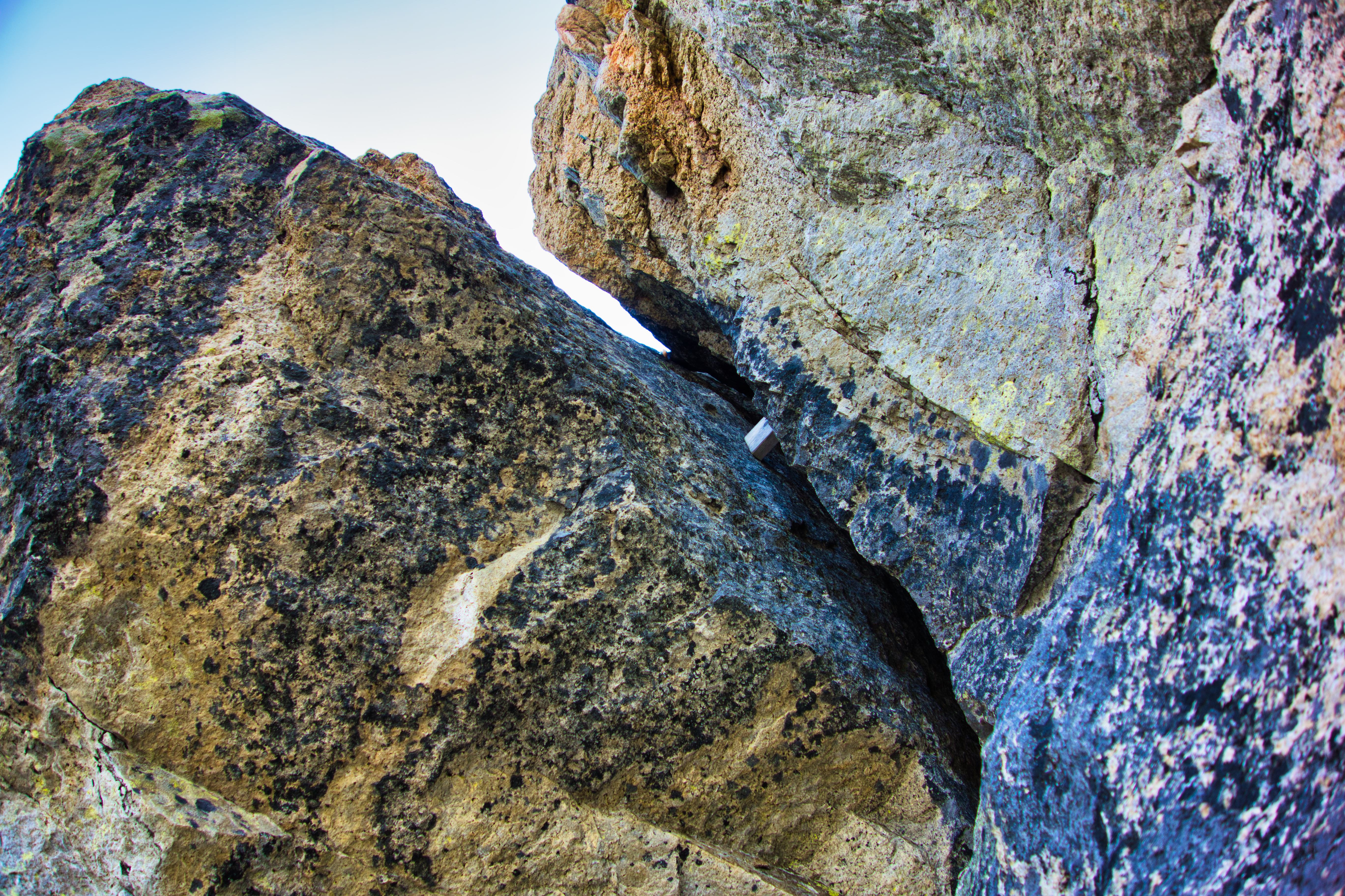Kneebaring my way up the inside of the chimney and internally chanting “No one falls out of chimneys”, I slowly made my way up and towards the top, which had a horizontal #2 crack and the first piece of pro of this section. Finally getting some pro in, I pulled over the next bulge and into a fun easy offwidth crack which deposited me at the base of the awkward 5.8+ chimney.