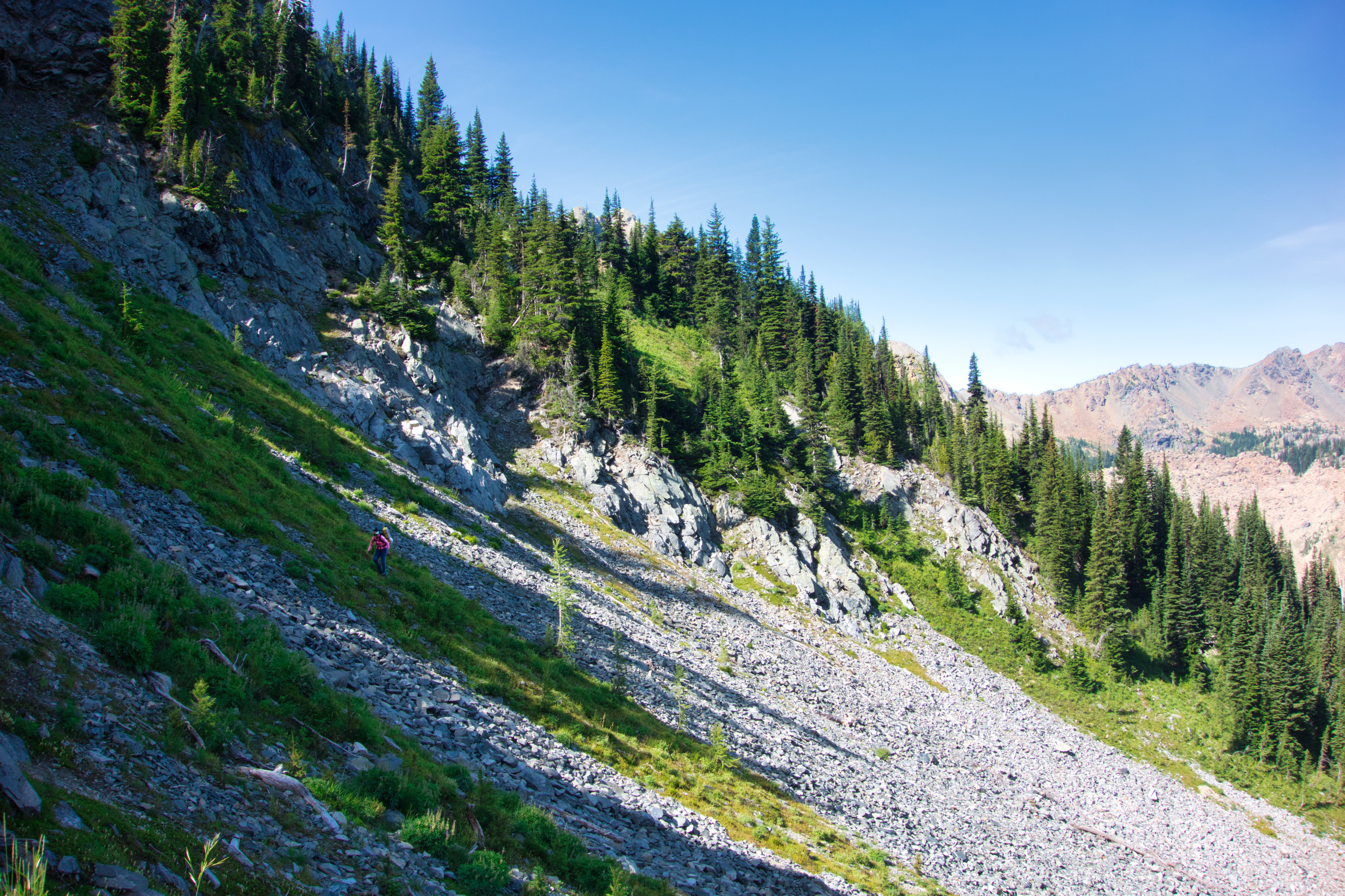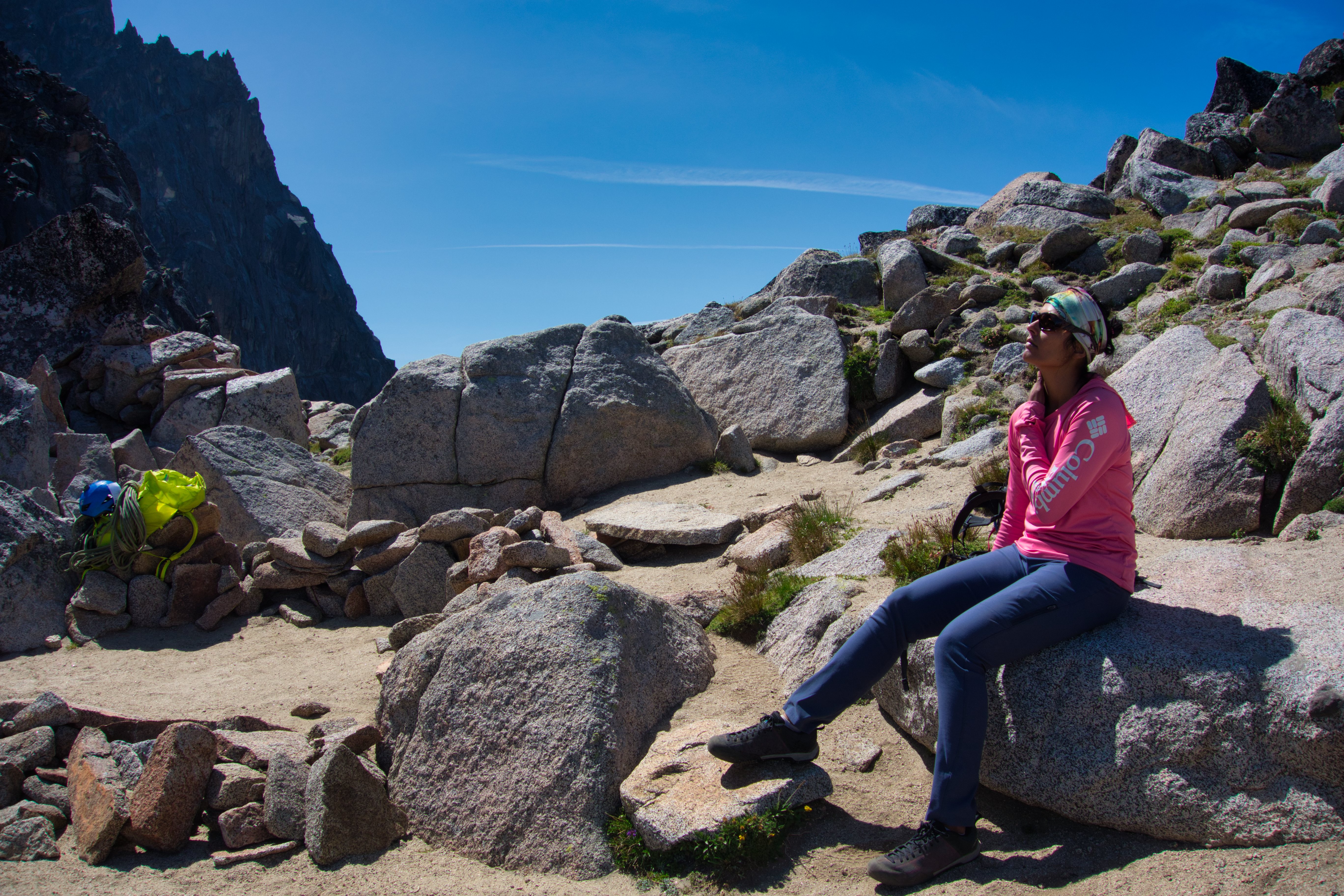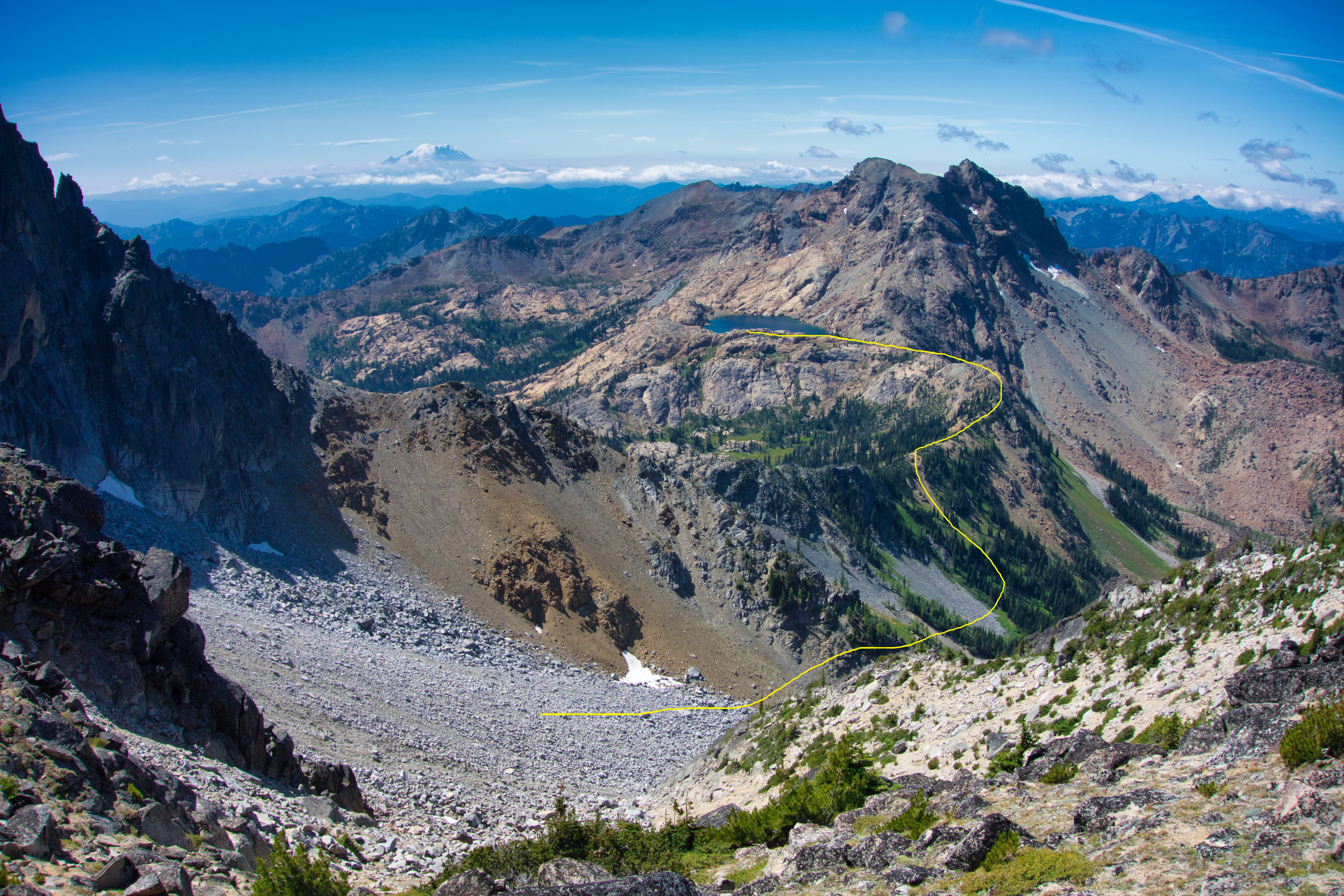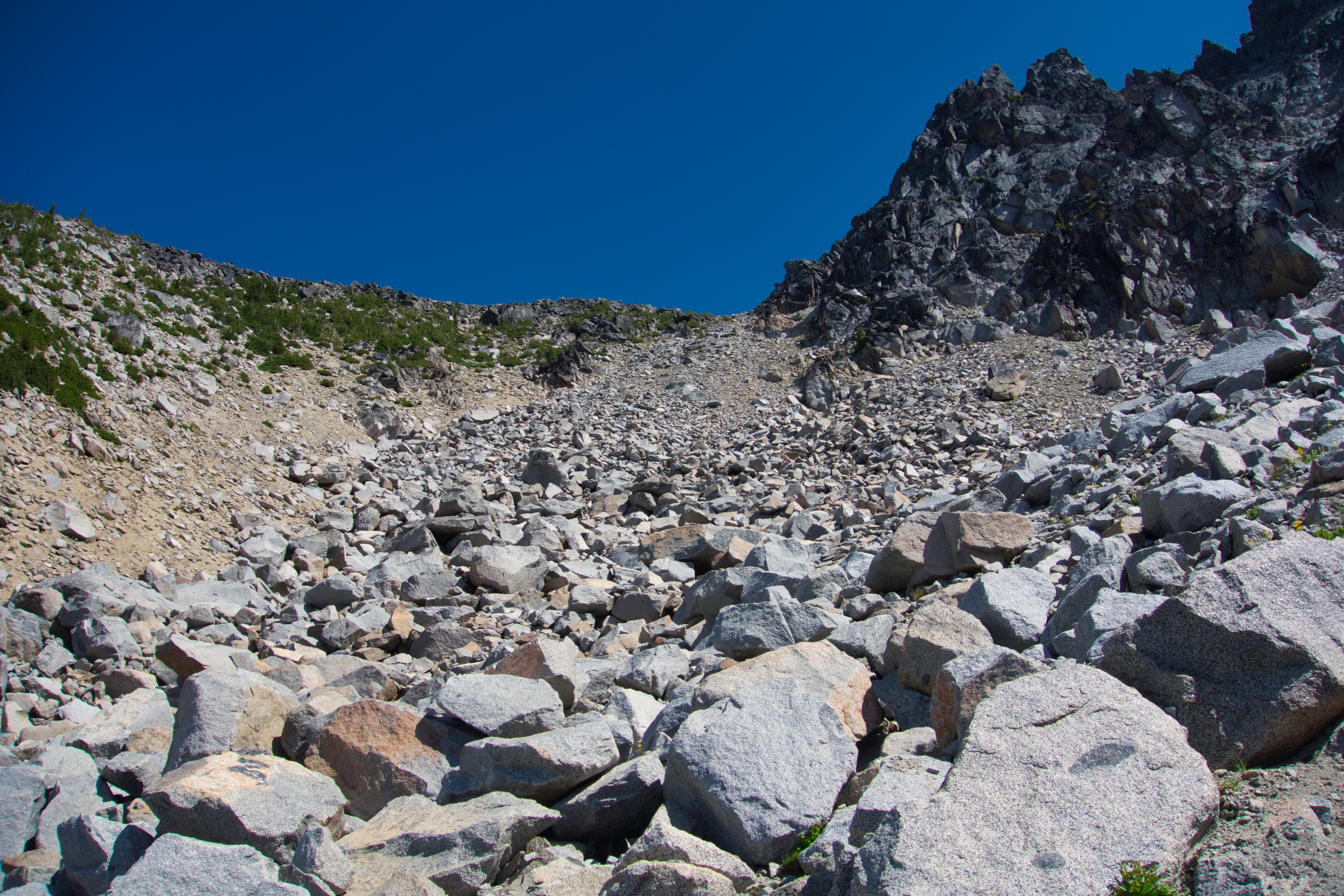 Past Ingalls Lake, we made our first route-finding snafu, following our GPX track (and Cascades Rock‘s topo) across the Stuart Pass and down towards the bottom of a boulder field, which we had to then laboriously ascend after spending an hour-plus slowly traversing over loose sandy heath slopes. Looking back after climbing the final boulder field to Goat’s Pass, we helpfully found a path directly behind us which would of avoided all this unpleasantness, something to look forward to for next time.