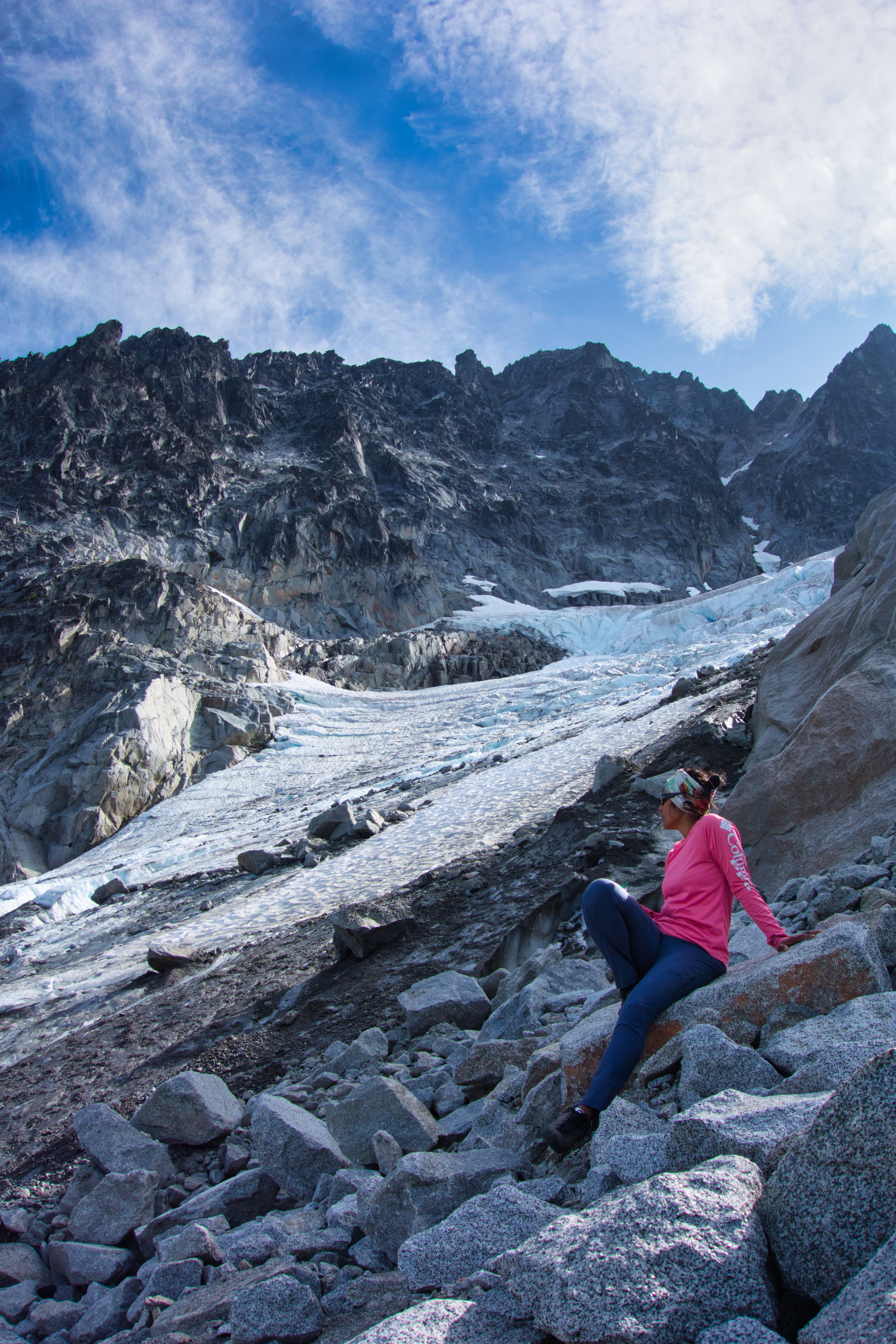 After reaching the bivy spots on top of Goat’s Pass, we stopped and had lunch with the resident snafflehounds. From here the North Ridge looked deceptively close, and after our break, we started skirting the glacial moraine below the Stuart Glacier.