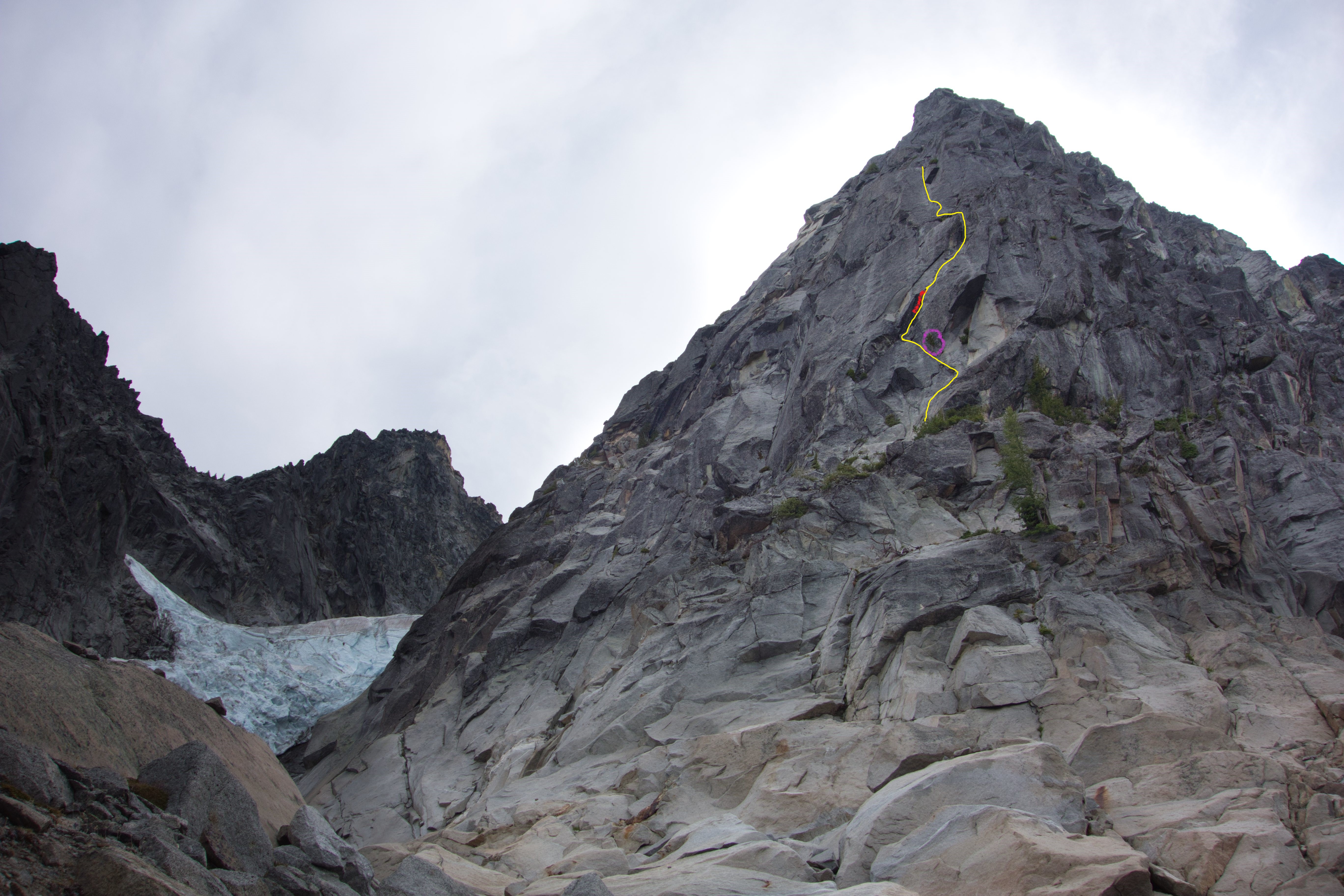 Route in yellow. The squeeze chimney is in red, and the j-tree is circled in purple.