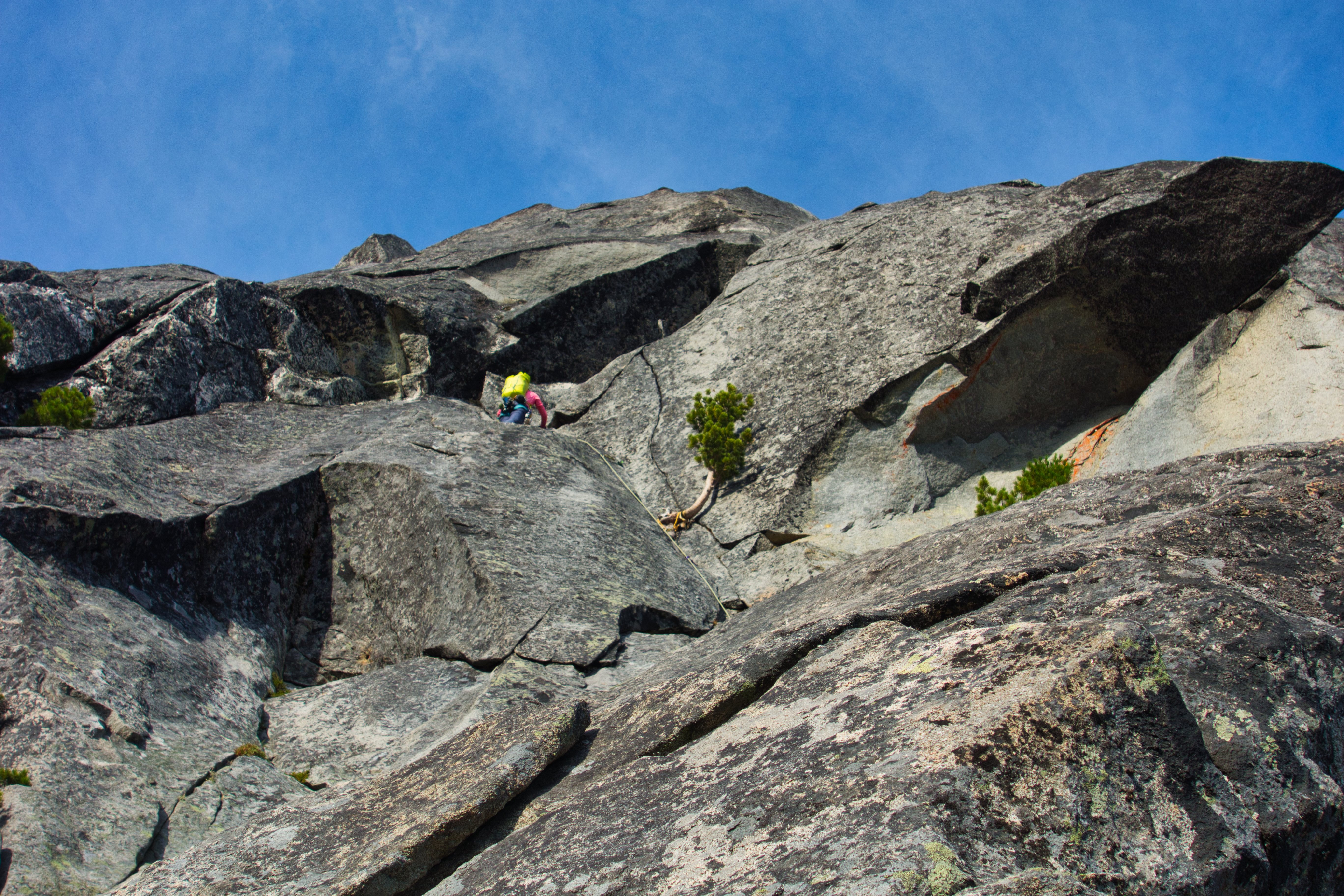 After a short belay up the ~5.7 section above pitch 3, Sandy started leading out simul-climbing. The lower section of the ridge was fairly easy to follow along the right side of the crest, but compared to the East Ridge of Forbidden made for some less than aesthetic climbing. The movement, however, was consistently interesting, varying frequently between slabs, jugs, short cracks, and — later on — exposed ridge lines.