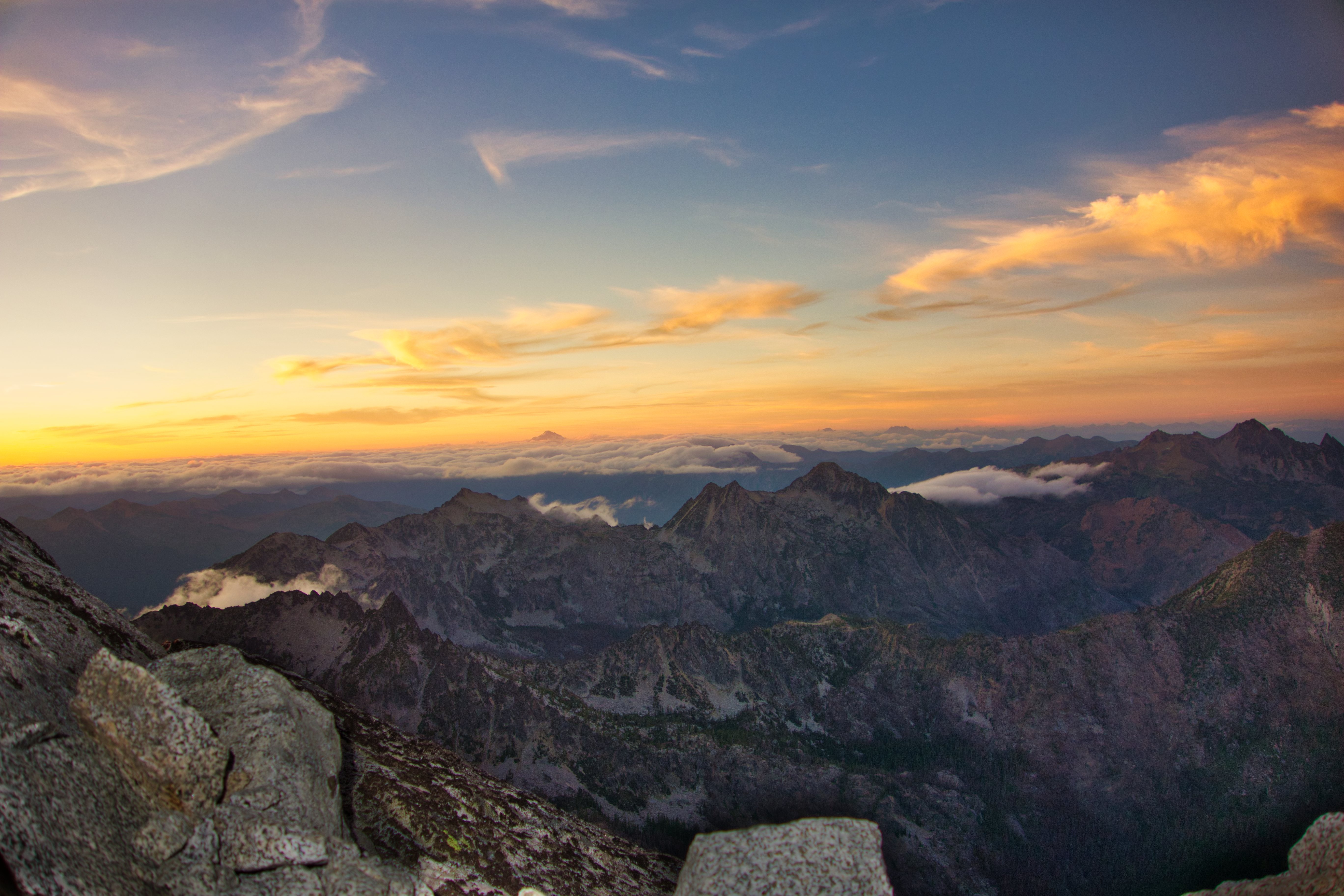 As the sun went down, the wind picked up to gusts around 30 mph, and whenever it died down you could still hear what sounded like a freight train going over the peak above. Luckily our bivy bag, despite whipping around half the night, made for a cozy sleep, and around 1 am the wind finally died down.