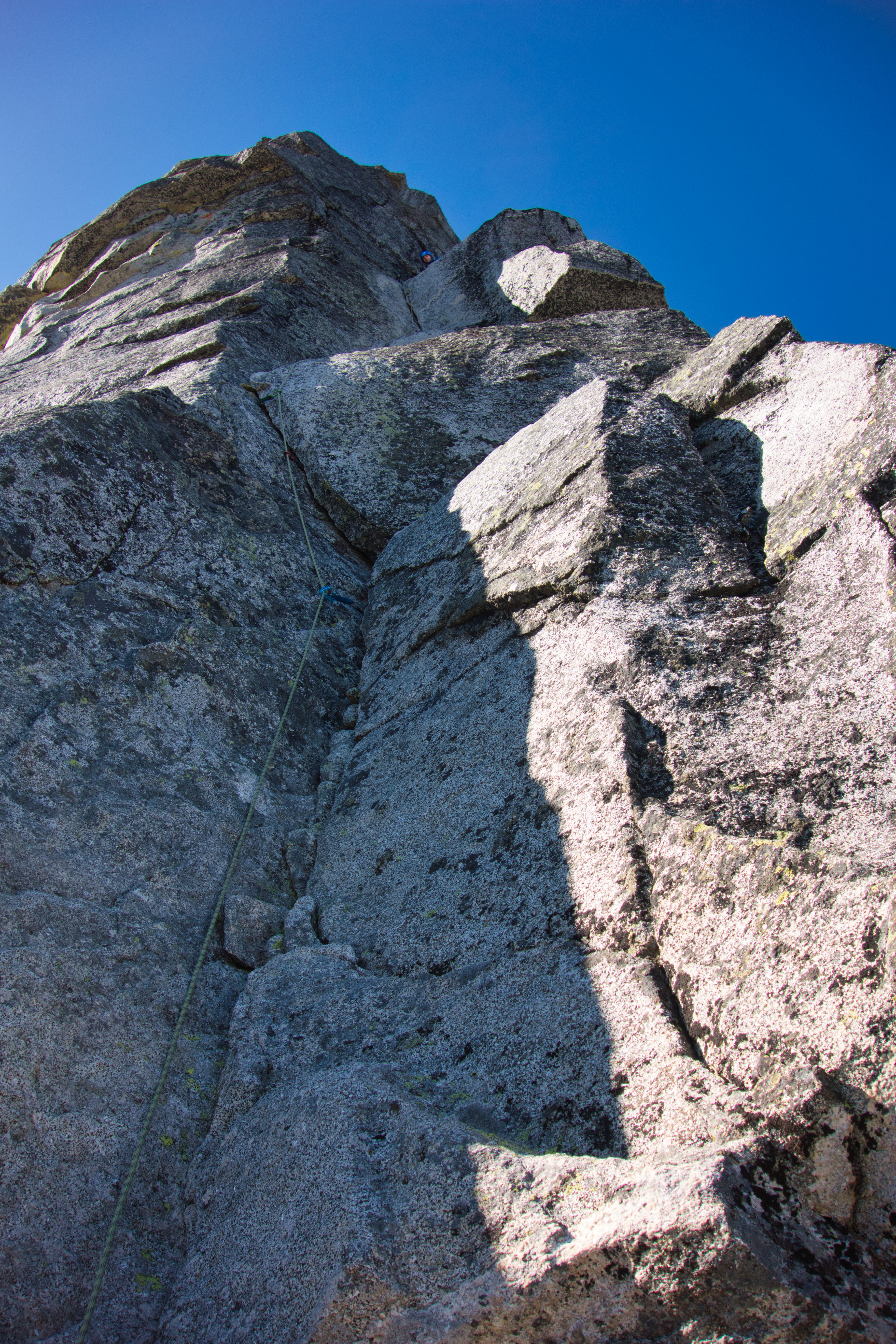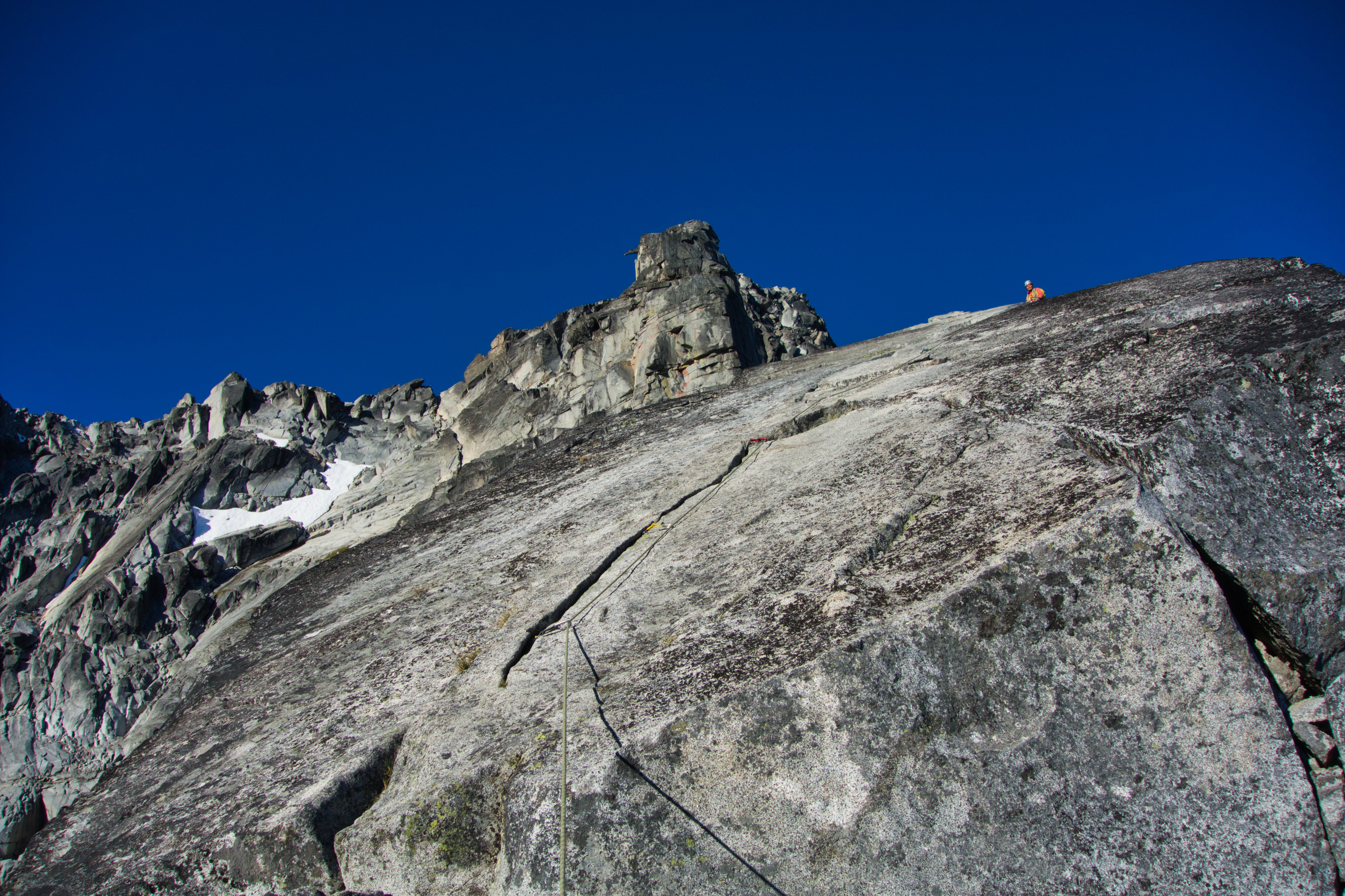 At the base of the hand cracks we roped up again and chose the right hand crack to ascend, and then ran the rope out for 60 meters to some easy third class terrain. From here acrobatic but easy simul-climbing led to the final slab and the summit.