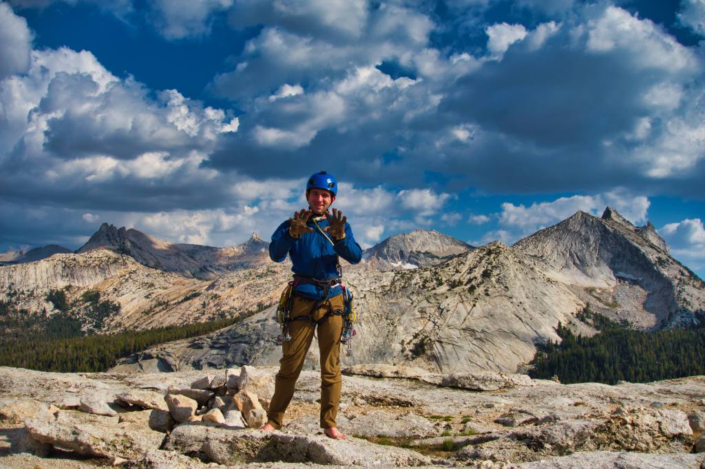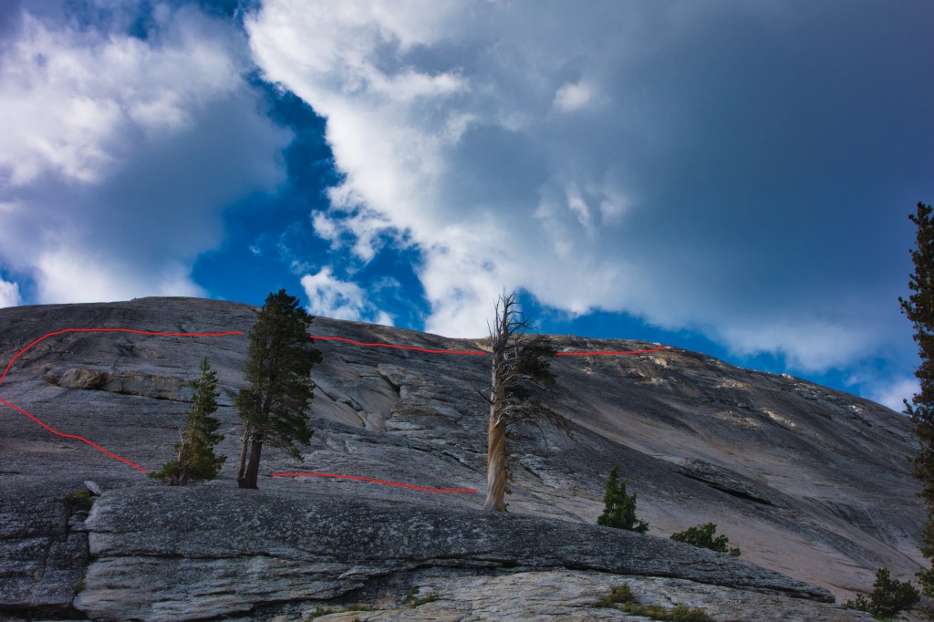 The promised thunderstorms had not appeared, so we continued running up the low fifth for a 70m pitch, and then I quested straight upwards towards the top for another 70m. This wasn’t on route, and the crumbly rock and sparse protection showed it, but it kept it engaging to find my own way on the easier sections. After another tree belay, I traversed left along a ledge and up another 100 feet, topping out on the wide flat dome of Fairview.
