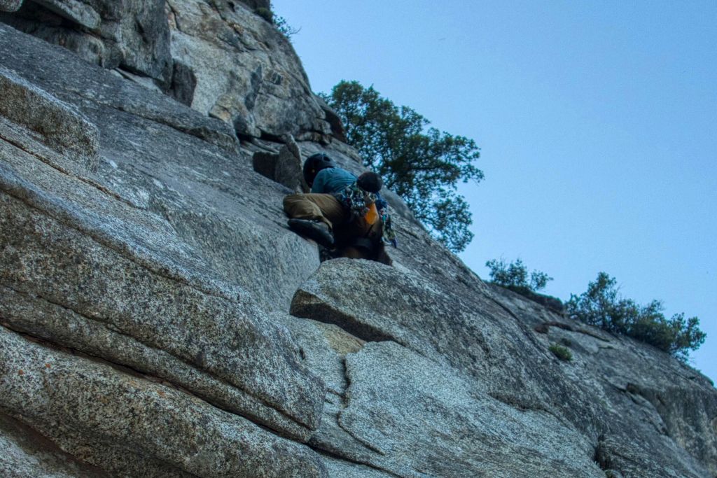 Pitch 4 has some interesting stems and liebacking at the corner and then it eases off, but the last move surprised me. You have just smears for feet and you have to mantle the slab to stand on it. Then Rick did a heel hook to the lip of the belay ledge to get up — because he never trusts trees — but I chose the trees comfort :). We topped out right as it got dark in the valley.