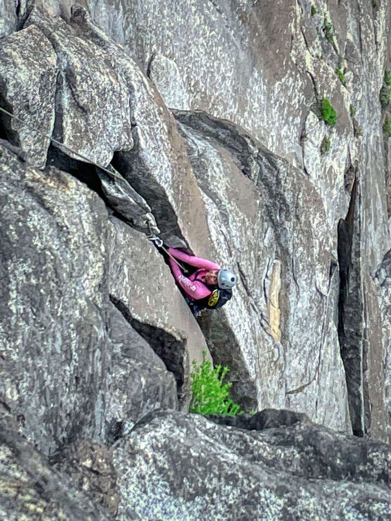 We had planned to simul-climb Munginella (5.6) to get to the base of Selaginella to avoid the wet slabs, but by the time it went into the shade multiple parties were waiting at the base, so we were left with no options but to ascend the wet slab. Rick did it quickly in approach shoes, but I noticed that wet rock shoes slip off like ice which diminished my confidence. I had almost given up on the idea of ascending the wet slab but then I accepted the risk of rolling down to the grassy-rocky ledge and executed the move successfully, phew!!!