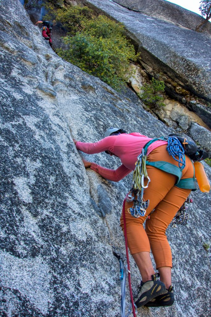 In the picture below the guide is at the pitch 3 anchor while Rick is below the second of the first party on pitch 4. Rick had setup a gear anchor below the roof to give space to the party above us and to not crowd the anchor (Rick: and also to take the only ledge as a vantage point where I could watch the hanging belay passing/rappelling cluster unfold in comfortable amusement). We both managed to avoid a boot to the face from the client going over the roof. The guide started on pitch 5 with Rick trailing around 20 feet behind him. The crux finger crack turned out not to actually be a finger crack (#.75-1), and had frequent larger pods for your feet to make things easier. By this time the first party had started rappelling, so the client decided to wait for them to pass pitch 4 anchors. This meant I had to wait for a long time under the pitch 4 roof. The leader of the party behind us (our friends from Joshua Tree) reached me and she also decided to setup her anchor under the roof because pitch 4 anchors could also be used for rappelling. Then the client started on pitch 5 with me following right behind him. In order to not crowd pitch 5 anchor, I waited for the guide to rappel first.