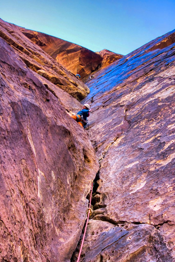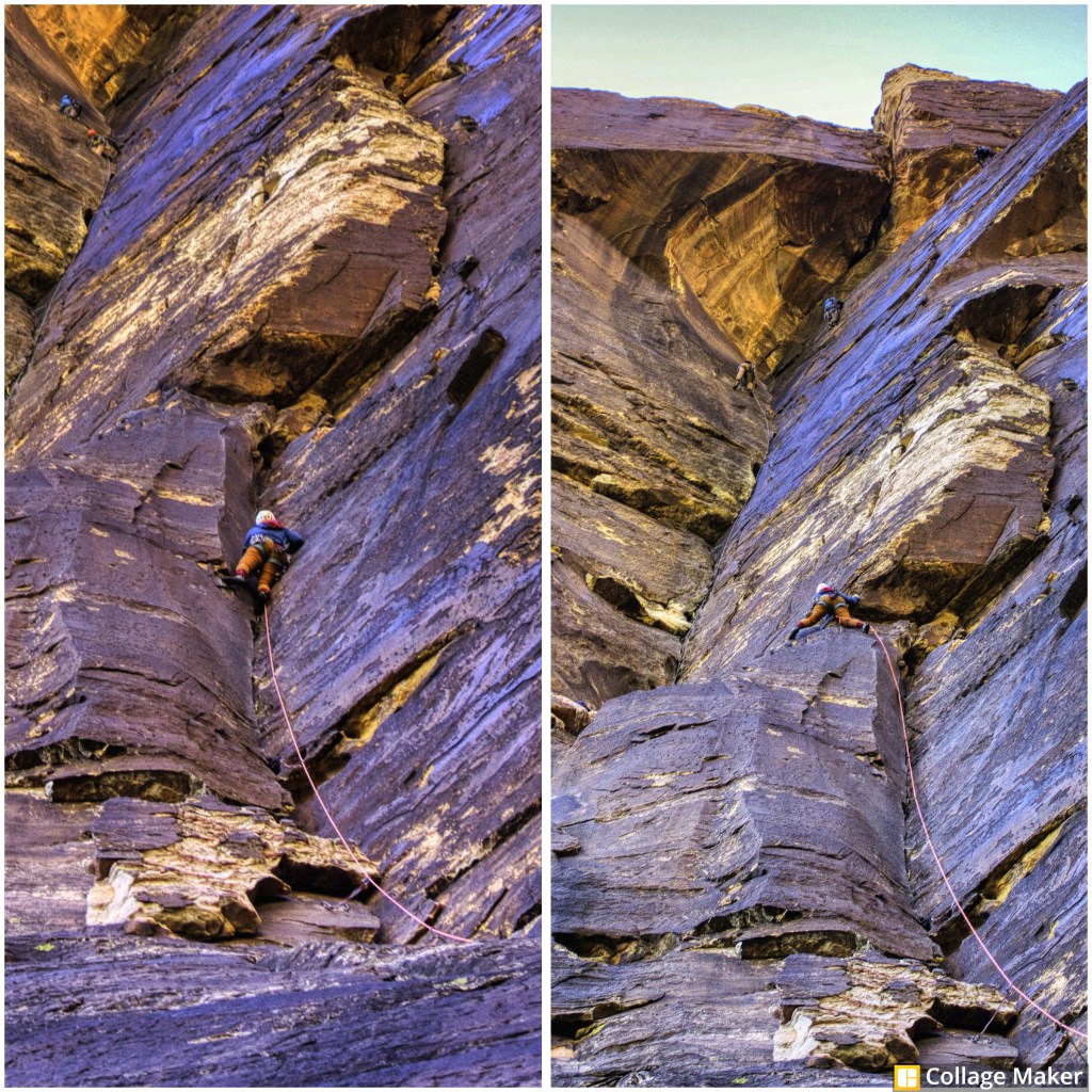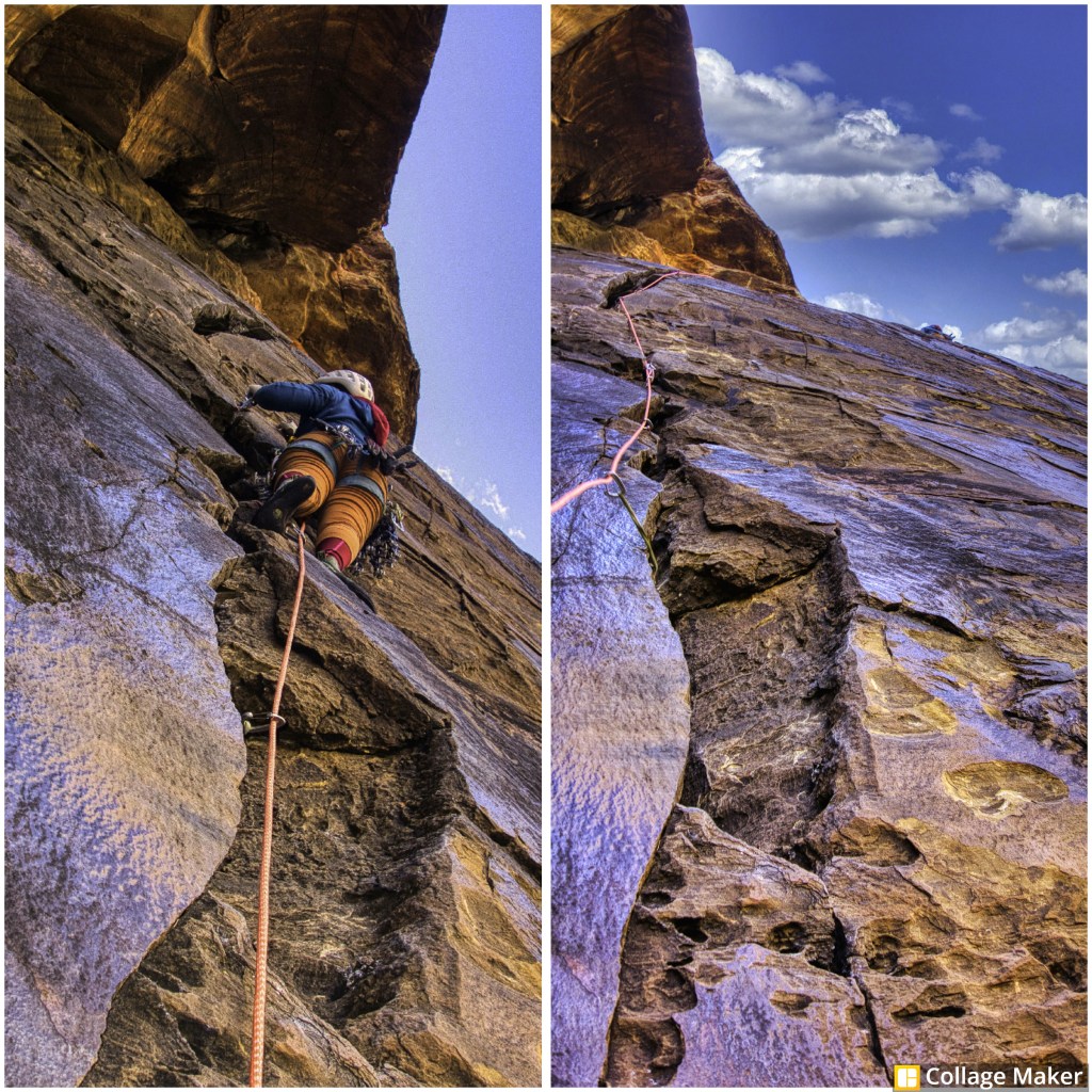 Pitch 4: This pitch is short and quite bouldery. I think the crux of the route was the second offwidth/chimney section visible on the right image. There are crimps to the left of the offwidth which I did not use. I lie backed the whole crack while smearing on a couple thin edges on the varnish on the right wall. That was scary but I had very good pro and it would have been clean fall which is a far superior situation than the final pitch of Frogland. Keep traversing right to the lower anchor if you have a 60 m rope to rappel. The upper anchors will work with a 70m.