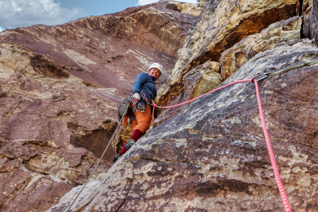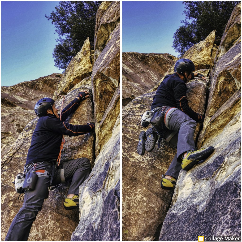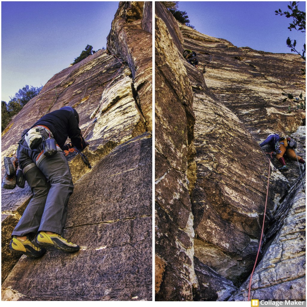 Pitch 4 (left) I am figuring out bouldery moves as there is only one left foot jam in the thin crack and two crimps for hands and a high right foot on to a smear. My last pro is in the far right crack. (Right) Mark following pitch 4. Pitch 4 anchor was very tricky. There is no crack at the base of pitch 5 so the climber needs to go a little bit up on the left and needs #.75s and #1s to build an anchor. I did not have the ideal pieces to make an anchor so I got creative and built an equalized anchor with #1, .#75 and #.5 and a quad. You then have to down climb to the ledge for a comfortable belay.