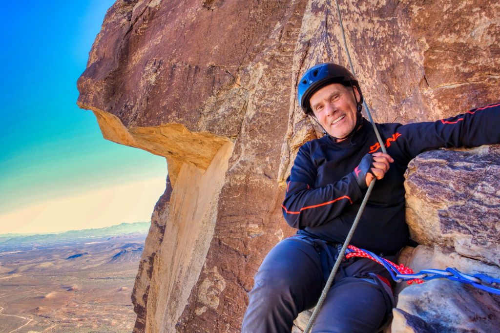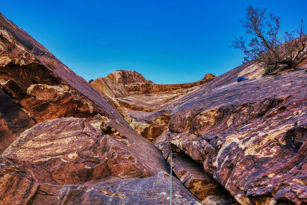 Rick block led MysterZ in three pitches so I decided to lead all of Frogland, belaying a 63-year-old strong but novice climber (Mark) and my wall bunny Rick on two separate ropes. Getting to the parking lot of Black Velvet Canyon certainly requires a 4×4 because of the super tricky off-road section for about 3 miles. We started hiking from the parking lot of Black Velvet Canyon at 6:42am. The hike to the base of Frogland took us 70 minutes for 1.01 miles with 672 feet of elevation gain. It was an exceptionally warm day and therefore there were many climbers in the Black Velvet Canyon. We were the first ones on the base of Frogland but two other parties arrived shortly after us. Looking at our two ropes they decided to take the alternate start. The party of two disappeared after the top of pitch 1 but the Russian climbers (party of three) stayed with us until the top of pitch 3. We started climbing at 8am but had to wait about 45 minutes on the top of pitch 1 to let these two parties pass.