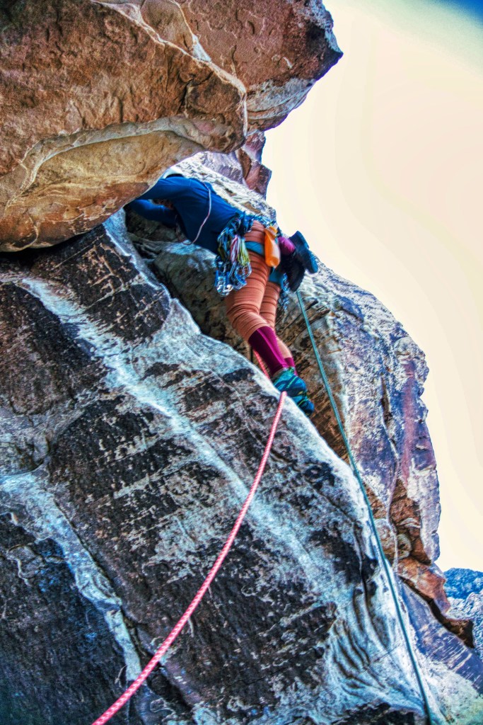 Pitch 2: Top – I protected the right crack and used a double length runner before the flake, then climbed the face of the flake. Bottom – Mark right below the flake on the orange rope and the green rope goes to Rick. Pitch 2 ends at the tree.
