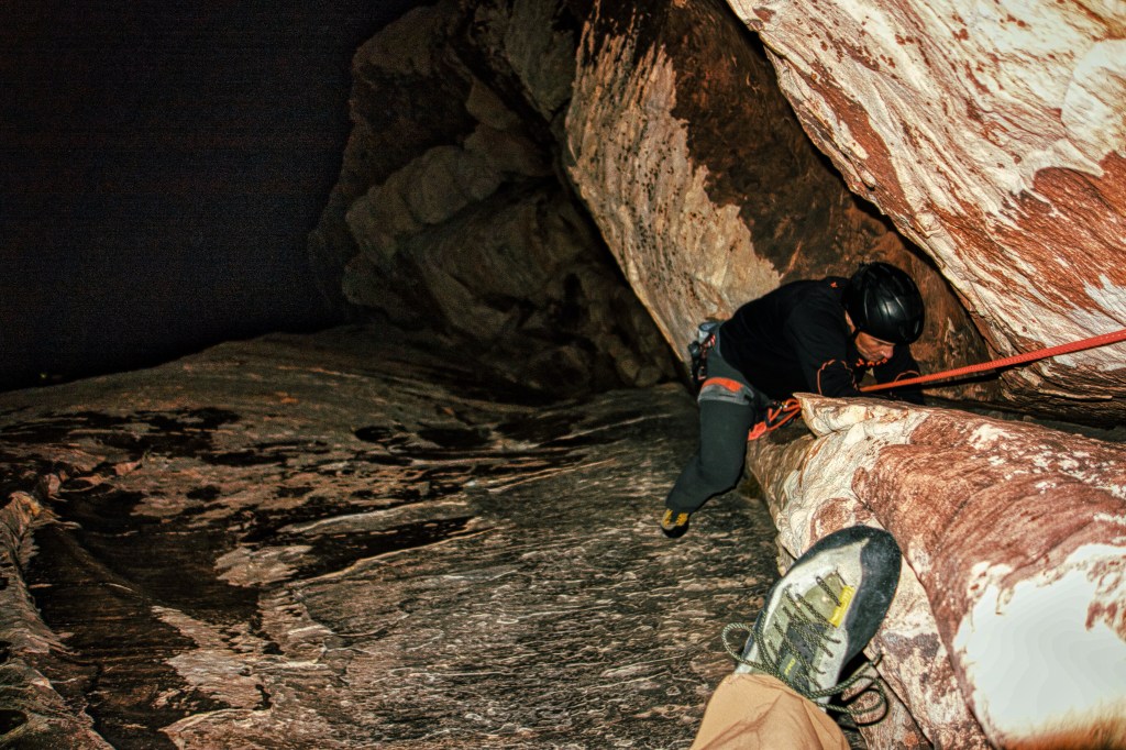 Mark climbing the last sections of our variation of pitch 6. Due to horrendous rope drag on the orange rope, I could not pull it and so Rick tied him in short. Rick and Mark made it work with one headlamp and we all topped out safely. Mark lived to experience his 63 birthday :). I realized that I had 0 calories since I woke up but I know we eat significantly less when we are out in the wild.
