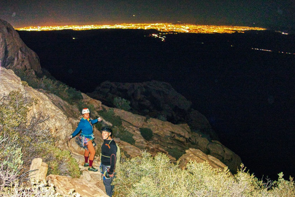 Bright Vegas as seen during the descent: The descent route is very well marked with carins every few feet. Our packs and remaining headlamps were at the base of frogland so a little bit after this point in this picture we split up: 1) Mark and I went right towards the parking lot on a well-trod trail with Rick’s phone for flashlight 2) Rick went left cross-country to collect our packs which were mostly empty with the bright headlamp. Rick said to not get lost in the desert so I was assessing the trail at every step of the way and finding boot prints. We got to the end of the trail and tracked Rick’s headlamp who arrived after 30 minutes. On the way back we ordered mouthwateringly delicious Thai food from Chinatown and a bought a wine bottle. We toasted and celebrated Mark’s 63 birthday at 9:30pm in the hotel room. I was extremely happy that we all safely made it back.