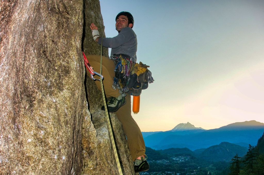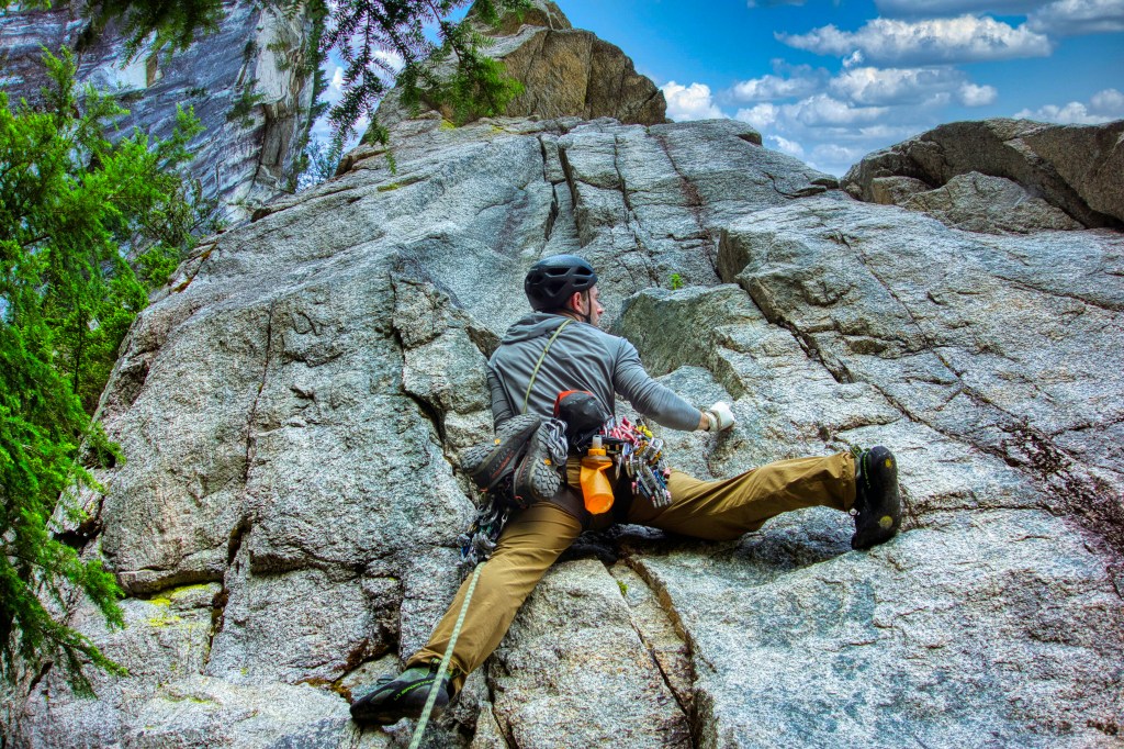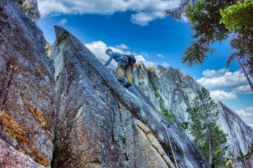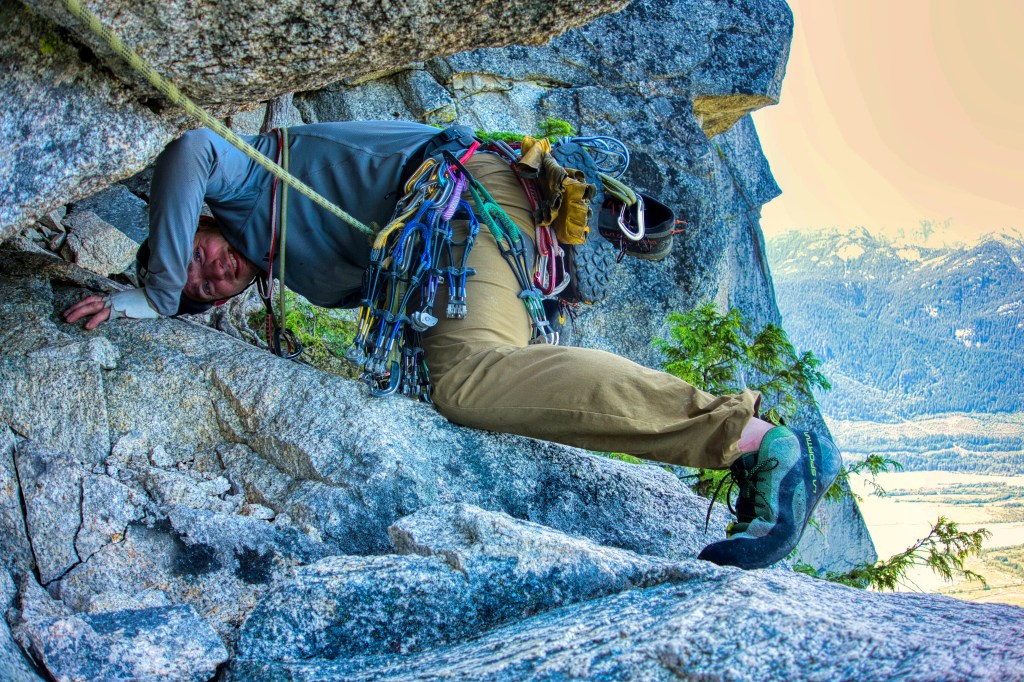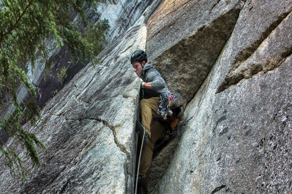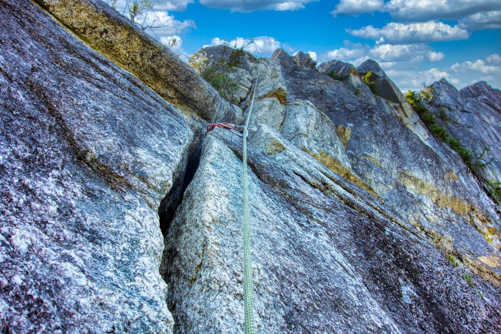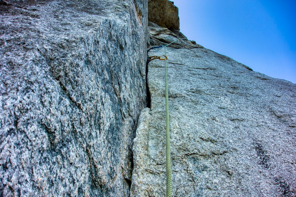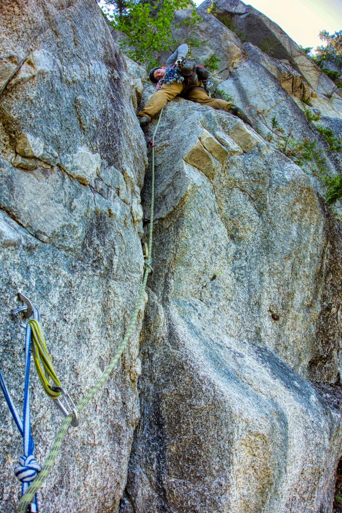 Pitch 1 (after the initial slab segment): This section may look benign, but it’s a vertical pile of awkwardness! You can protect it with a totem, .3, and .4 cam, in addition to clipping a bolt down low and another bolt at the top. It’s like the climb’s way of saying, “Don’t let your guard down just yet!”