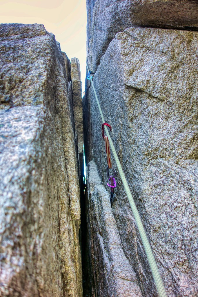 Pitch 8 (5.9): The 5.10b #7/#8 offwidth looks very attractive but requires hauling the big bros. This picture is the start of the 5.9 slanting corner crack with totem .3 and .5 as the first cams and rest of the crack tackes finger pieces. I really enjoyed this pitch.