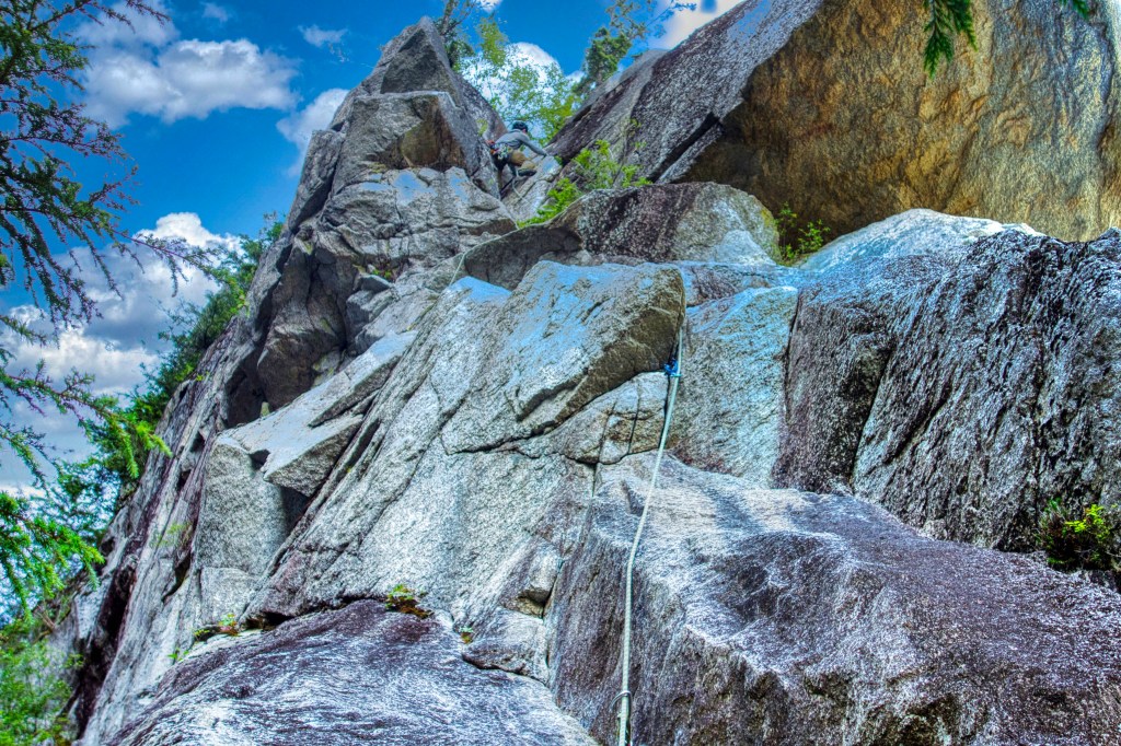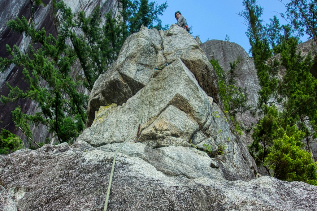 Pitch 3 (5.10b): It’s wise to start Pitch 3 a bit lower left of the bolted anchors where there’s a nice hand crack. Once you reach the ledge where Rick is standing, you’ll find one bolt at his shoulder level and another further up. For me, the crux of the entire Angel’s Crest is in the section between these two bolts. I haven’t sport climbed in over a year, and the ~4.5 kg of weight was not helping either. This is where we started linking pitches; link P3 and P4 (5.6).