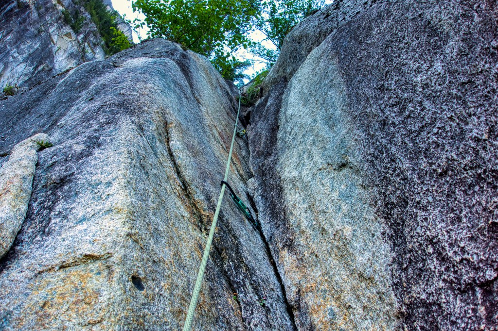 Pitch 1 (10b): This is a mixed climbing pitch with three bolts on the initial slab section and more bolts on another slab section that leads to a large ledge directly below Angel’s Crack. Clipping the second and third bolts (the first one is seen in this picture) requires some very tenuous moves, providing an intense start to the climb. It’s like the climb’s way of saying, “Welcome, let’s see what you’ve got!”