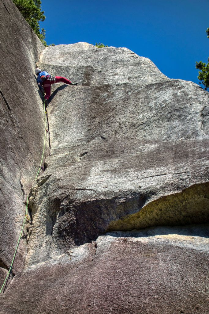 Diedre has three completely run-out pitches: P1, P2, and P6. P3 and P4 offer some good protection but involve repetitive layback movements. P5’s gear is sketchy. Overall, this climb is best suited for a confident leader who climbs higher grades and has plenty of slab experience. The white slab sections near the crack are slippery, making this entire climb a no-fall zone. I carried triples for finger size cams (since I am not a nut person) where were useful for pitch 3 and 4 only.