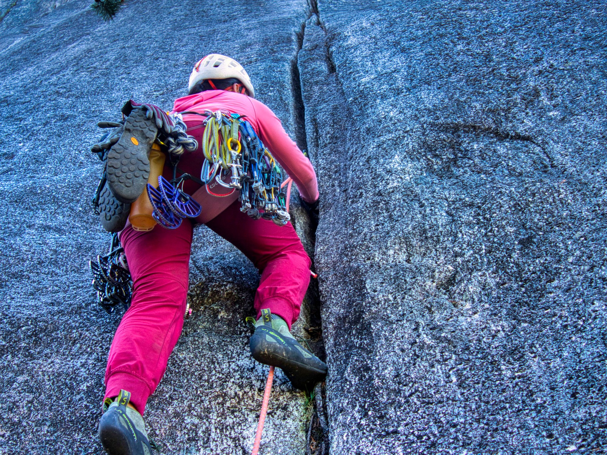 Leading this pitch was a blast! I placed two #3s, two #4s, a #2, two #1s, two .75s, and a .5. For the offwidth section, my usual techniques like double fists and fat butterfly didn’t work, so I resorted to side pulls, heel-toes, knee jams, arm bars, and double gastons.