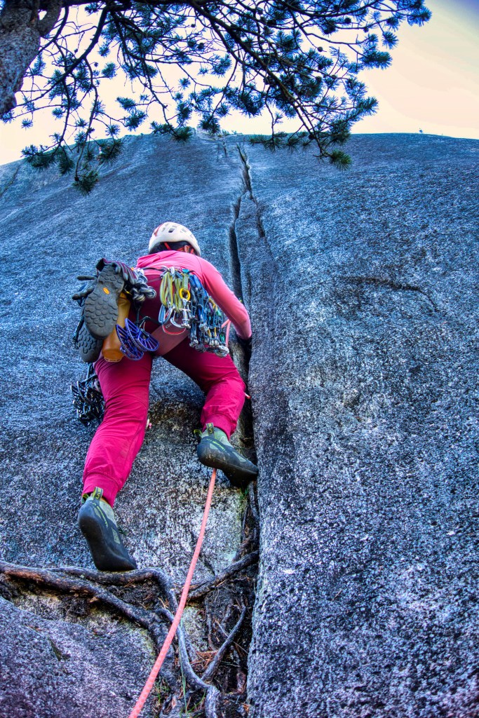 Pitch 2 St. Bernard (5.9, 30m): Pitch 1 (5.7, 5.8, 30 ish m) of St. Vitus’ Dance is pretty straightforward—a hand-sized crack that takes you to a big ledge with a tree for belaying. When I got there, I spotted this beautiful line. Unbeknownst to me, it was St. Bernard, not our planned route. We aimed for St. Vitus’ Direct (5.10a, 23m) to the right of this crack.