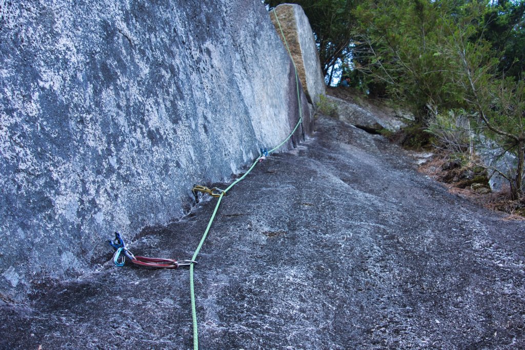 P1&P2 (5.7, 5.10a, 70m) : Rick linked the first two pitches for efficiency—but paid the price in rope drag right before the 5.10a mantle (visible in the third pic). First pro visible in this picture is a .75 Totem, followed by a solid lineup of hand-sized gear. I remember this pitch felt a bit slick last year but it was fine this time.