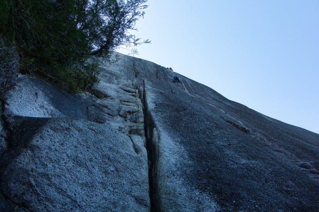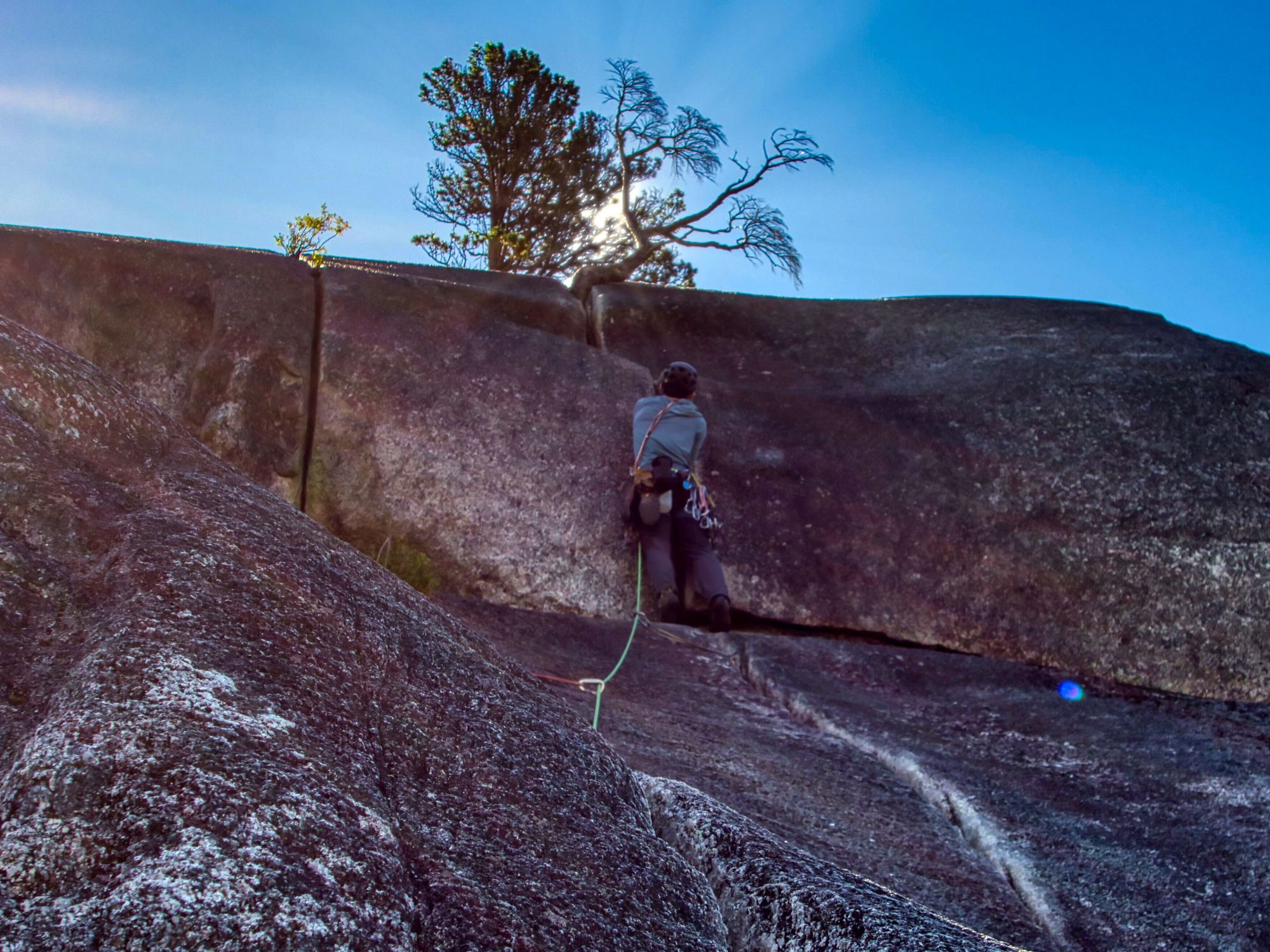 P4 (5.9, possibly 35m): Interesting traverses to the right, then hand jams to a easy chimney.