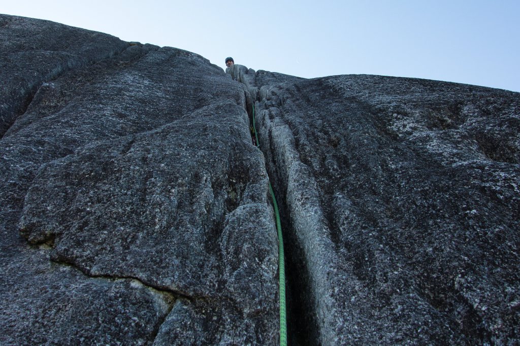 P2 St. Vitus’s Direct, 5.10a: Closeup shot of the thin crack section. Steeper than it looks here.