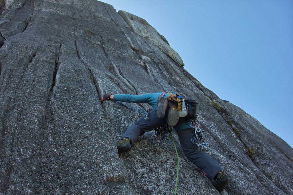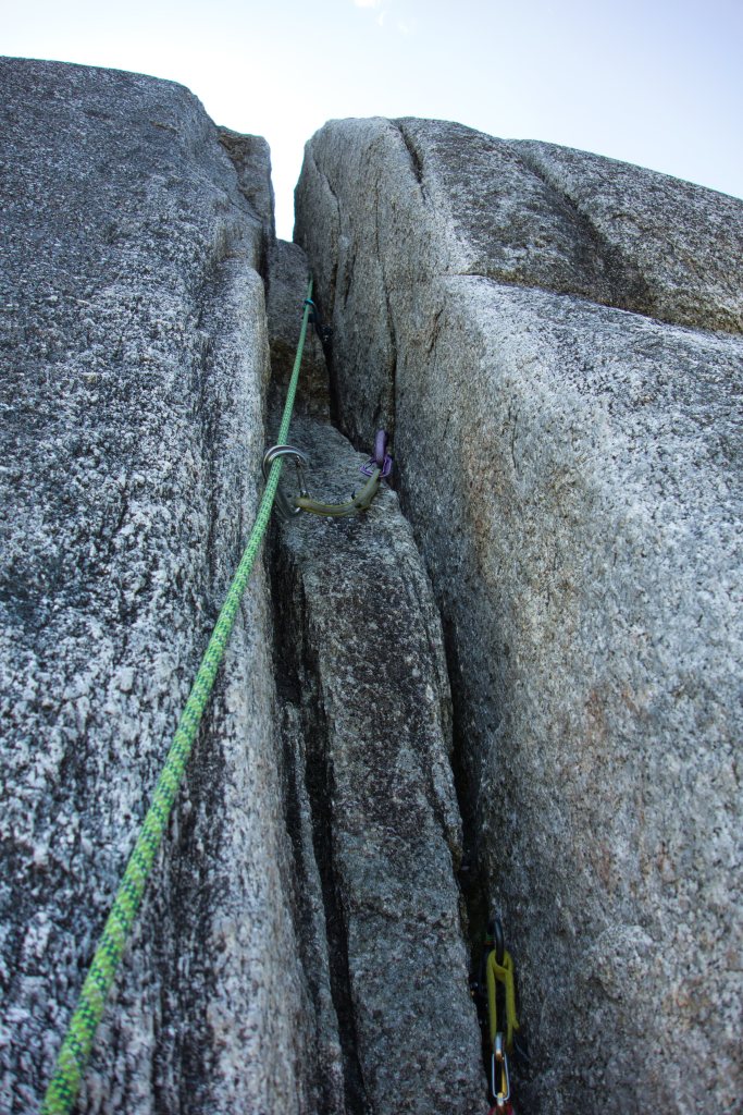P3 (5.9, 40m): The previous party started on this crack and then traversed right. We opted for the direct line on the right. Its an easy scramble to the first good pro.